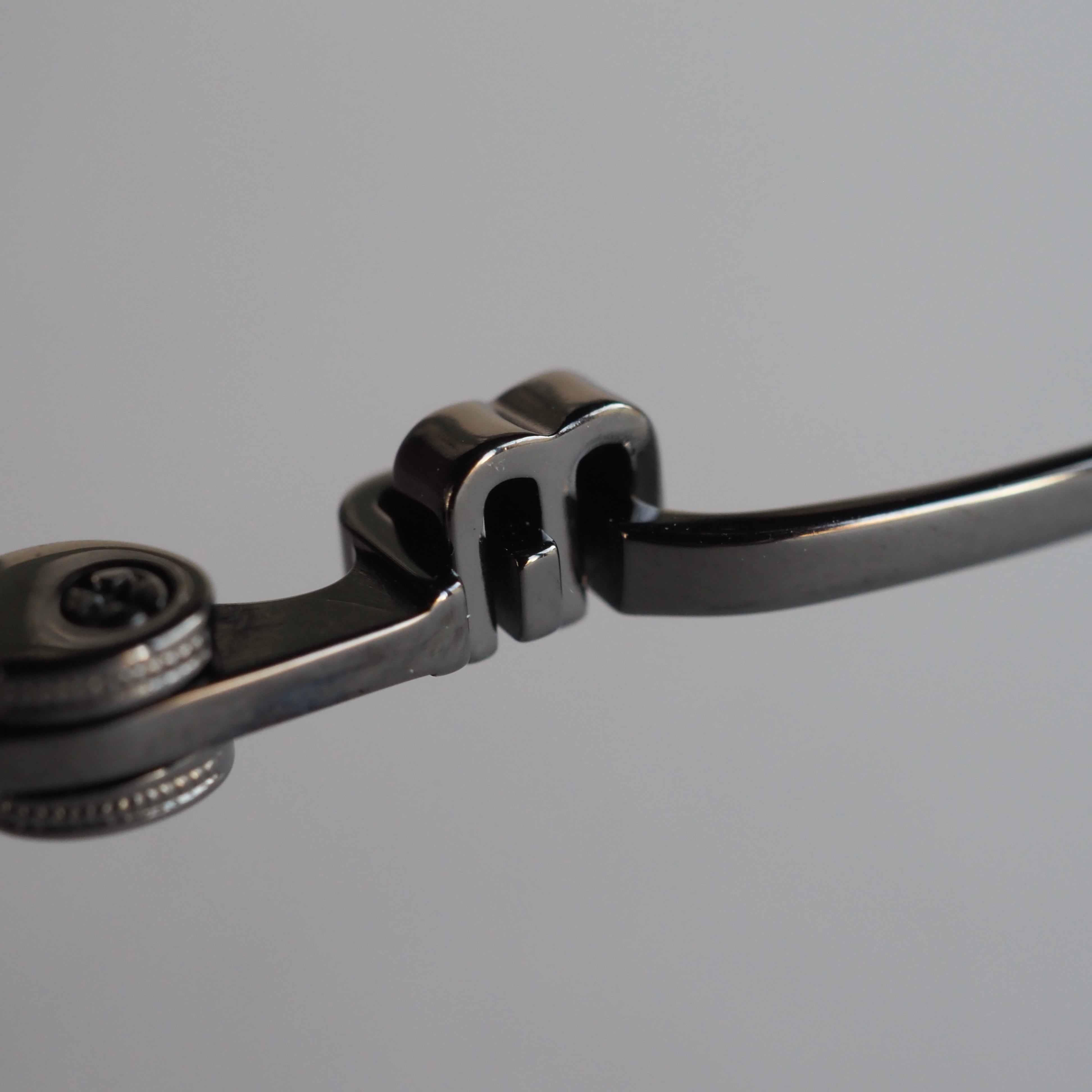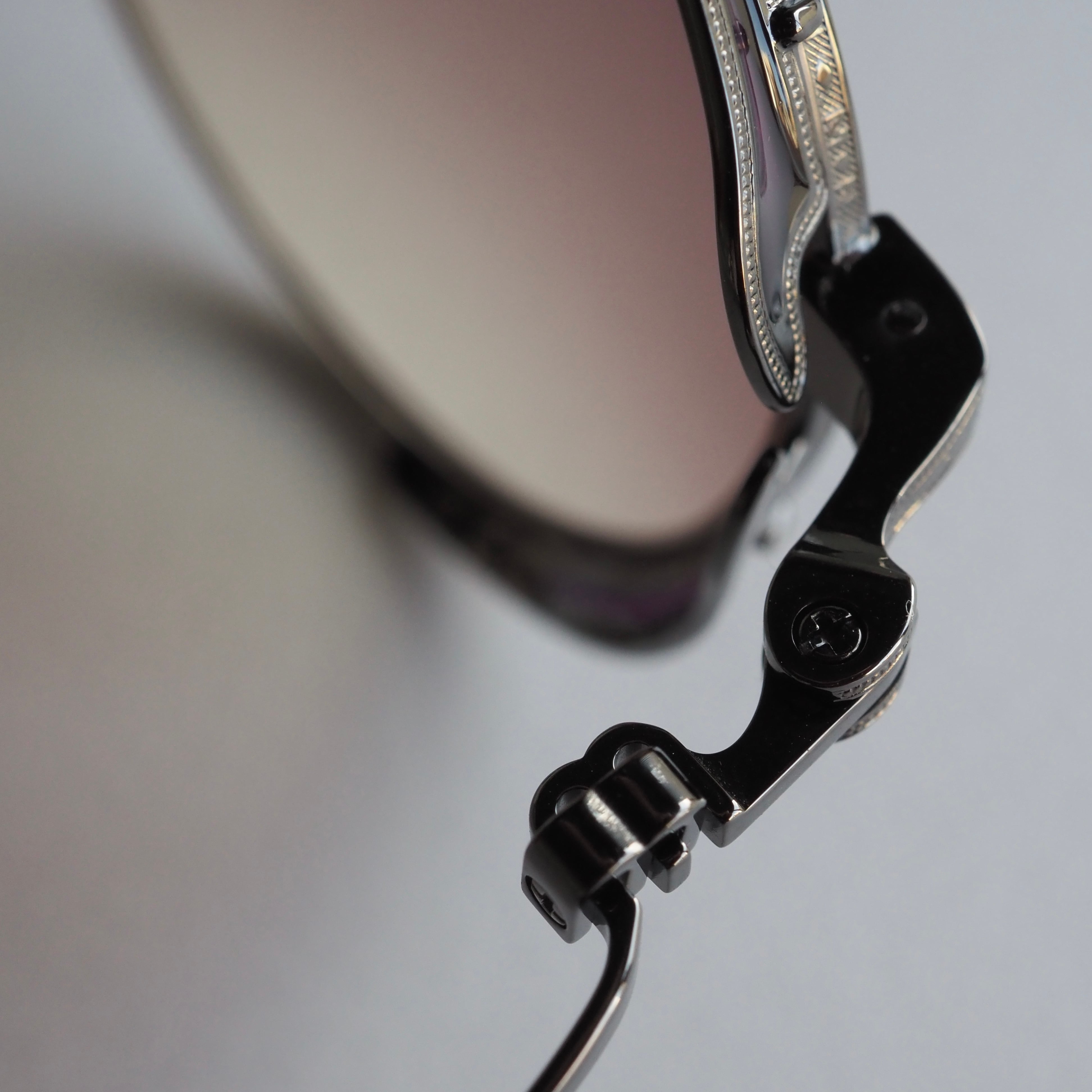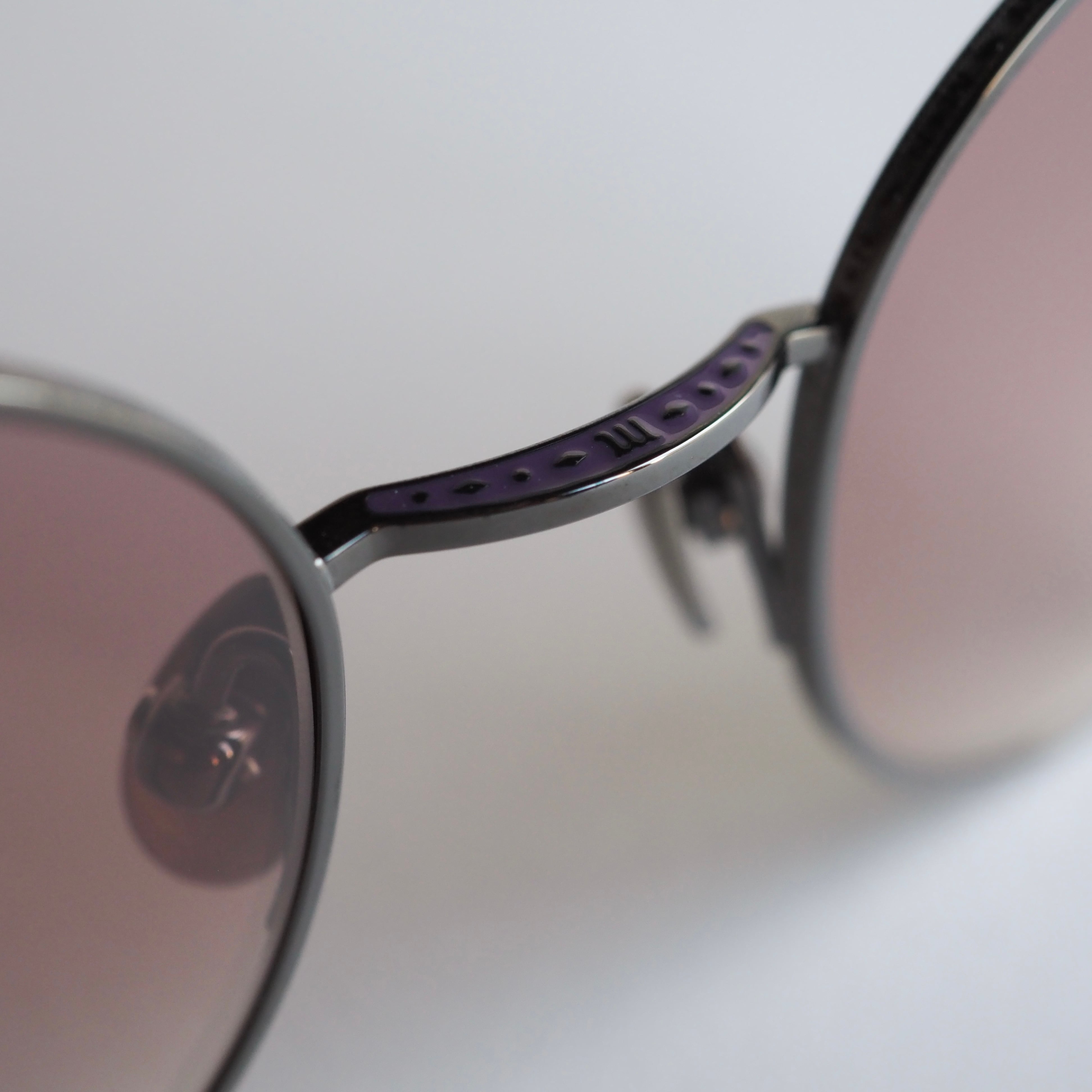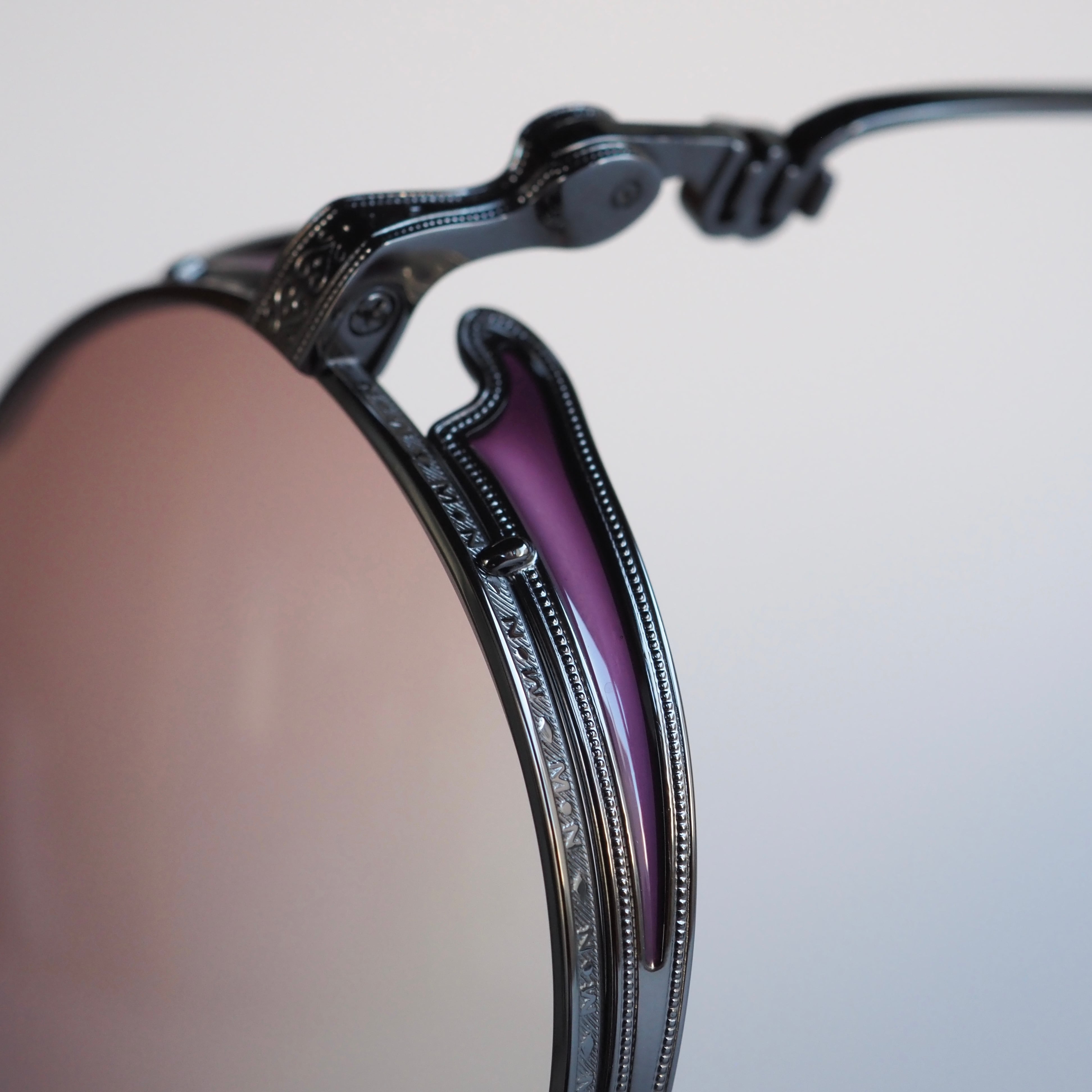 ルテニウムブラックのメタルを基調にしながら、風防・テンプルエンド・ブリッジ上部にはそれぞれ深いパープルの七宝塗りが施され、落ち着きのある高級感を演出しています。