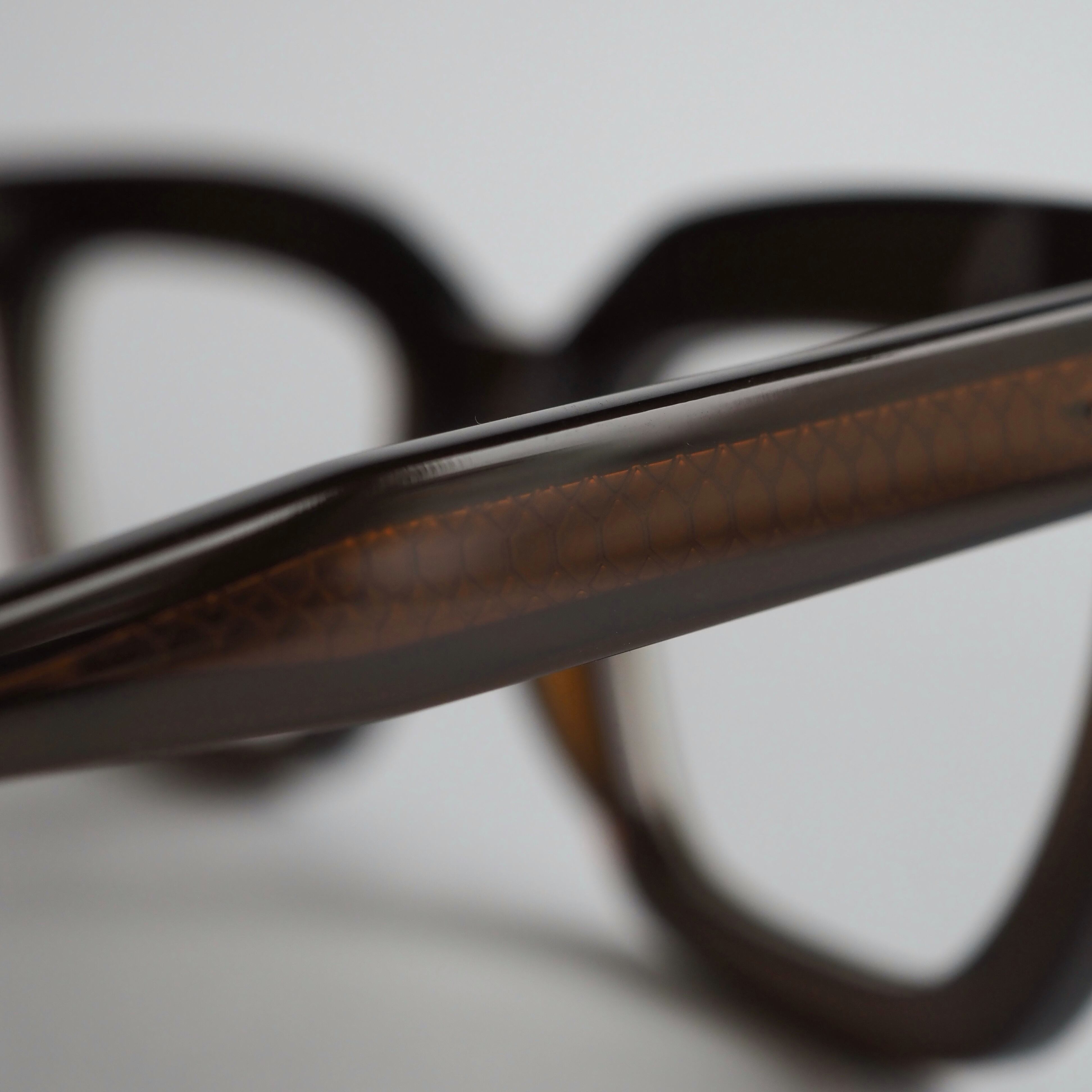 パイソン柄の彫金が覗くホワイトゴールドの芯が見えるデザインになっており、ダスティピンクのアセテートと相まって上品さが際立ちます。