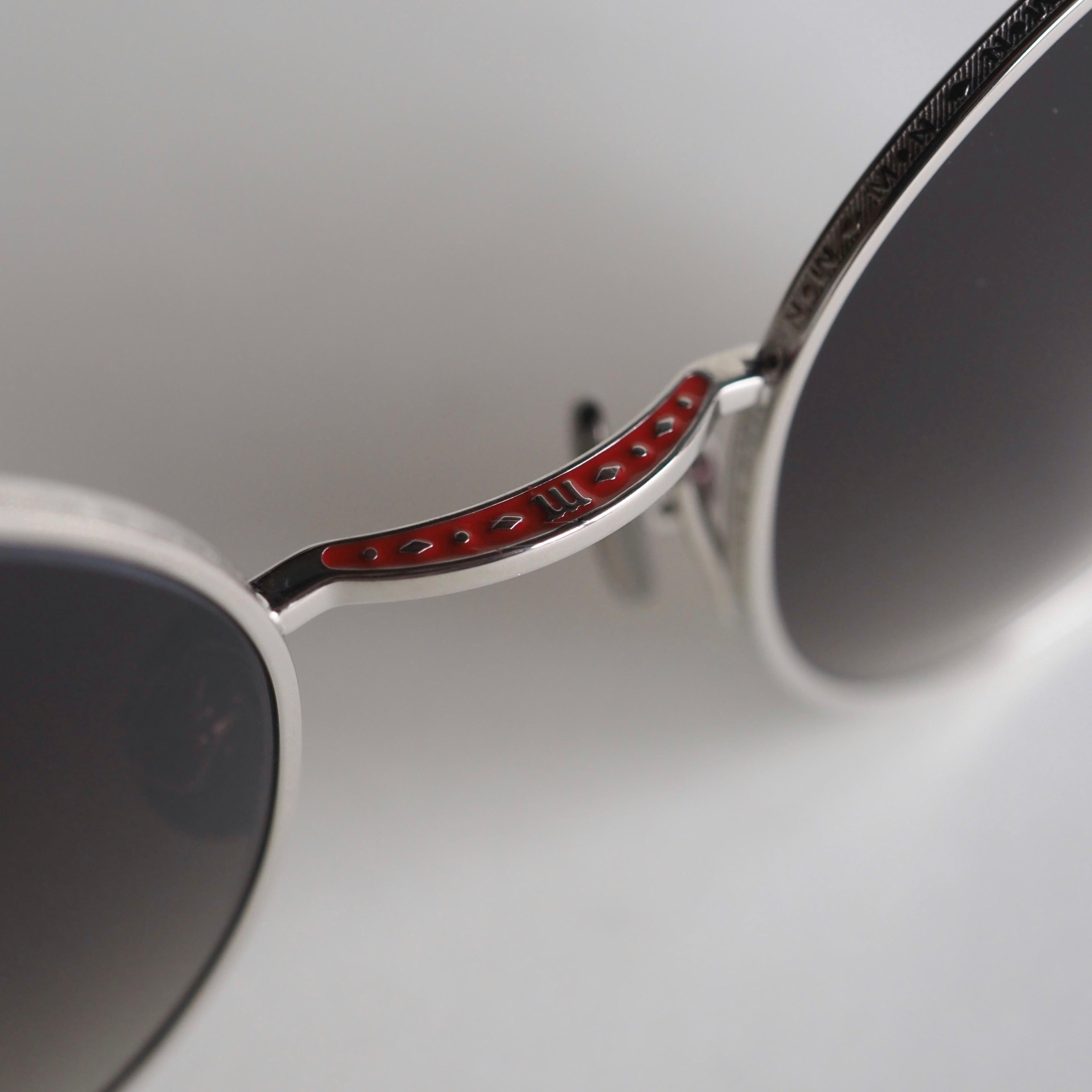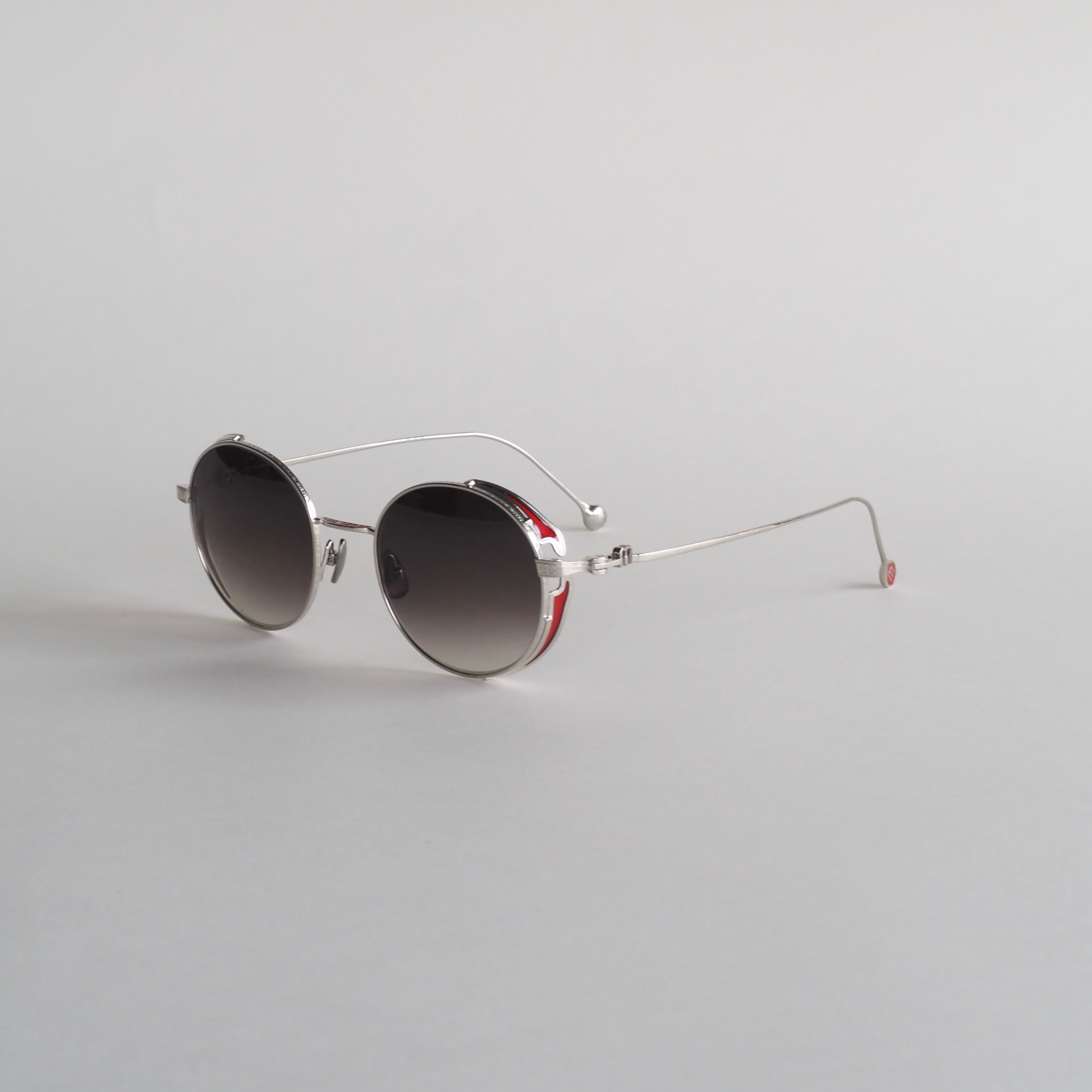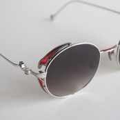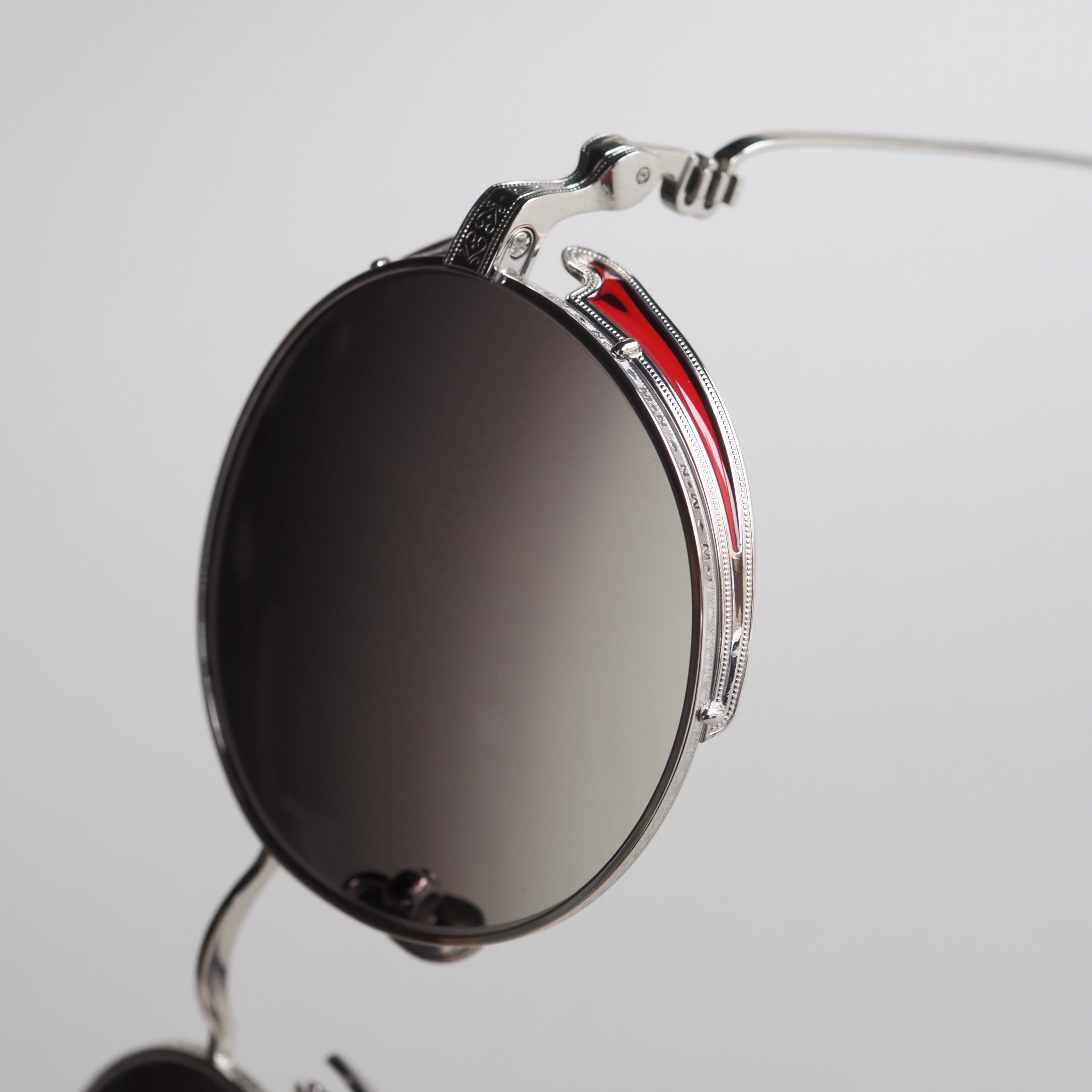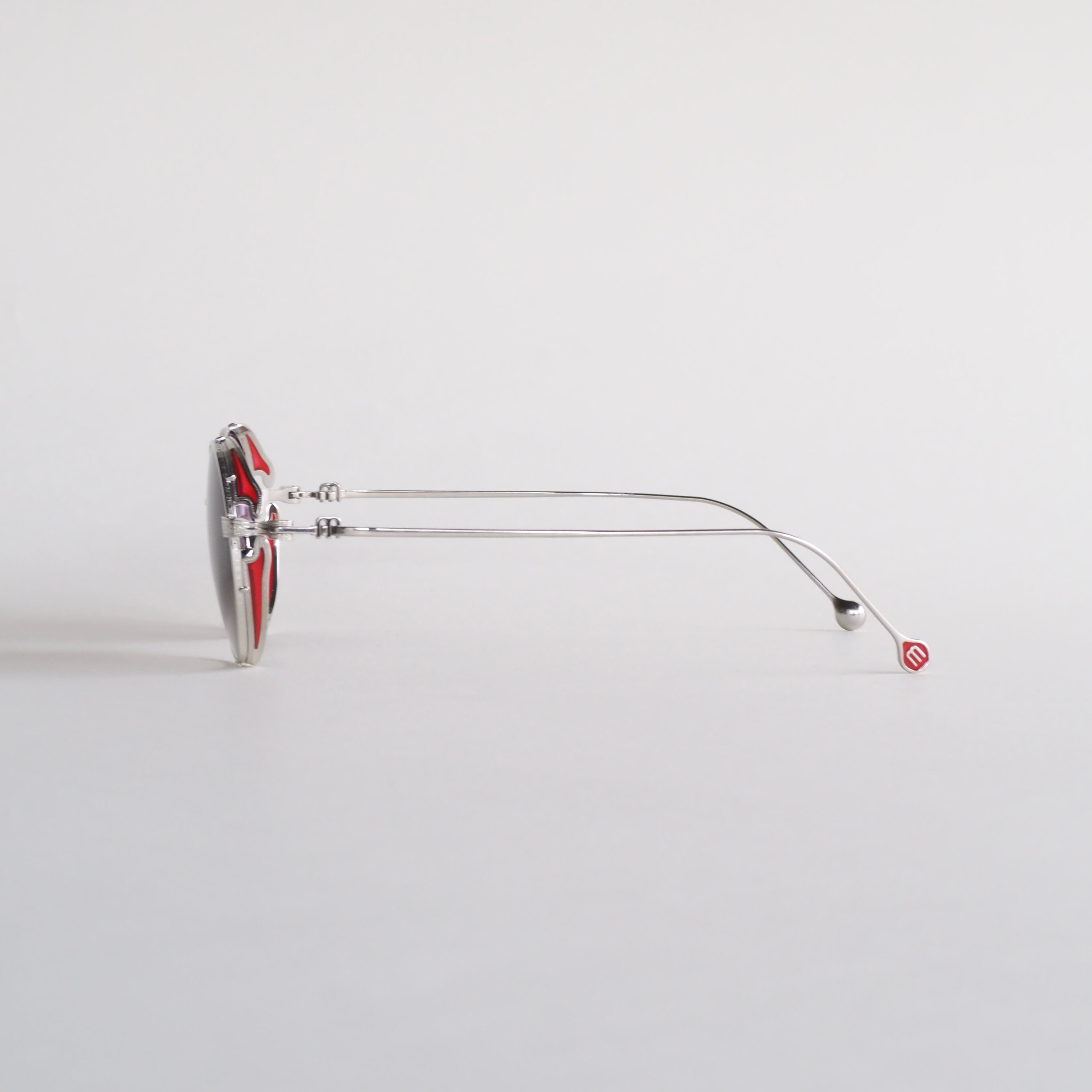 静かな輝きを放つシルバーフレームをベースに、風防・テンプルエンド・ブリッジ上部にはそれぞれ色鮮やかな赤橙色の七宝塗りが施され、落ち着きのある高級感を放っています。