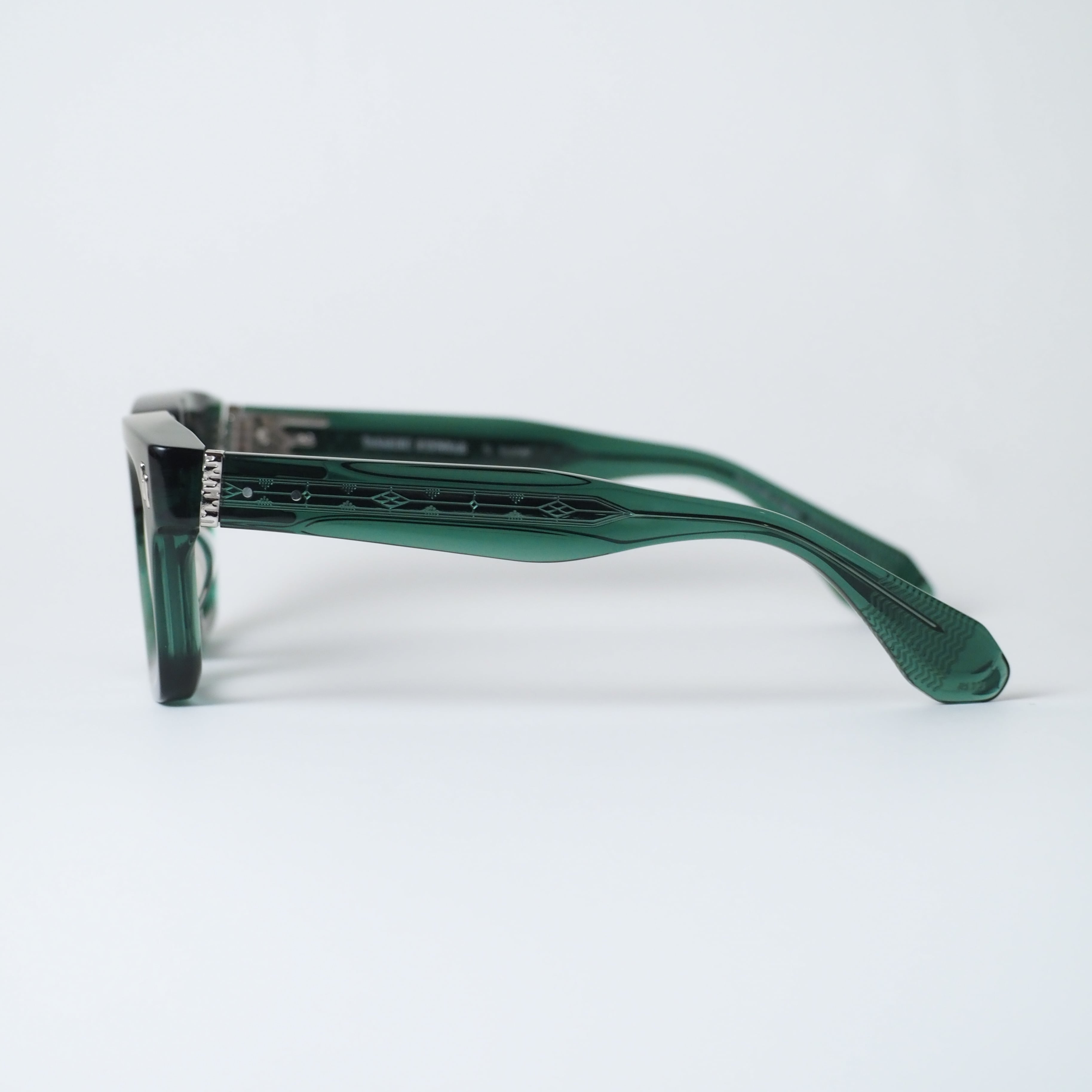 フレームはタフな外観と優しい装着感を両立し、7枚蝶番や霞の紋様リベットなど細部にまで工芸的こだわりが宿ります。