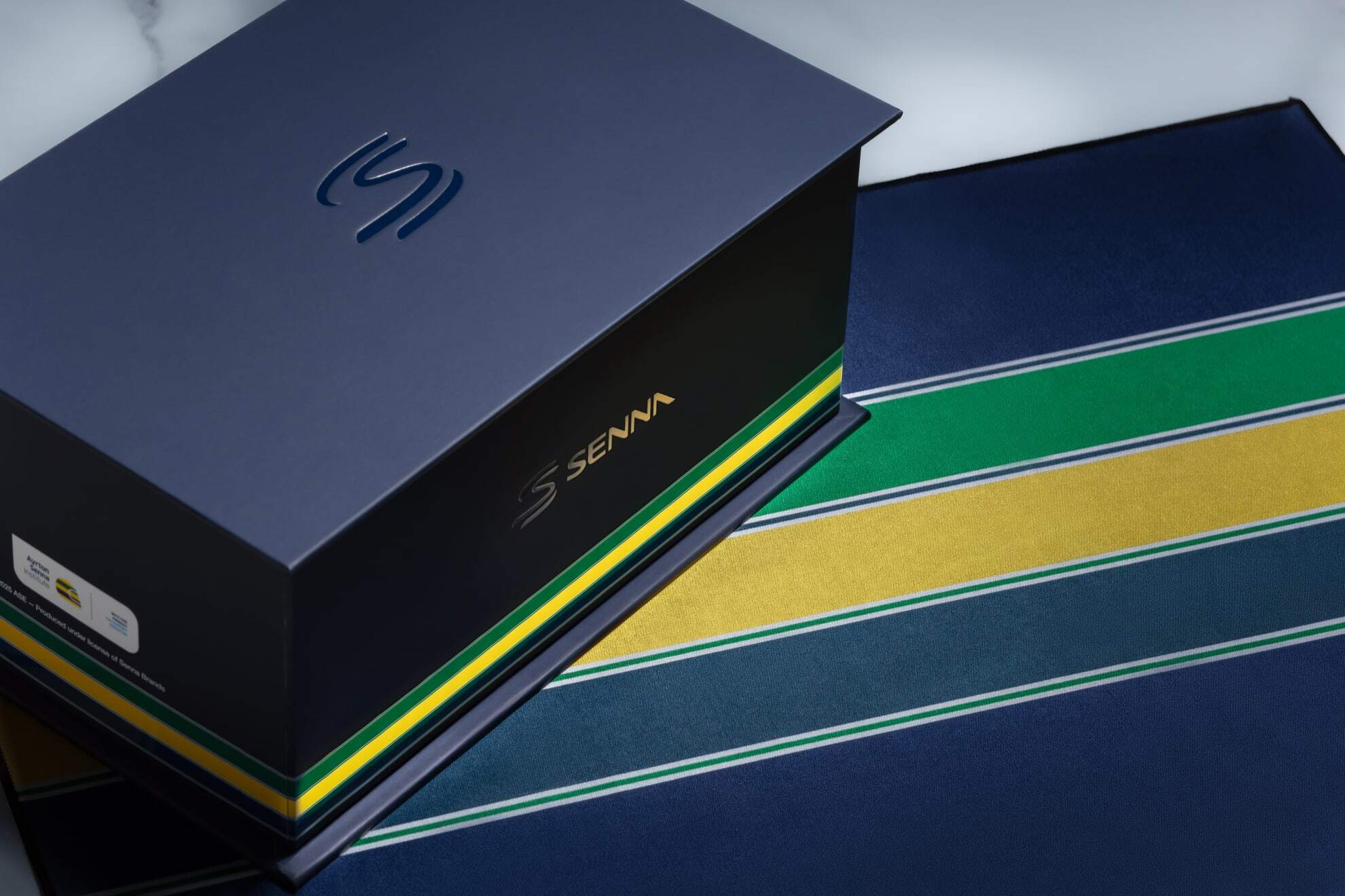 セナの象徴的なヘルメットデザインに着想を得たカラーとグラフィックを採用したブルーキャンバスの限定ボックスに収められています。