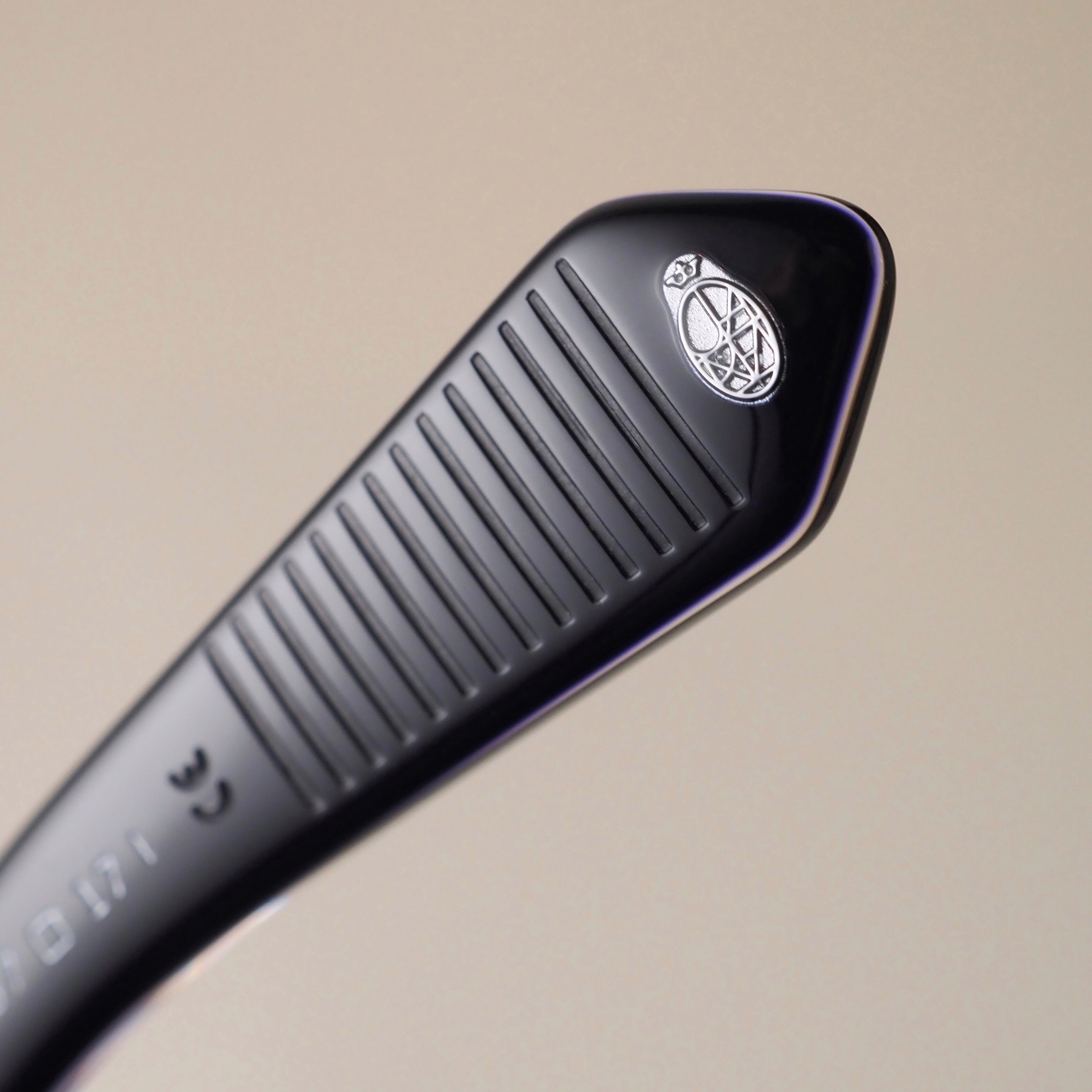 貴金属を使用したアローヘッド(矢じり)型のエンドピース装飾、カスタムの5バレルモノブロックヒンジ、そして繊細なヘアライン仕上げを施したシグネチャーのテンプルワイヤーコアを備えています。