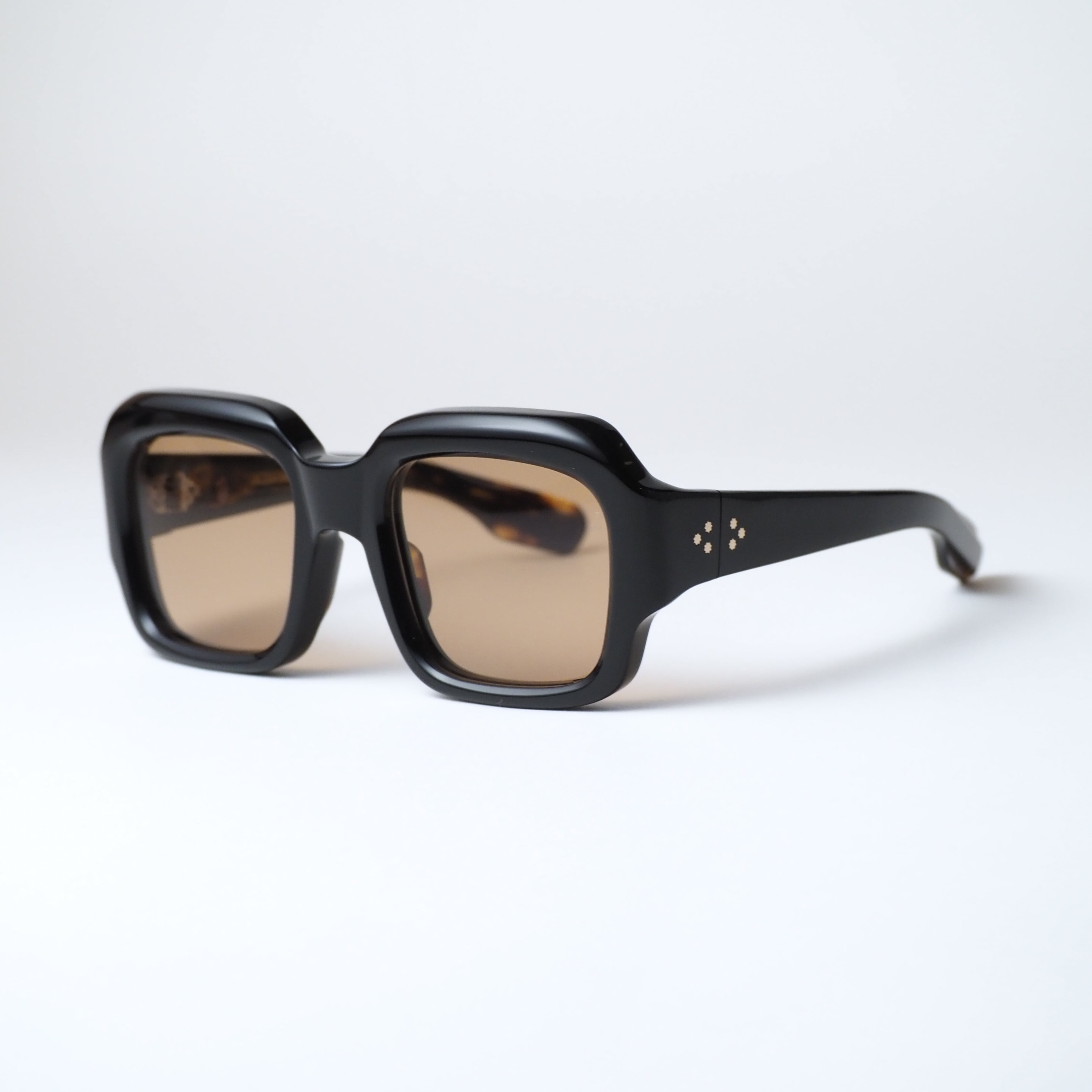 ポリッシュブラックの植物由来アセテートを使用したフレームに、カスタムの二重ラミネートテンプル、セピアカラーのレンズ、そして18Kダークゴールドで仕上げたメタルパーツを組み合わせています。