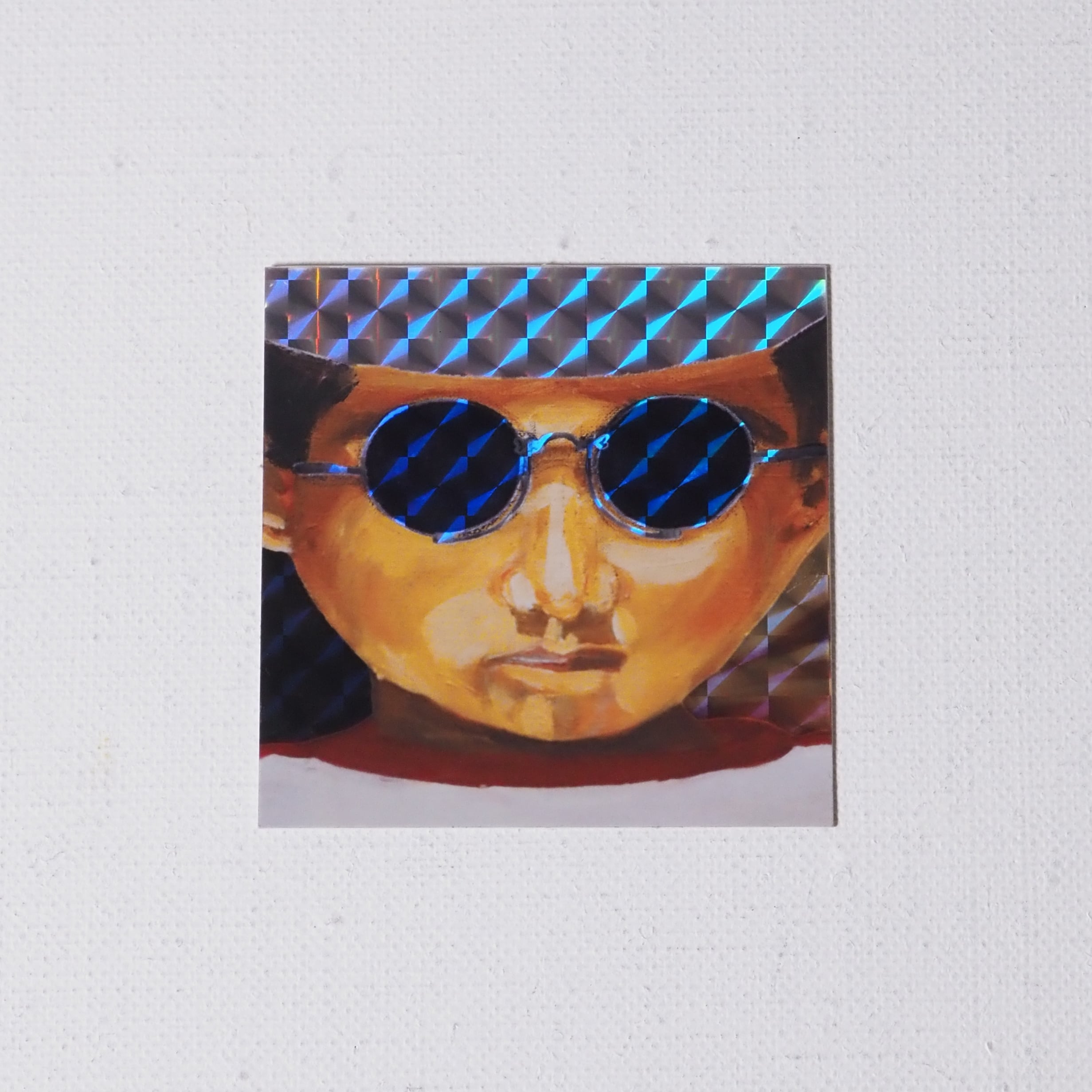 MATSUDAを象徴するモデル"10601H"を着用した男性のホログラムステッカー。
