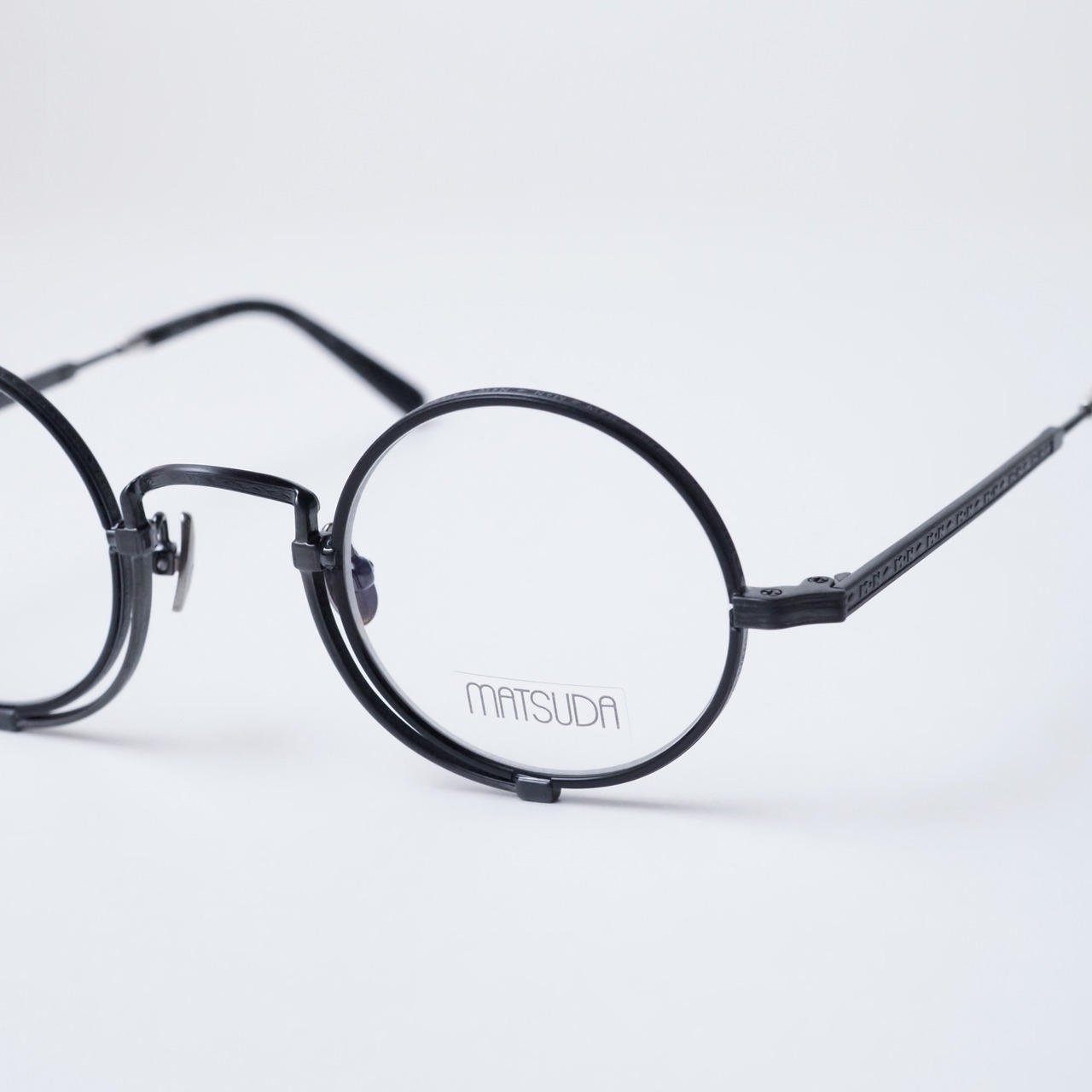 テンプルやリム、ブリッジに至るまで、メタルパーツの随所にはMATSUDAならではの緻密な彫金が施され、工芸品のような存在感を放ちます。