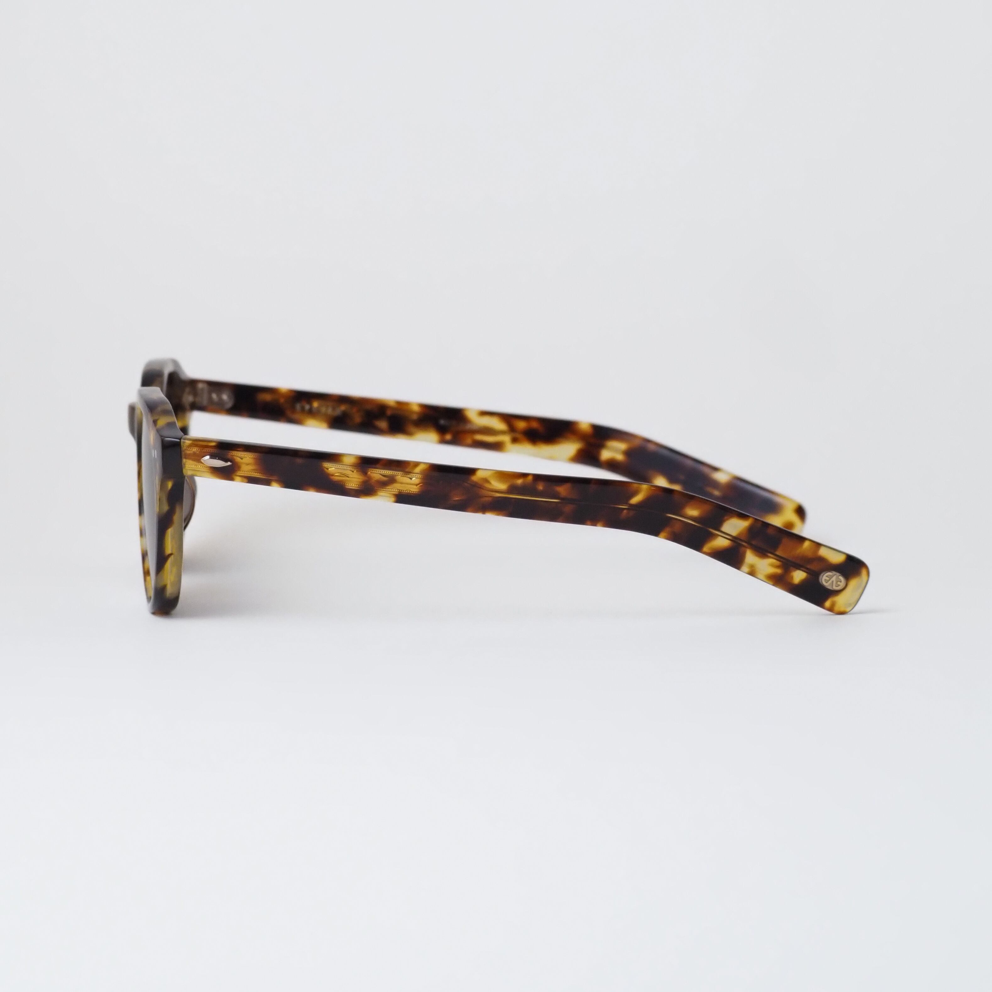 べっ甲調の生地に落ち着いたトーンのレンズを合わせた配色。クラシックでありながら、どこか色気を感じさせる仕上がりです。