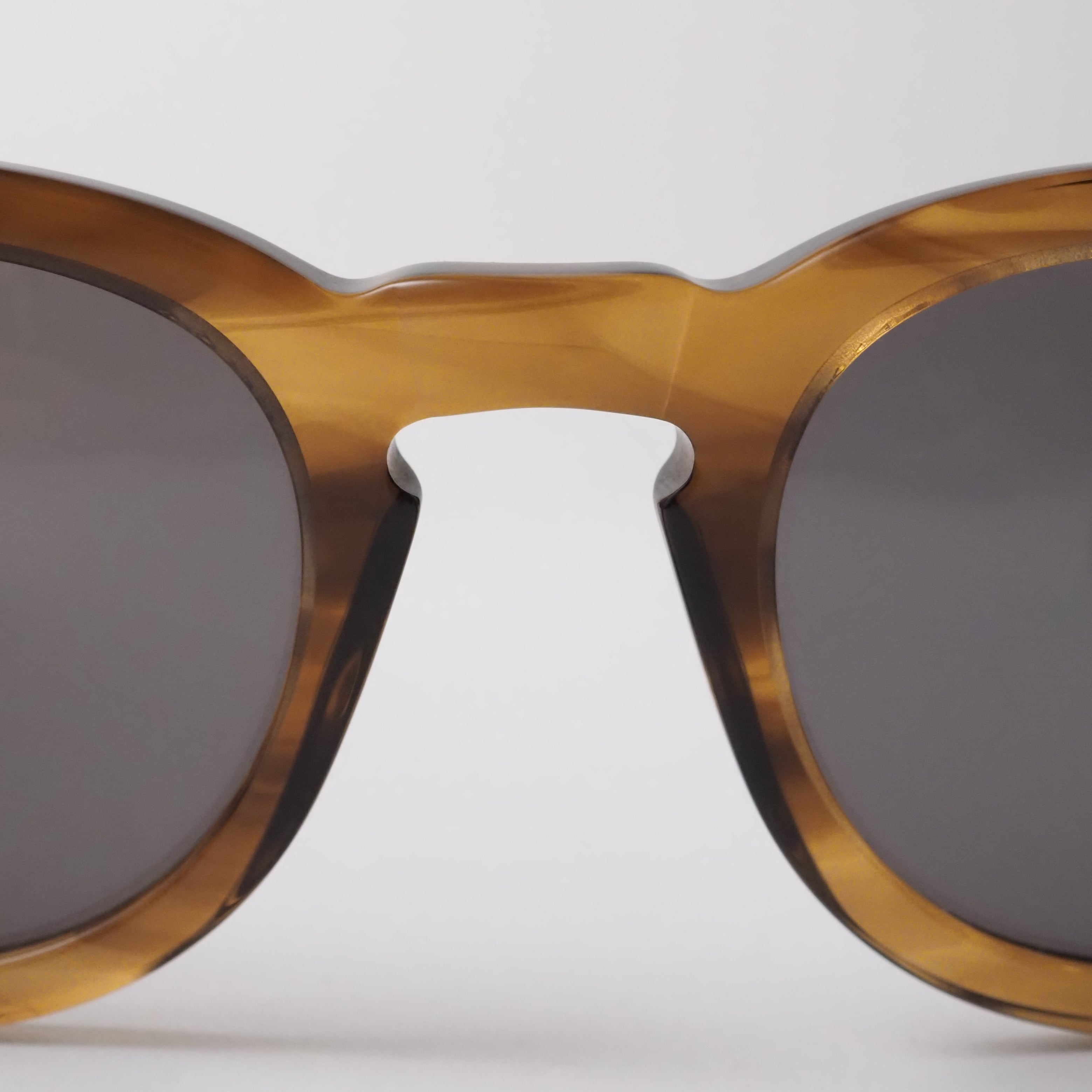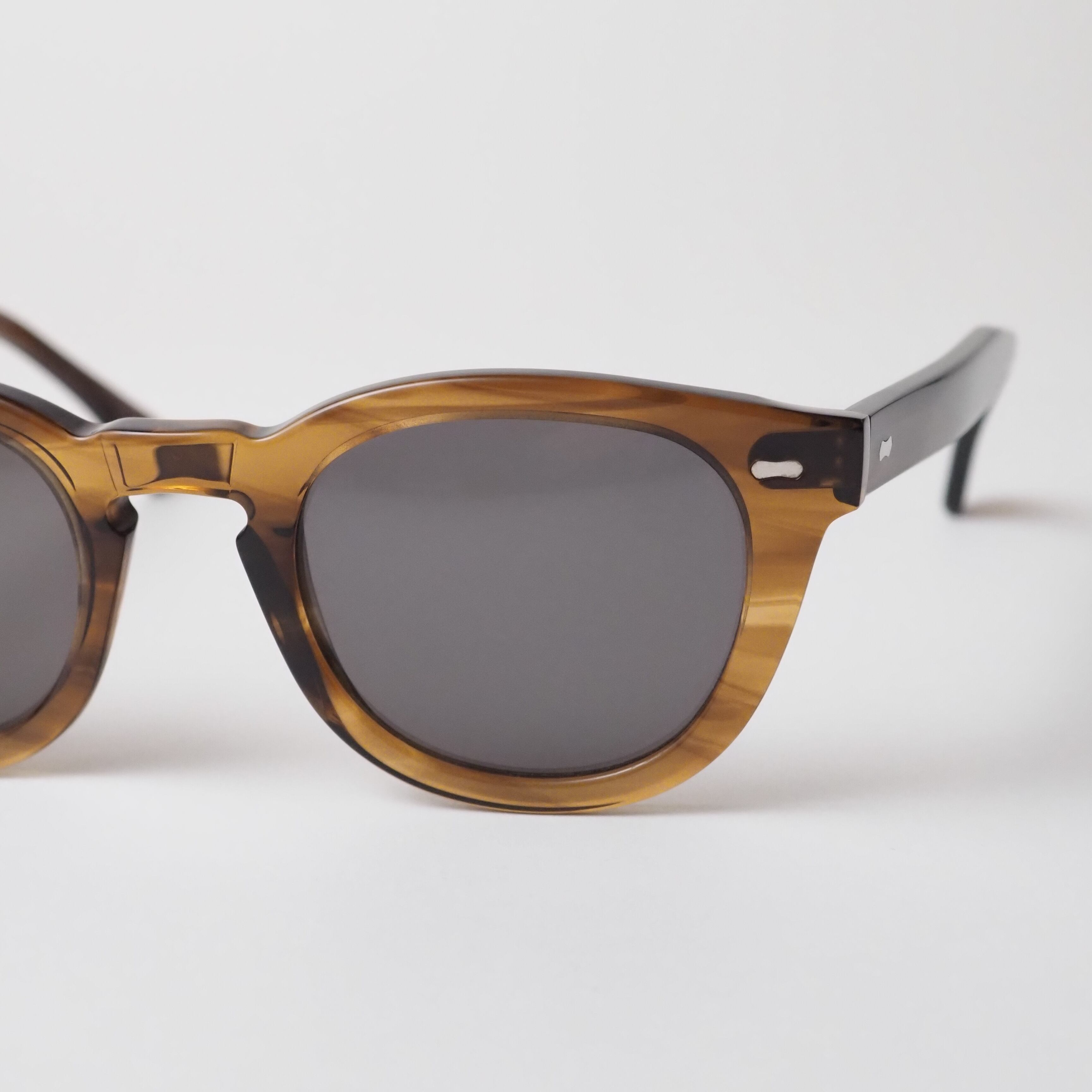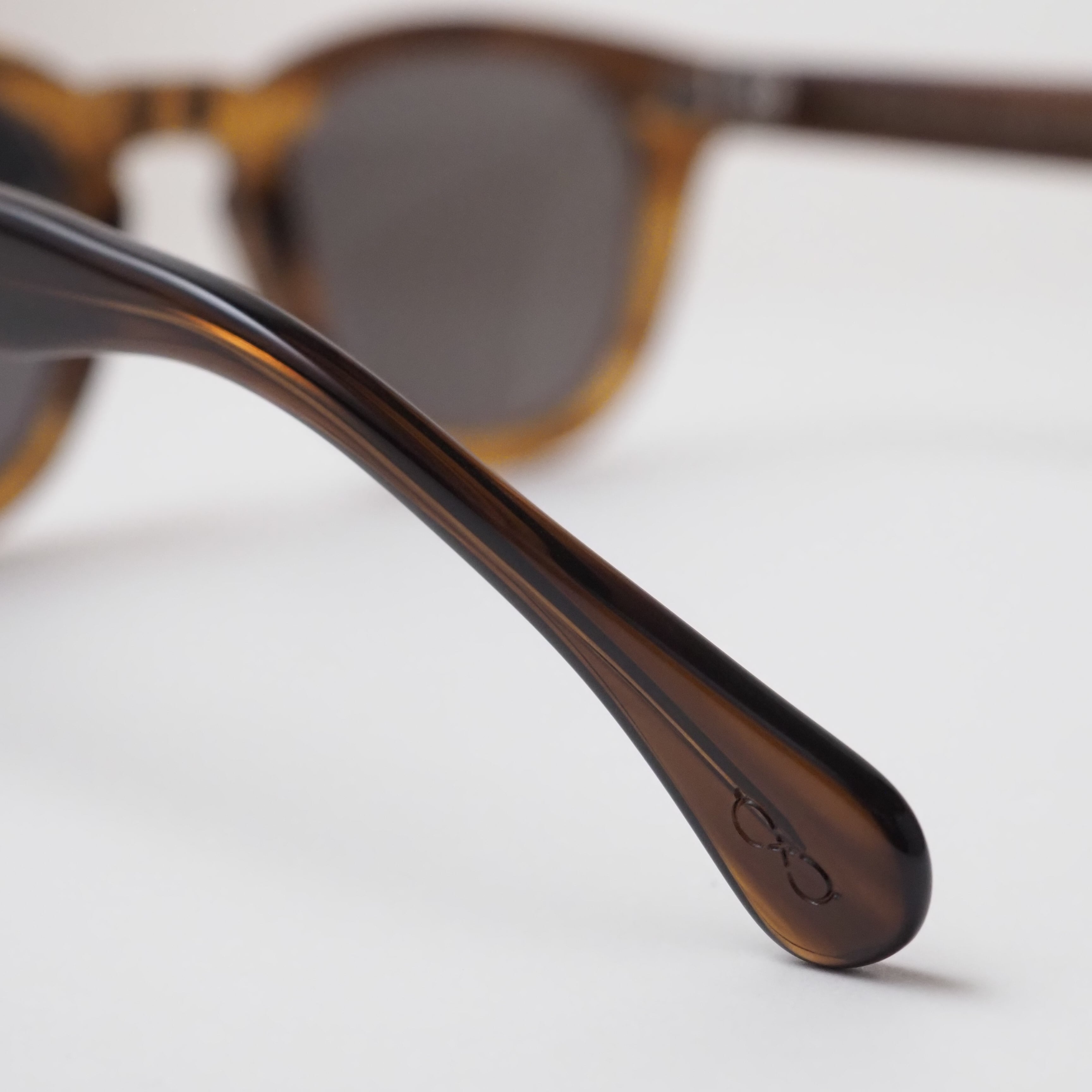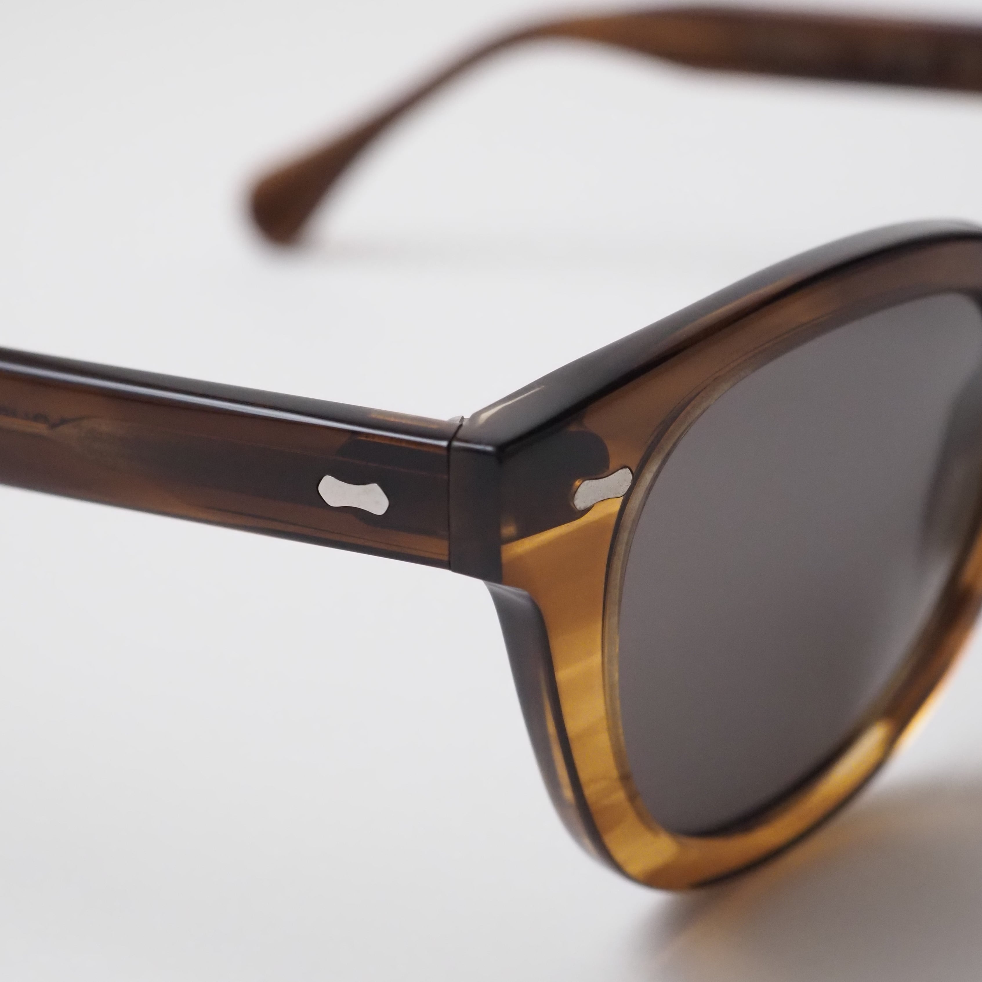 滑らかに磨き上げられた削り出しのアセテートフレームや、一般的なプレーティングの倍の厚みを持つメタルフレームなど、高度な技術と工程が随所に用いられている。