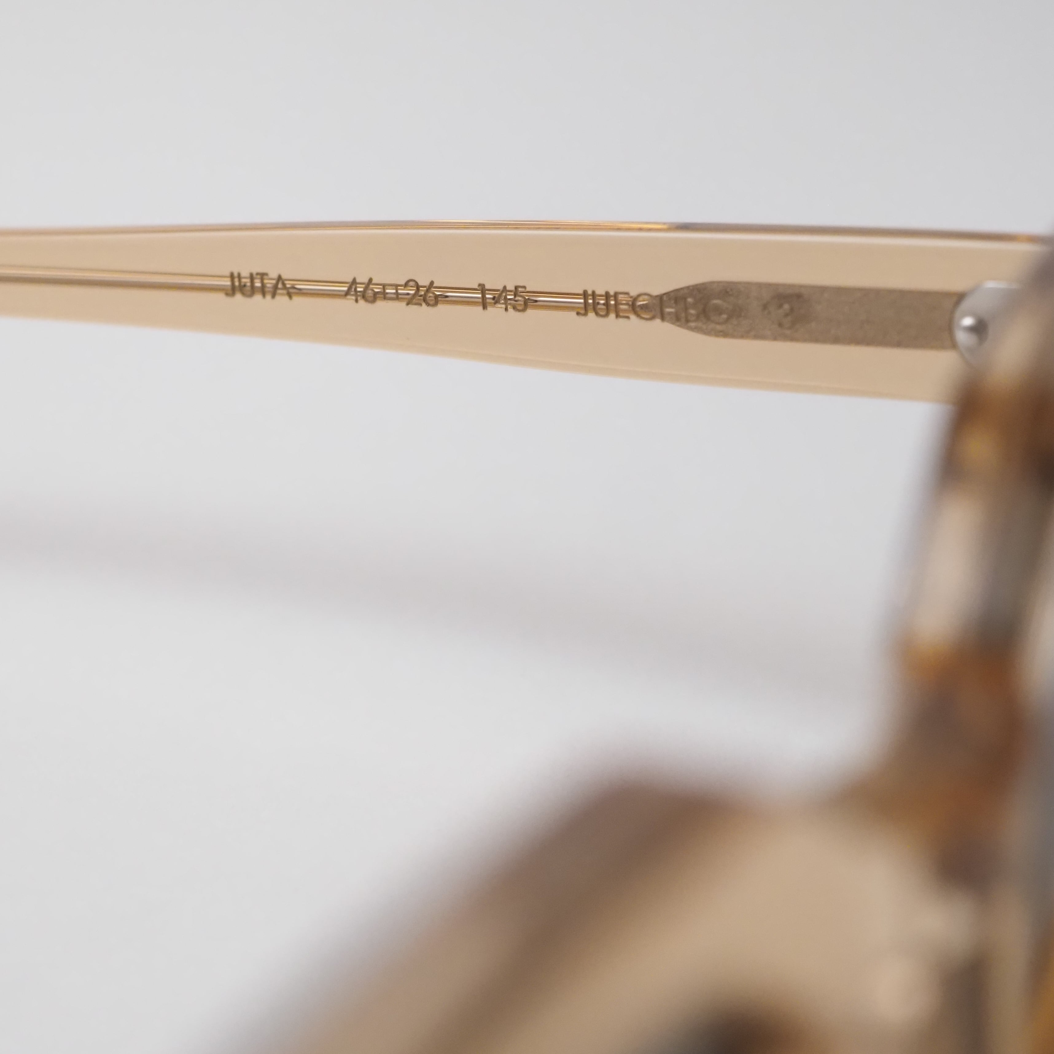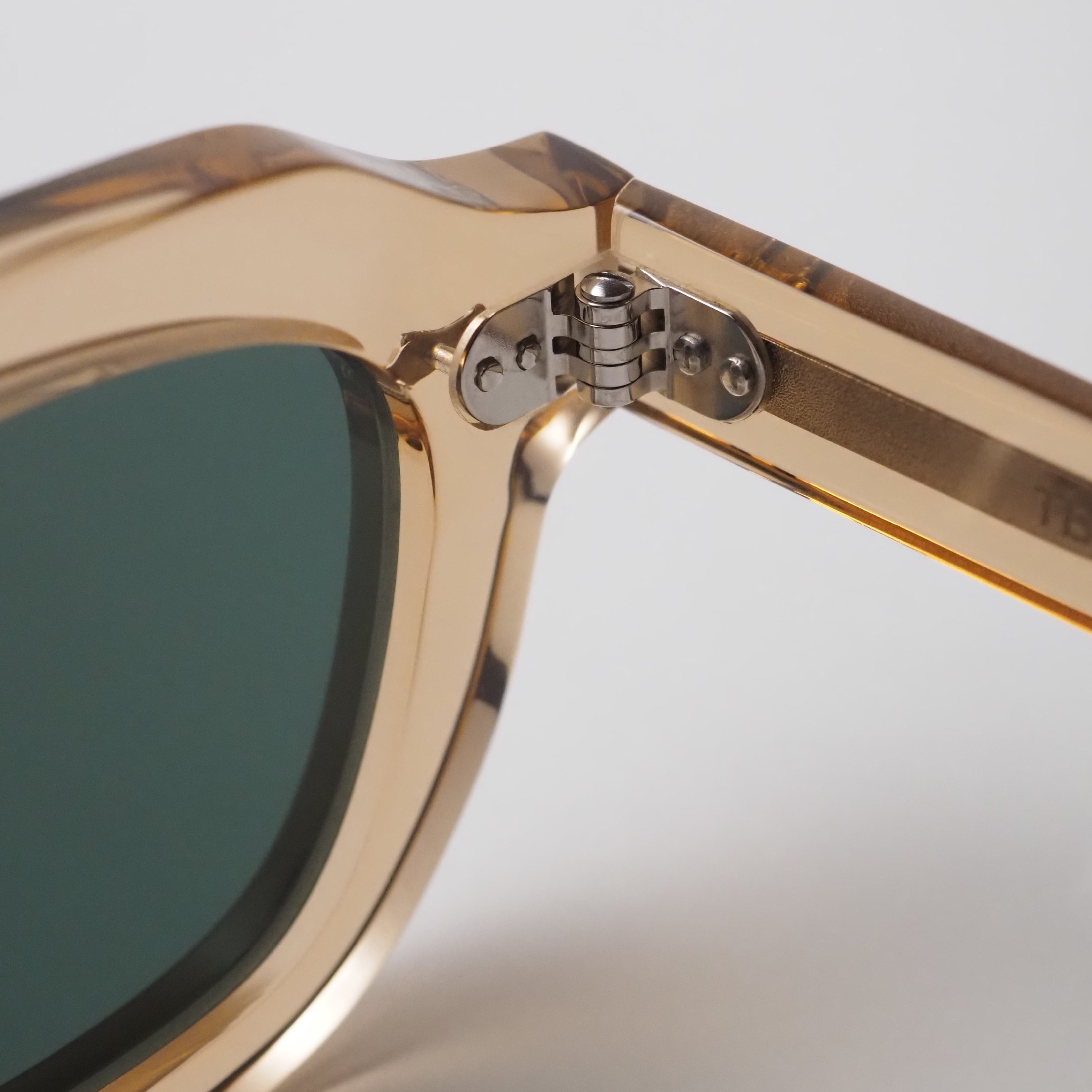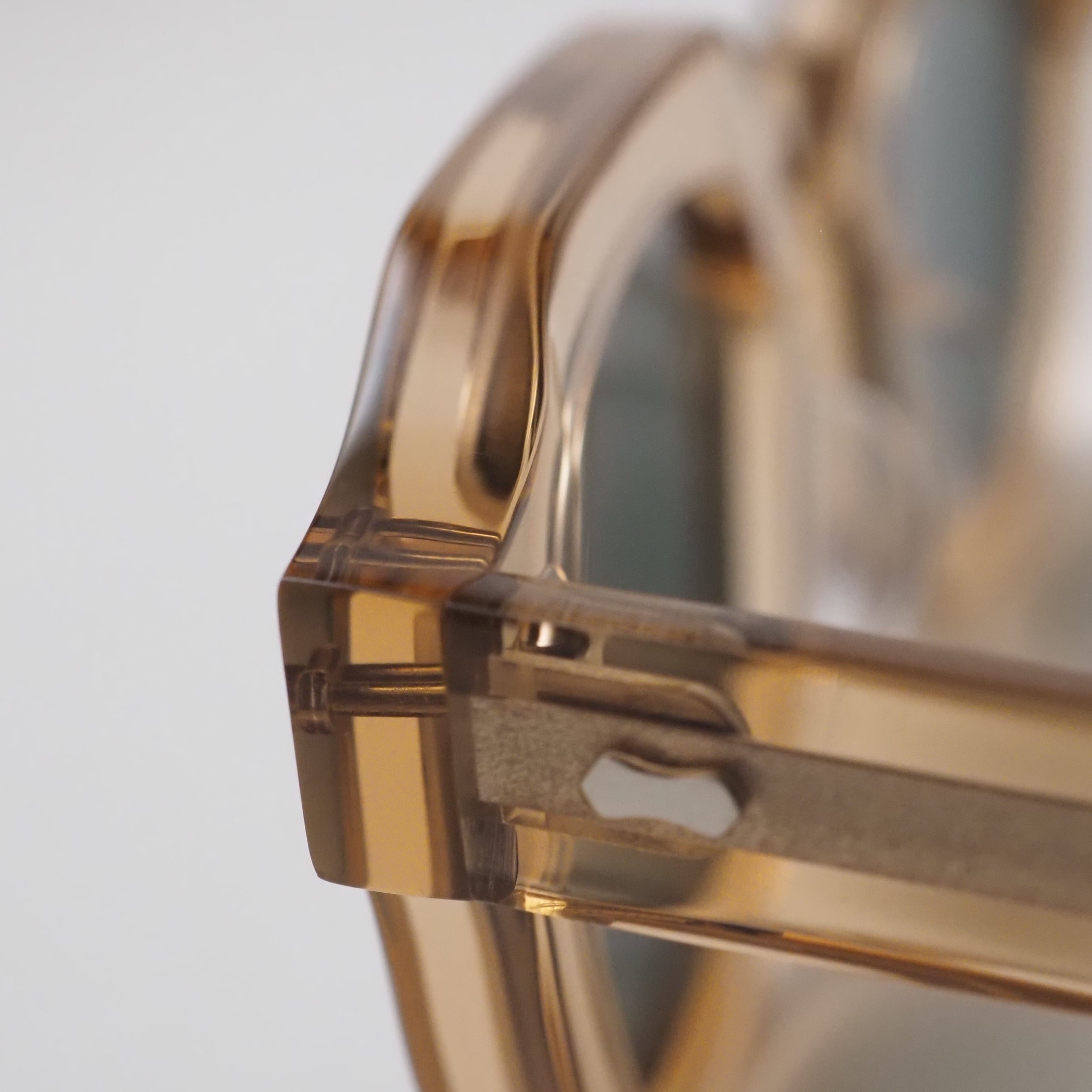 滑らかに磨き上げられた削り出しのアセテートフレームや、一般的なプレーティングの倍の厚みを持つメタルフレームなど、高度な技術と工程が随所に用いられている。