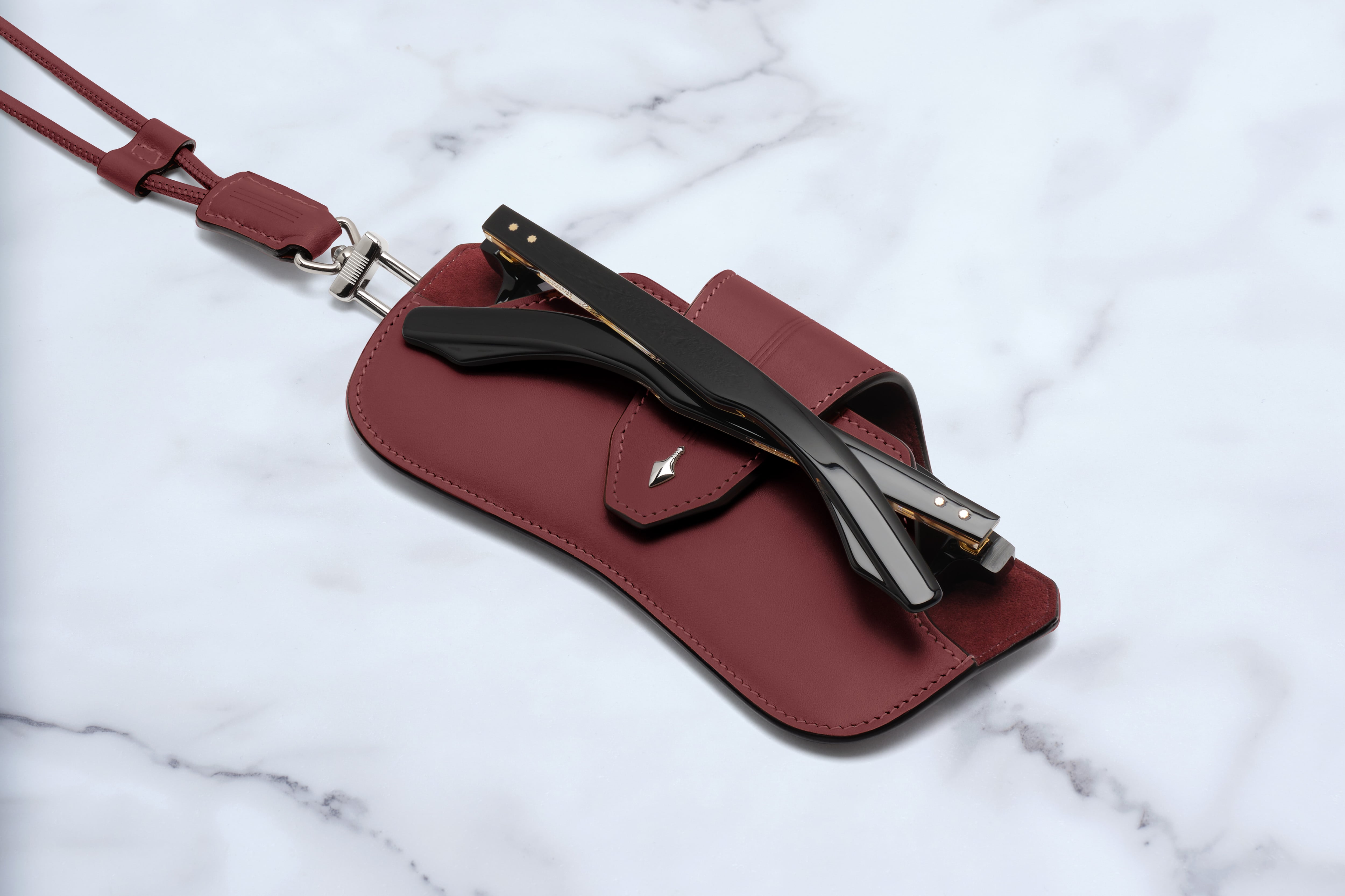 同素材の取り外し可能なレザーストラップが付属し、外出時の持ち運びにも便利な設計です。スリムでありながら程よい構築感を備え、アイウェアを美しく収納します。