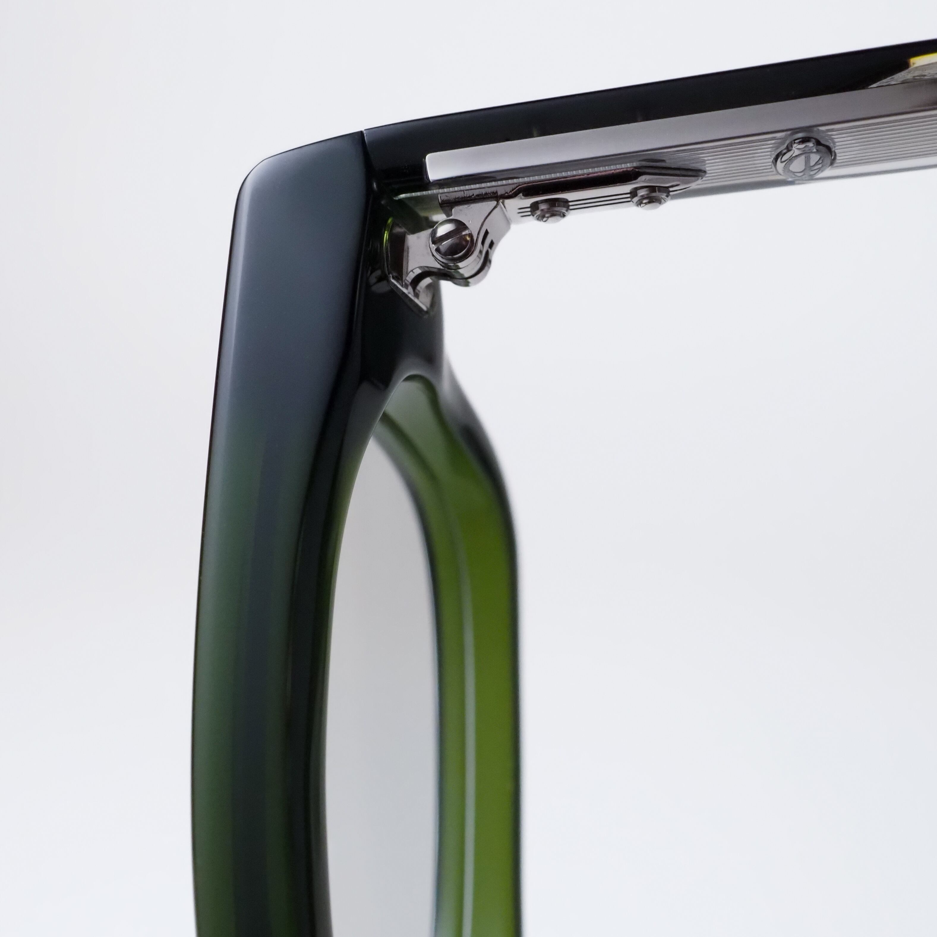 テンプル内部には、アールデコ調を意識した精緻な彫金を施した芯金を使用。それをクリア系アセテートで挟み込むことで、まるでメタルテンプルのようなシャープな側面の表情を演出しています。