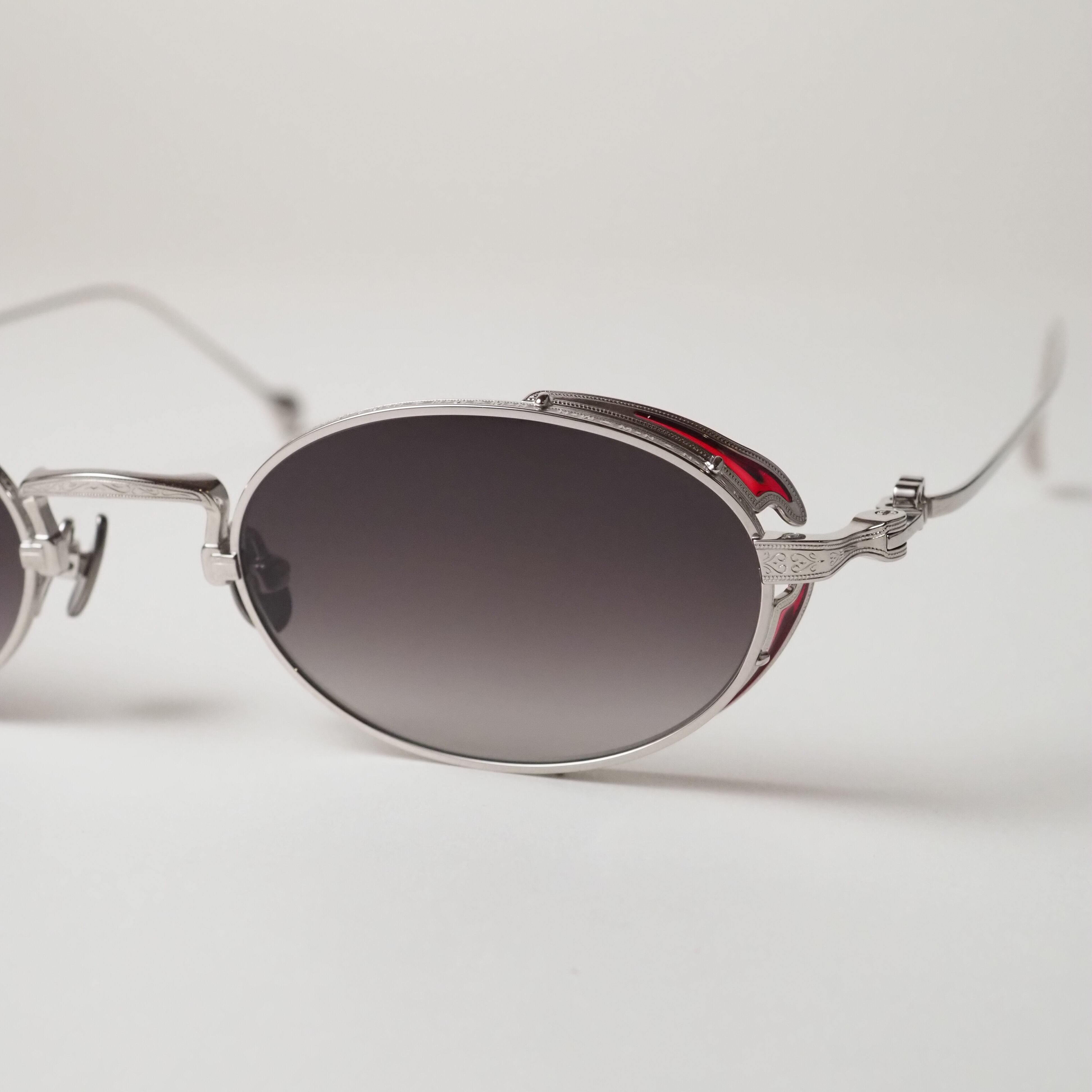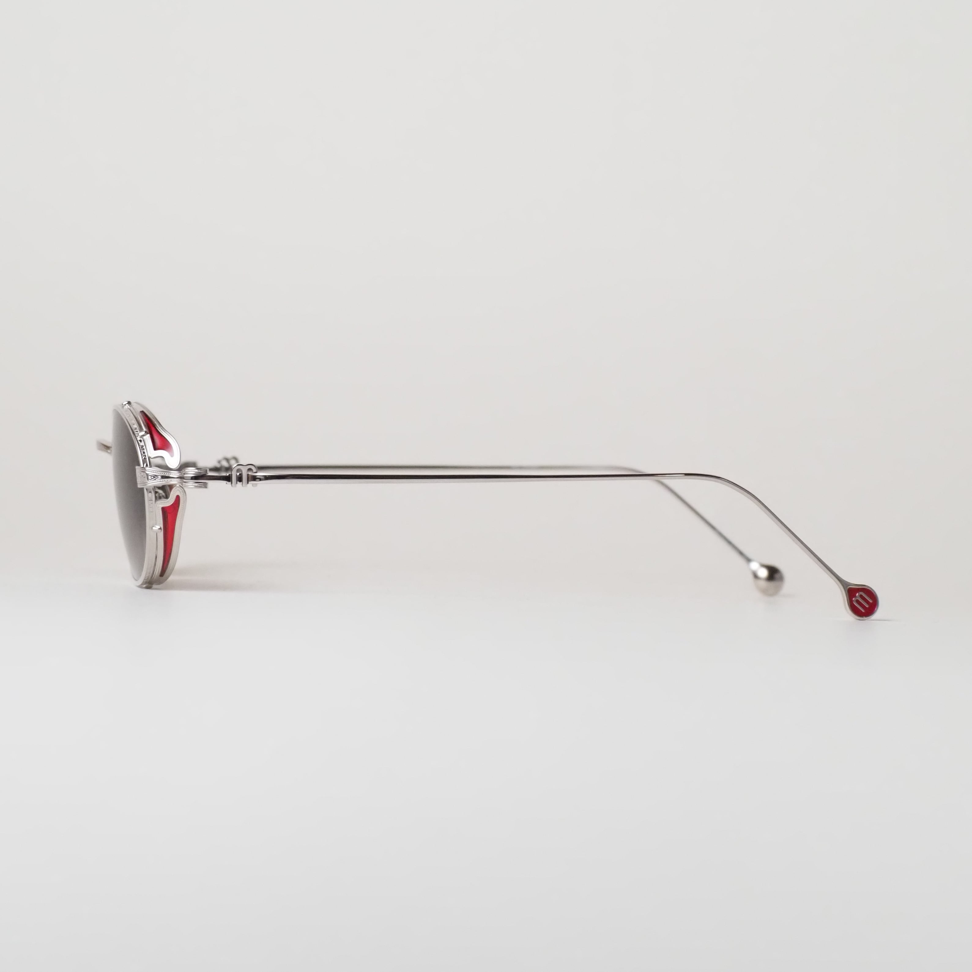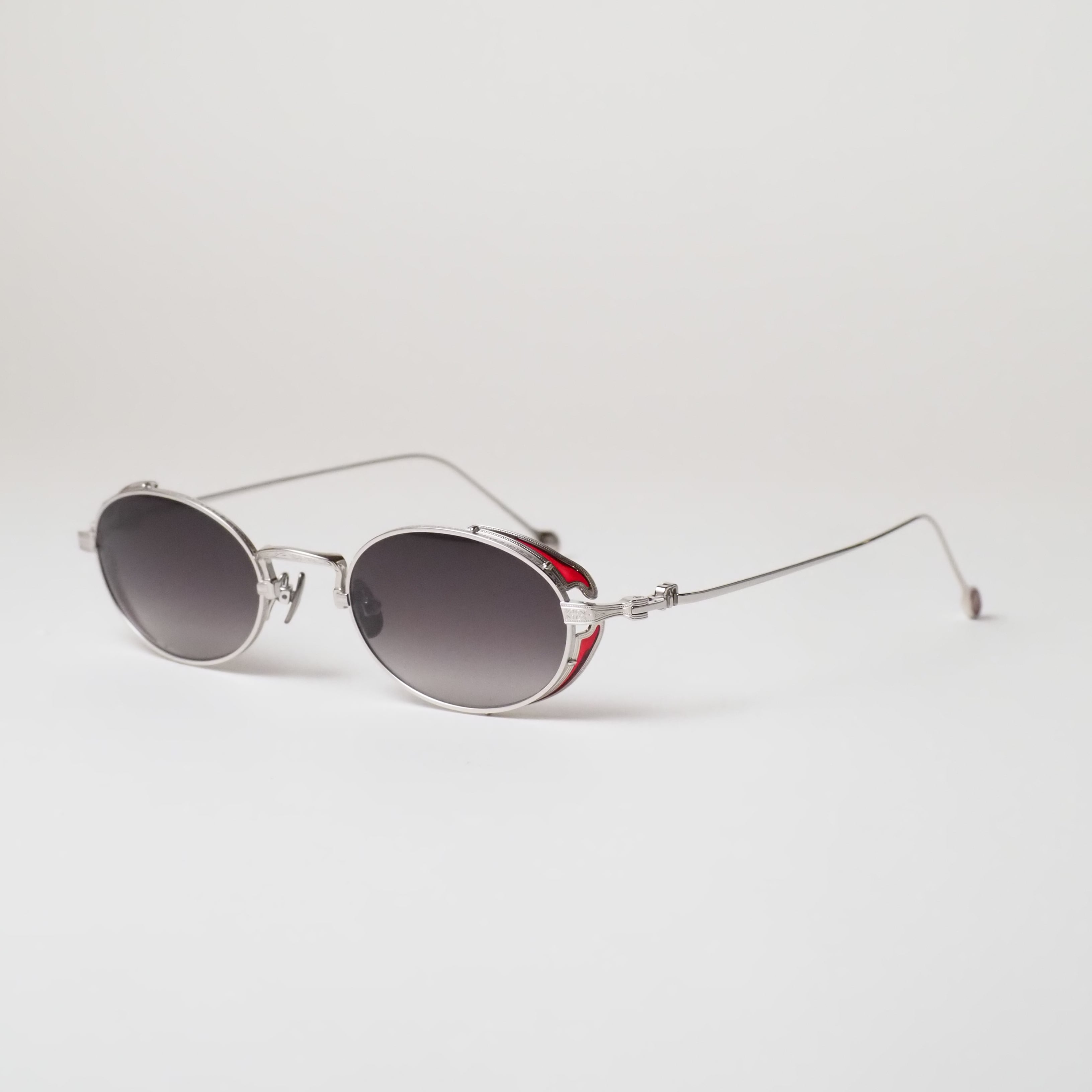 静かな輝きを放つシルバーフレームをベースに、風防・テンプルエンド・ブリッジ上部にはそれぞれ色鮮やかな赤橙色の七宝塗りが施され、落ち着きのある高級感を放っています。
