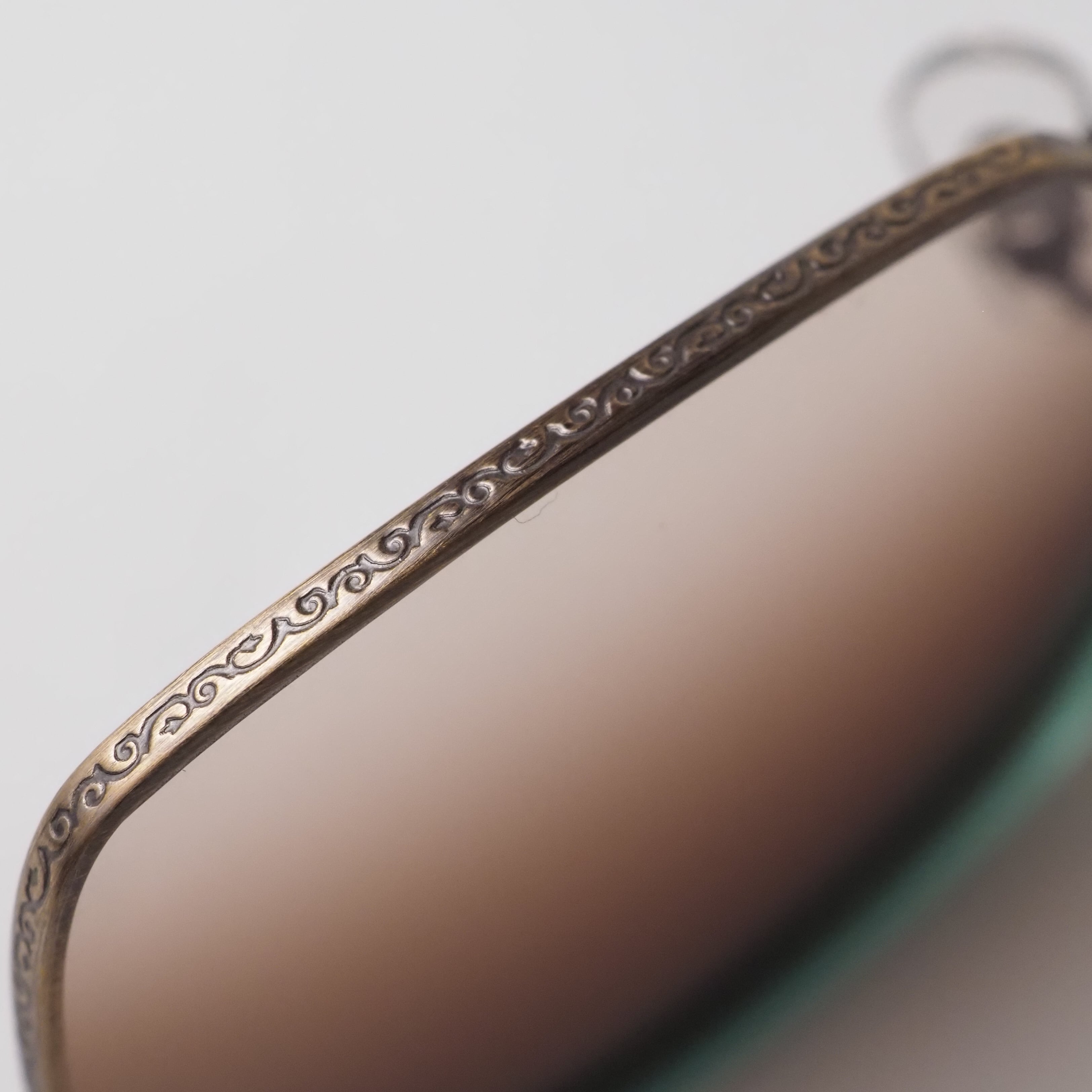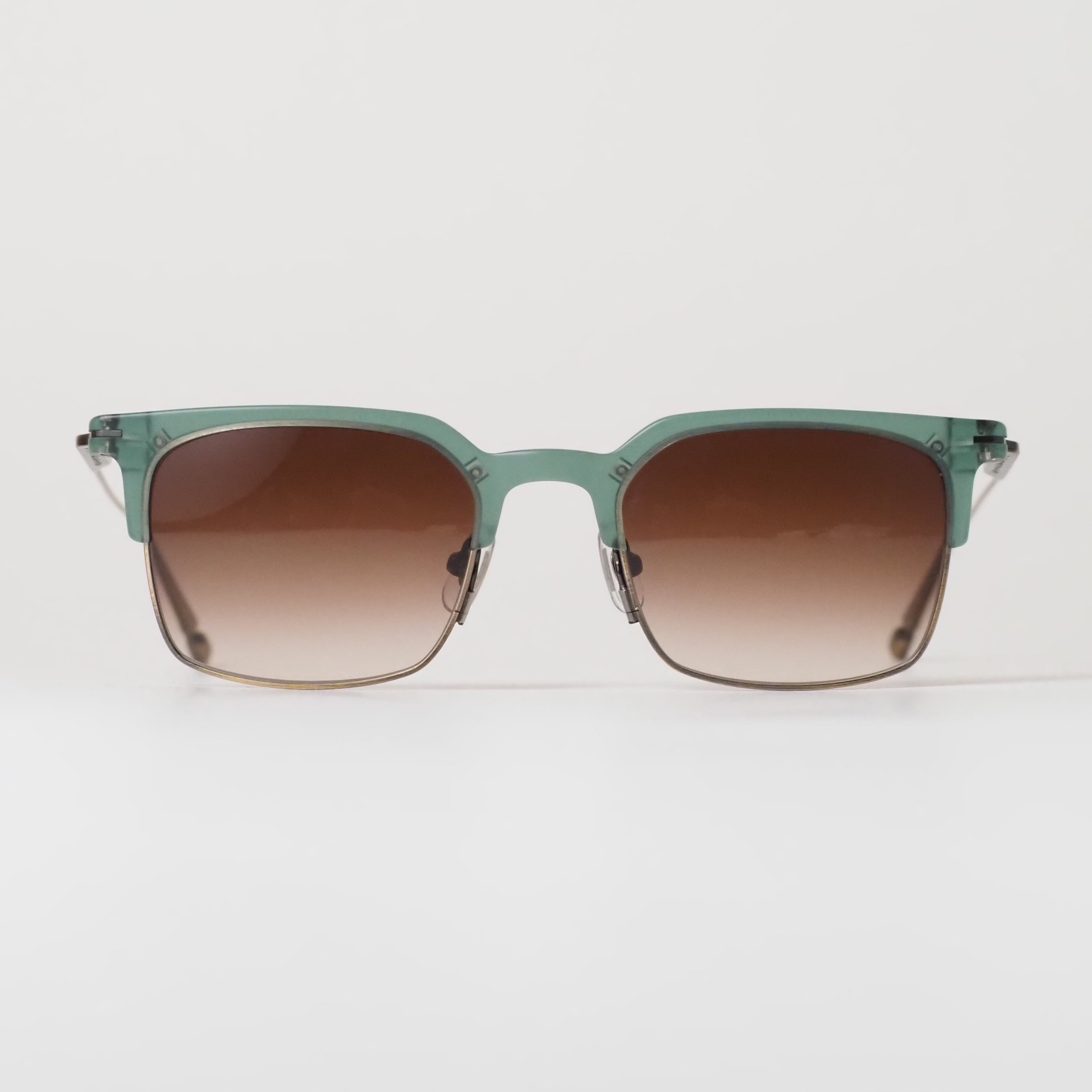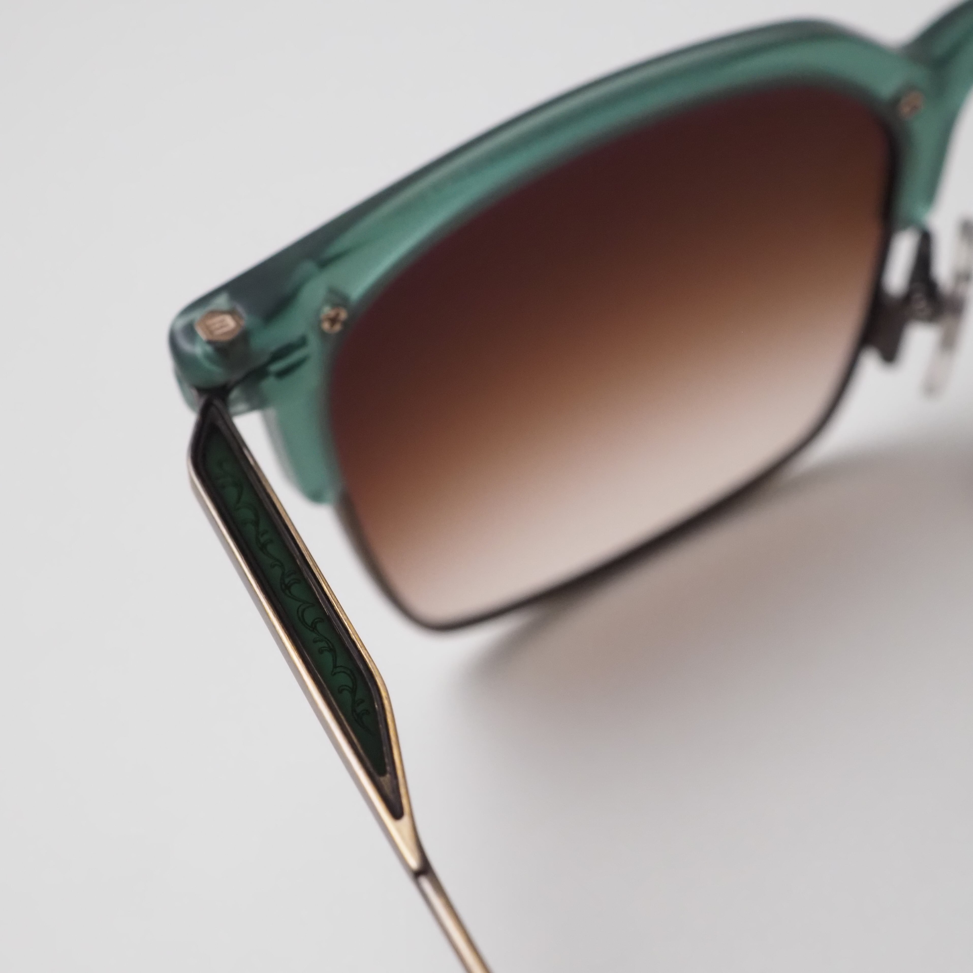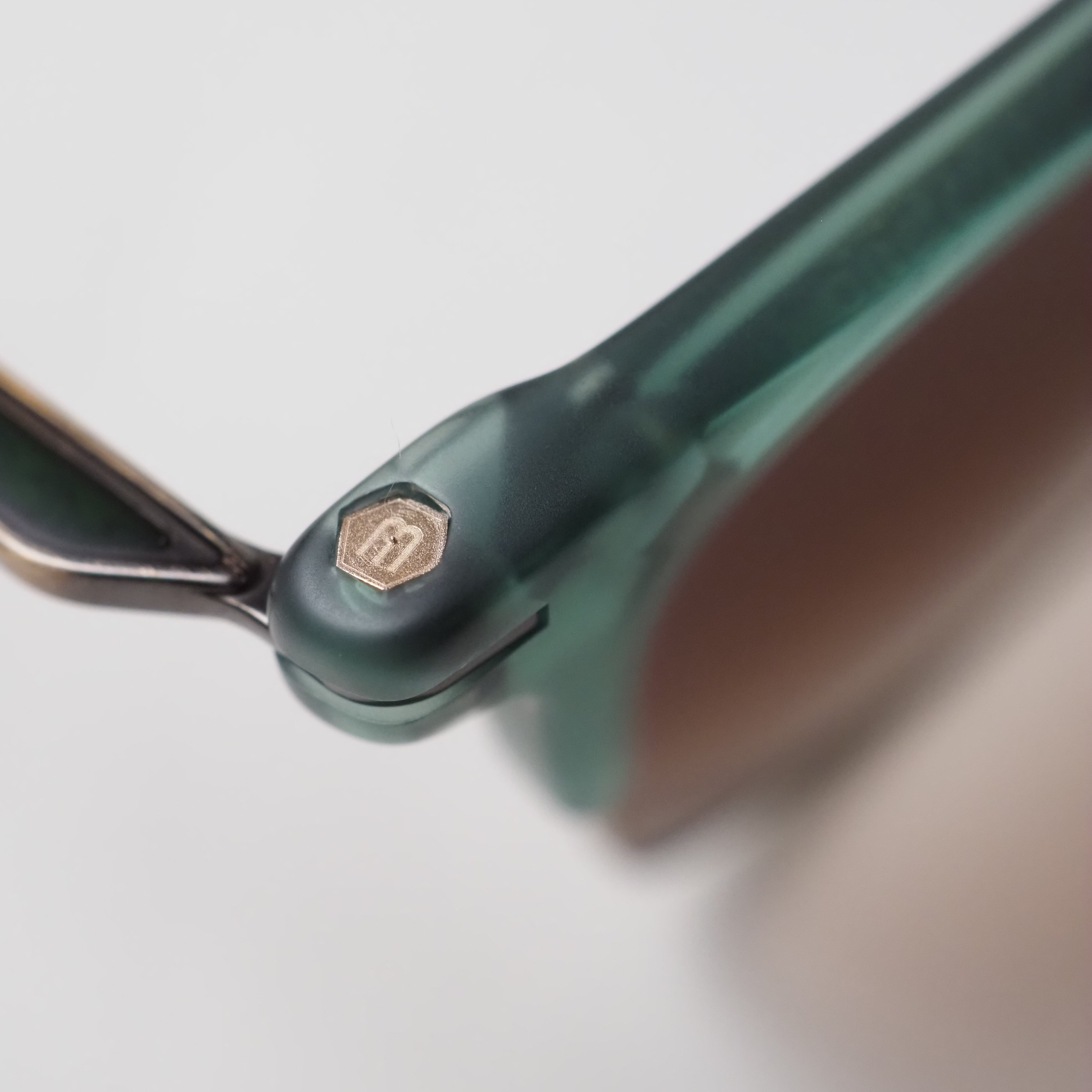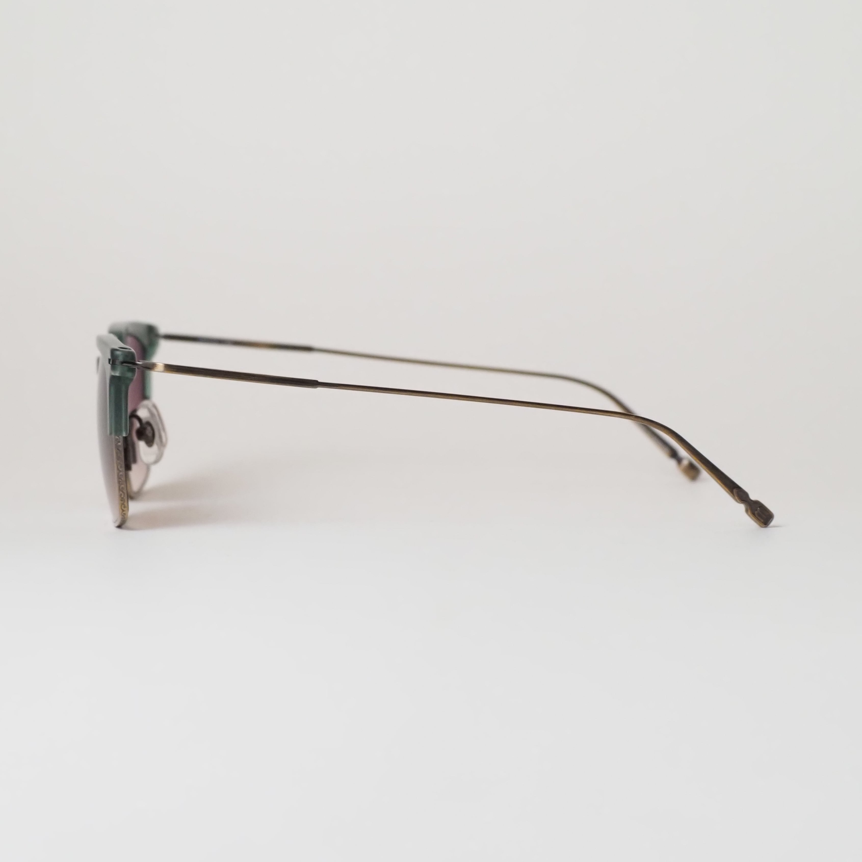 マットなボトルグリーンのブロウがもたらす深みのある表情に、アンティークゴールドのメタルパーツが温かみのある輝きを添えます。