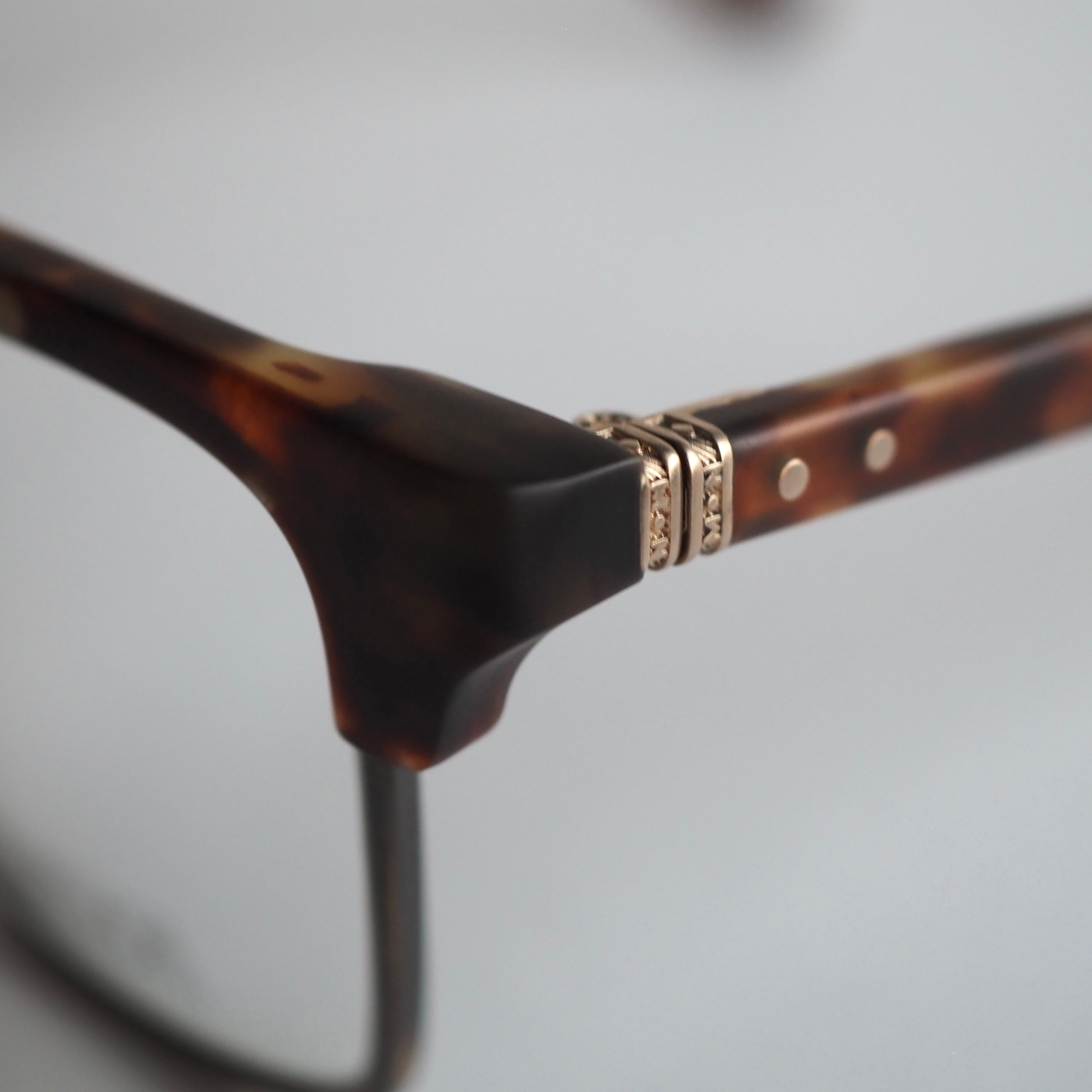 テンプルの合口部分には彫金が施されたオリジナルメタルパーツが配され、ワンポイントアクセントとして目を惹くデザインとなっています。