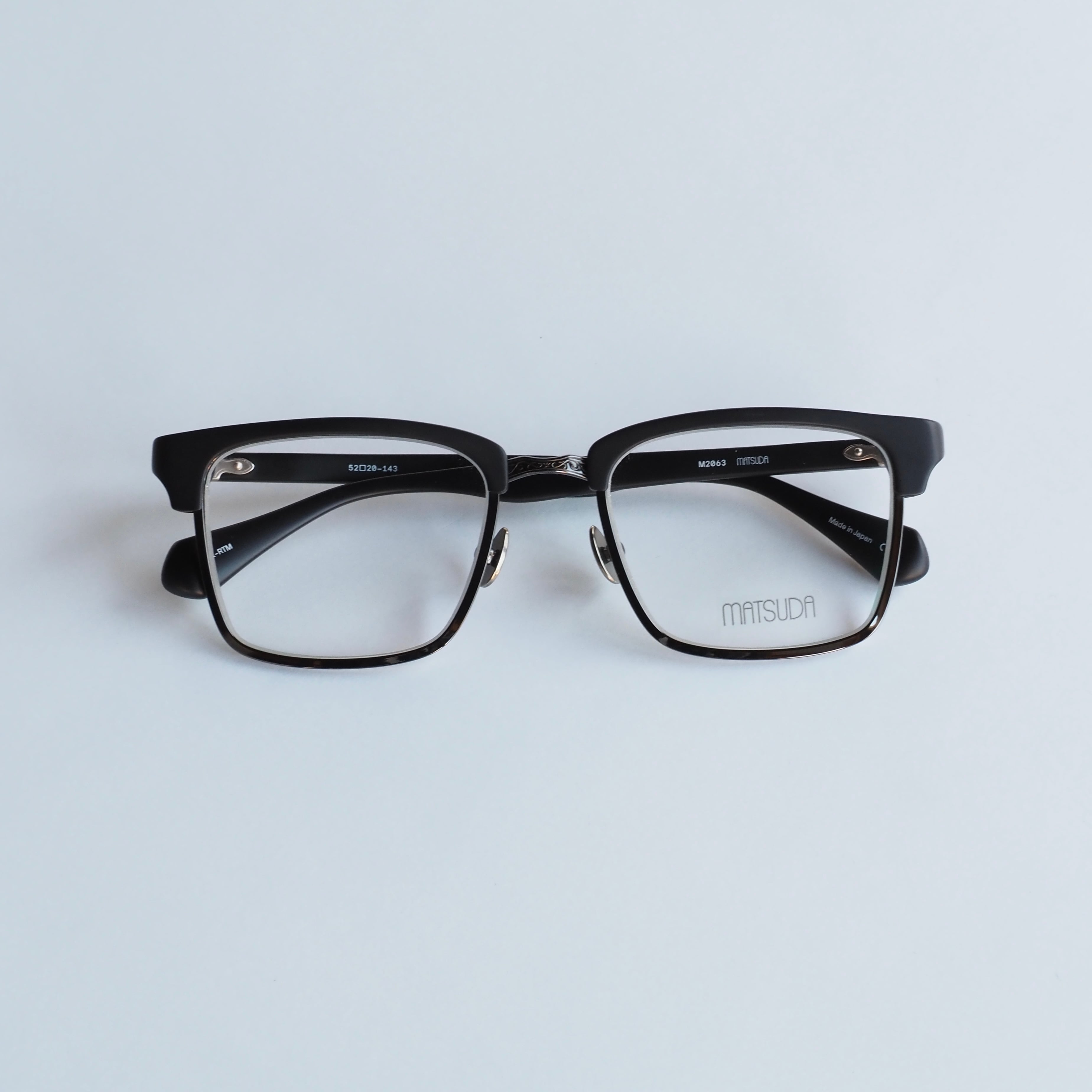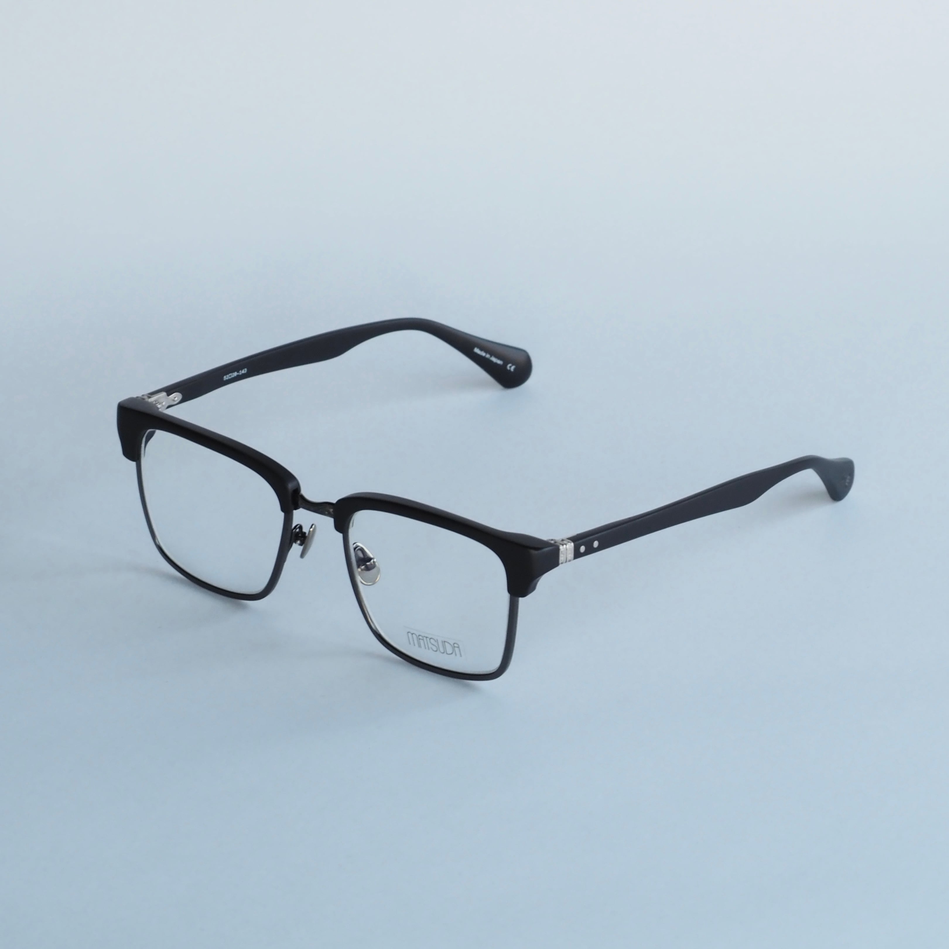 ブラックのワントーンで統一されたカラーリングは印象を引き締め、重厚感を中和します。ブローラインはマット仕様、リムはツヤあり仕様であるため、シンプルな黒縁ながら質感の違いを楽しんでいただけます。