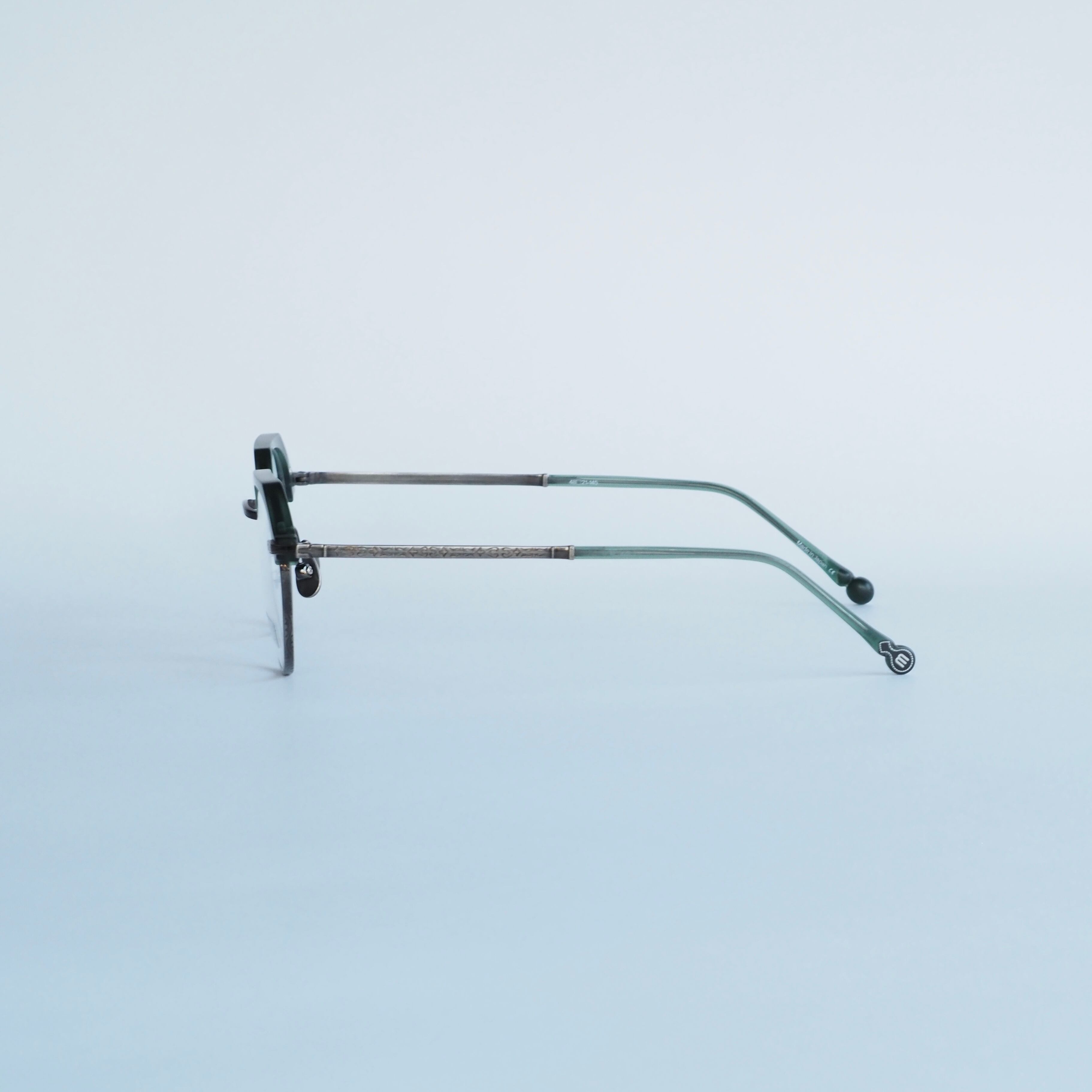 細見なシェイプ、ヨロイからテンプルにかけての繊細な彫金でエレガントな印象に。