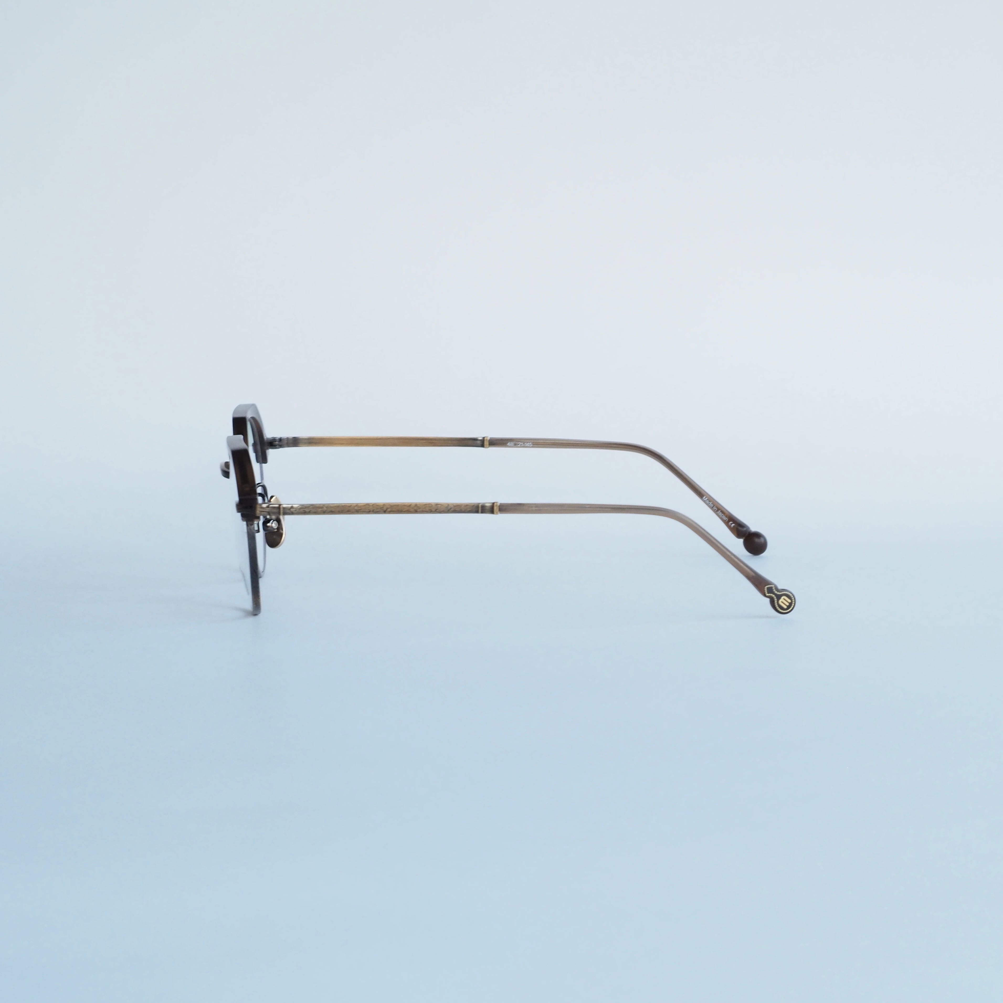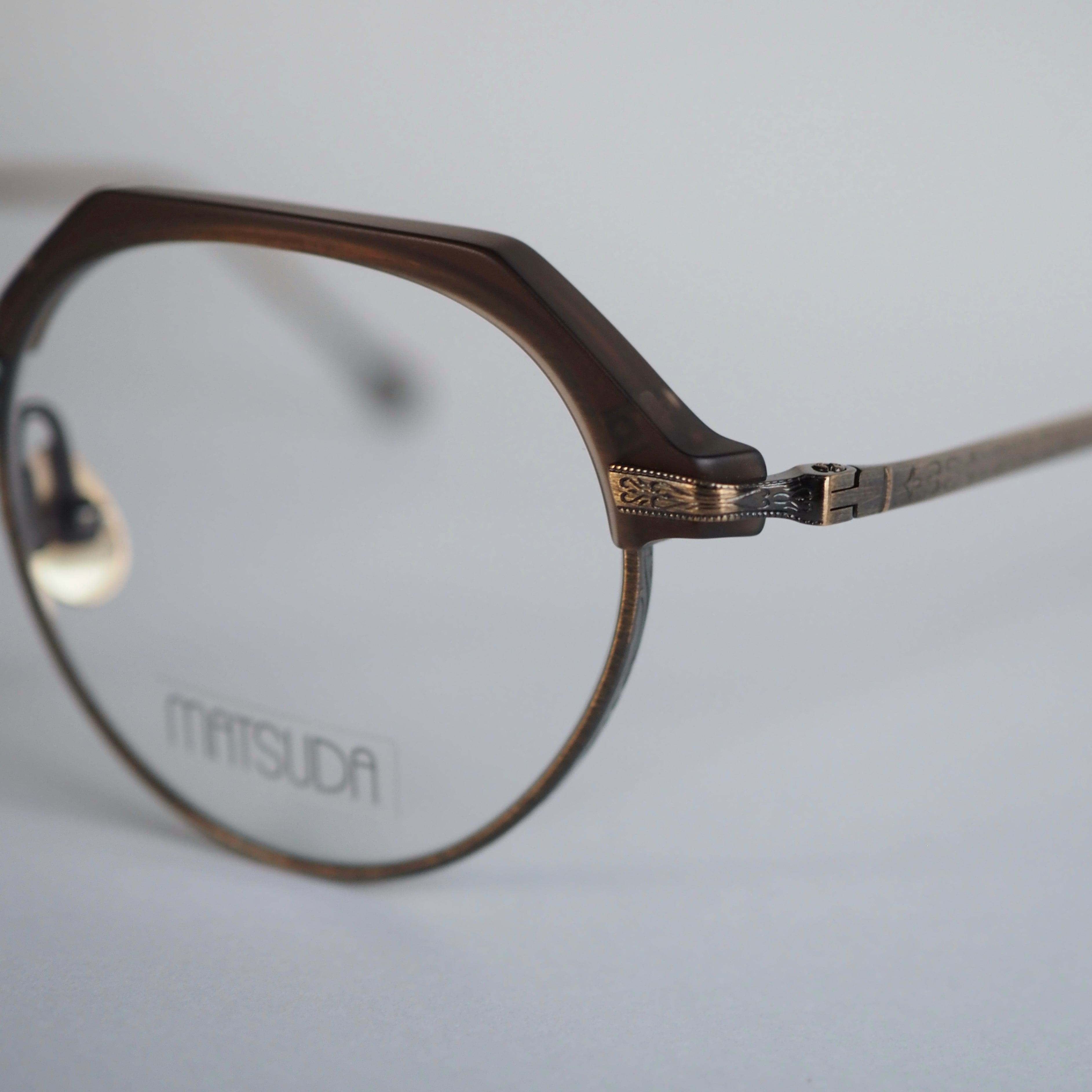 細見なシェイプ、ヨロイからテンプルにかけての繊細な彫金でエレガントな印象に。