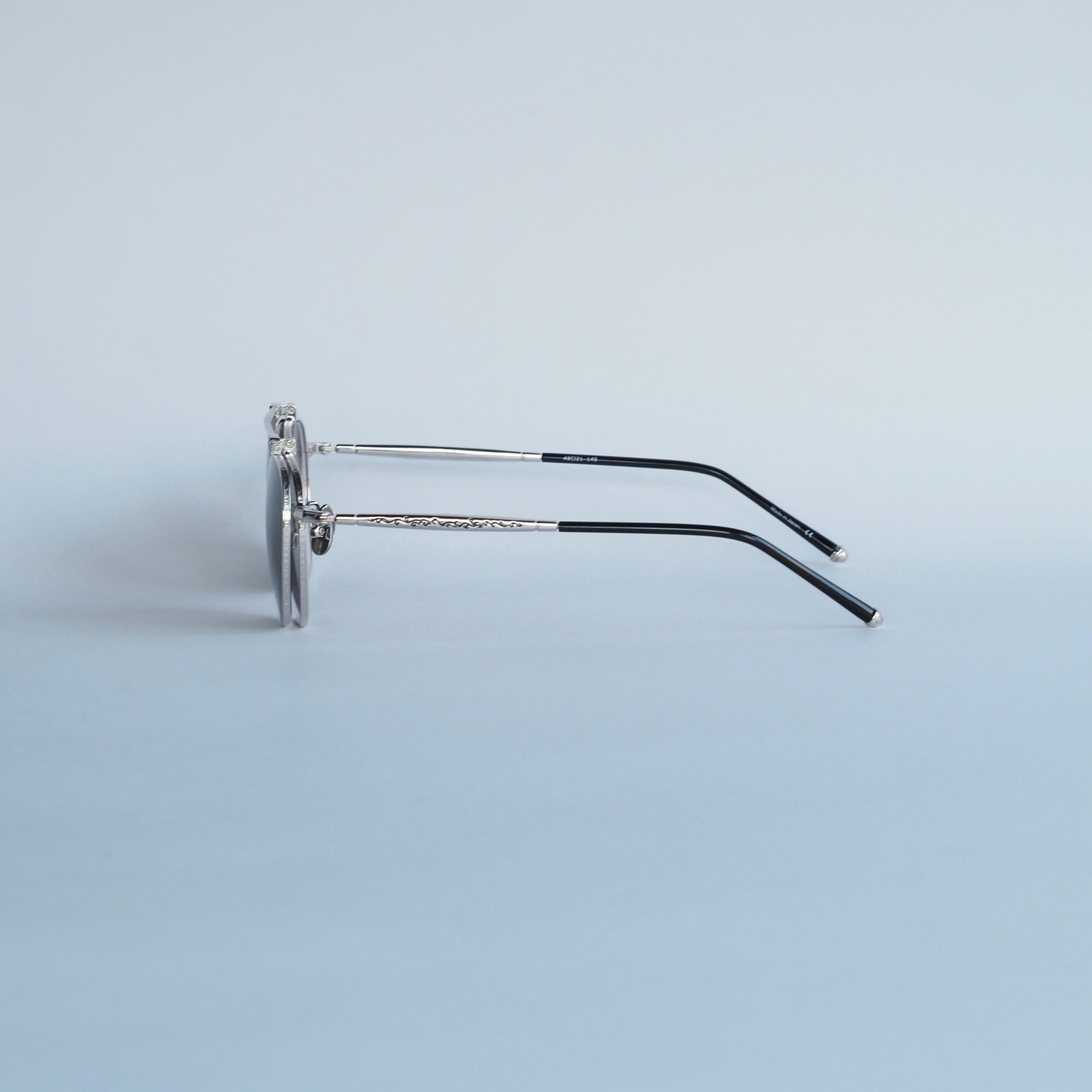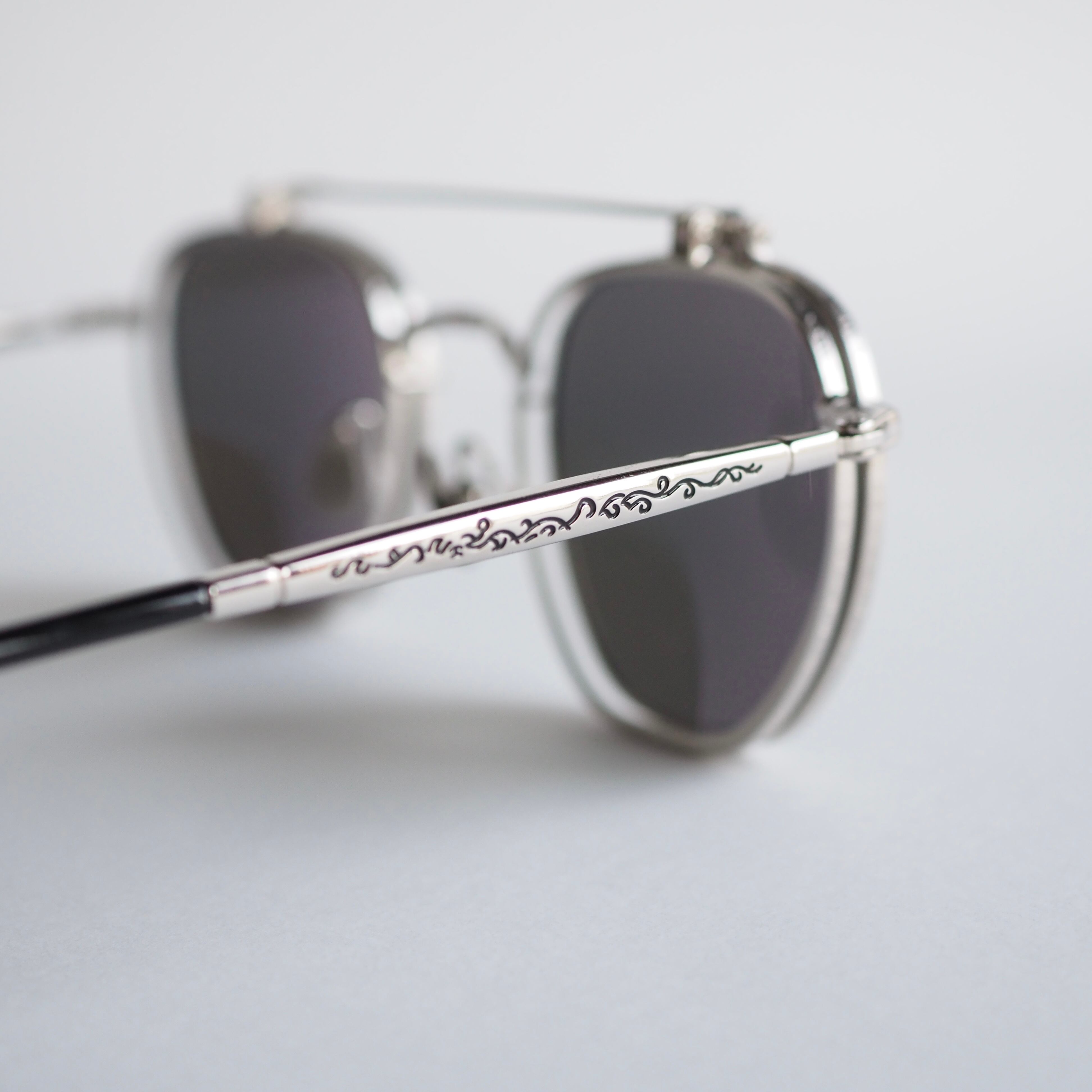 リムやフリップバーにはアールデコ調の繊細な彫金が施され、さらにテンプルには彫金に色を加えた唐草柄があしらわれています。職人の技術に裏付けられた細やかな意匠が目を見張る逸品です。