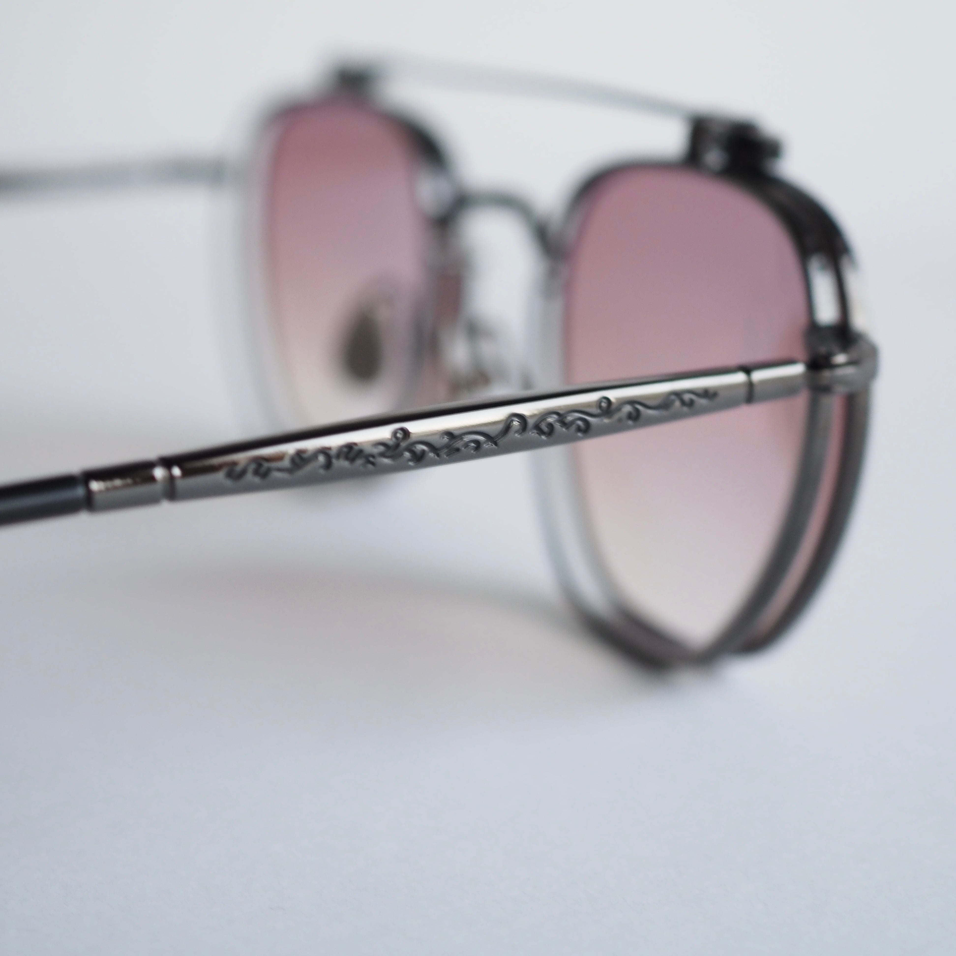 リムやフリップバーにはアールデコ調の繊細な彫金が施され、さらにテンプルには彫金に色を加えた唐草柄があしらわれています。職人の技術に裏付けられた細やかな意匠が目を見張る逸品です。