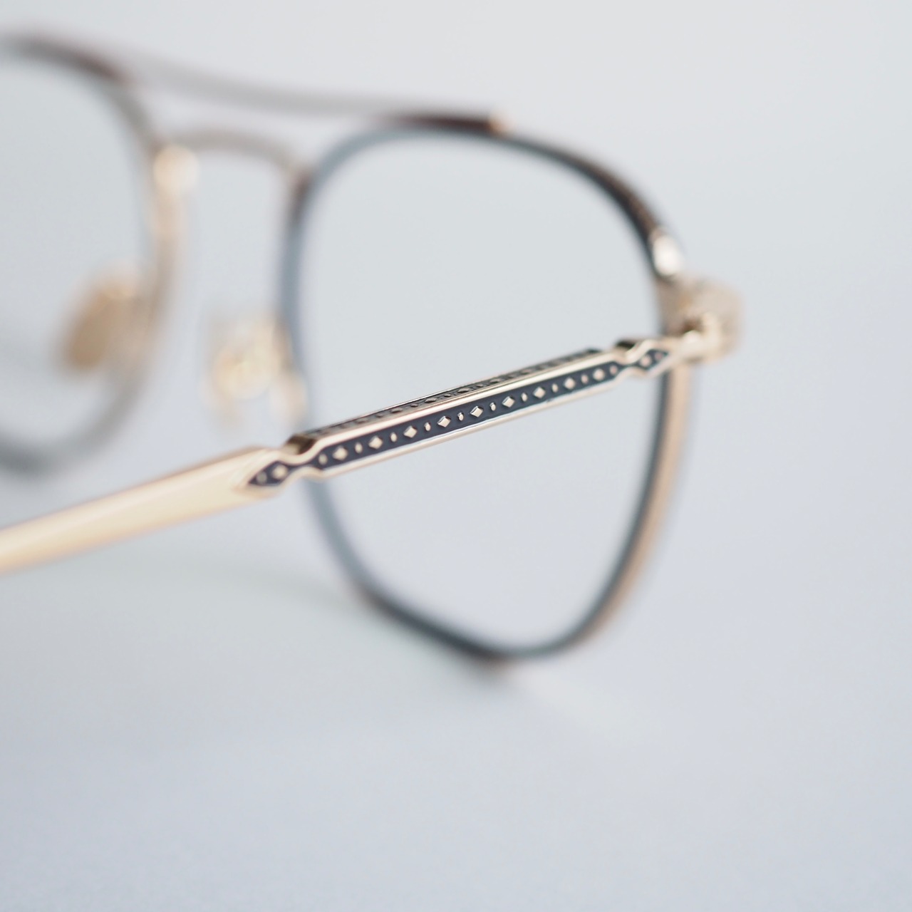 テンプルは3面にアールデコ調の細やかな彫金が施され、リムは薄いセル生地を巻いた「セル巻き」の仕様。