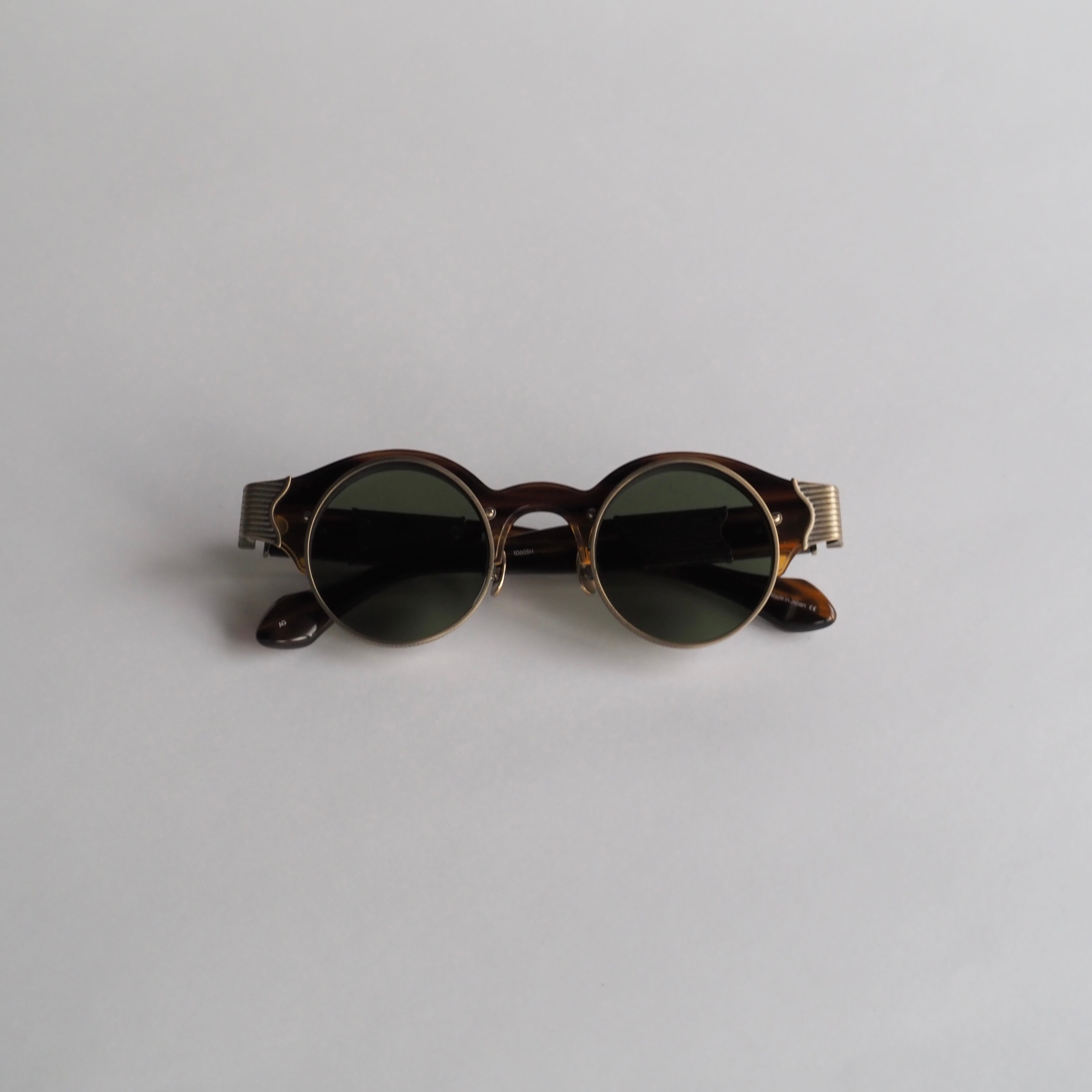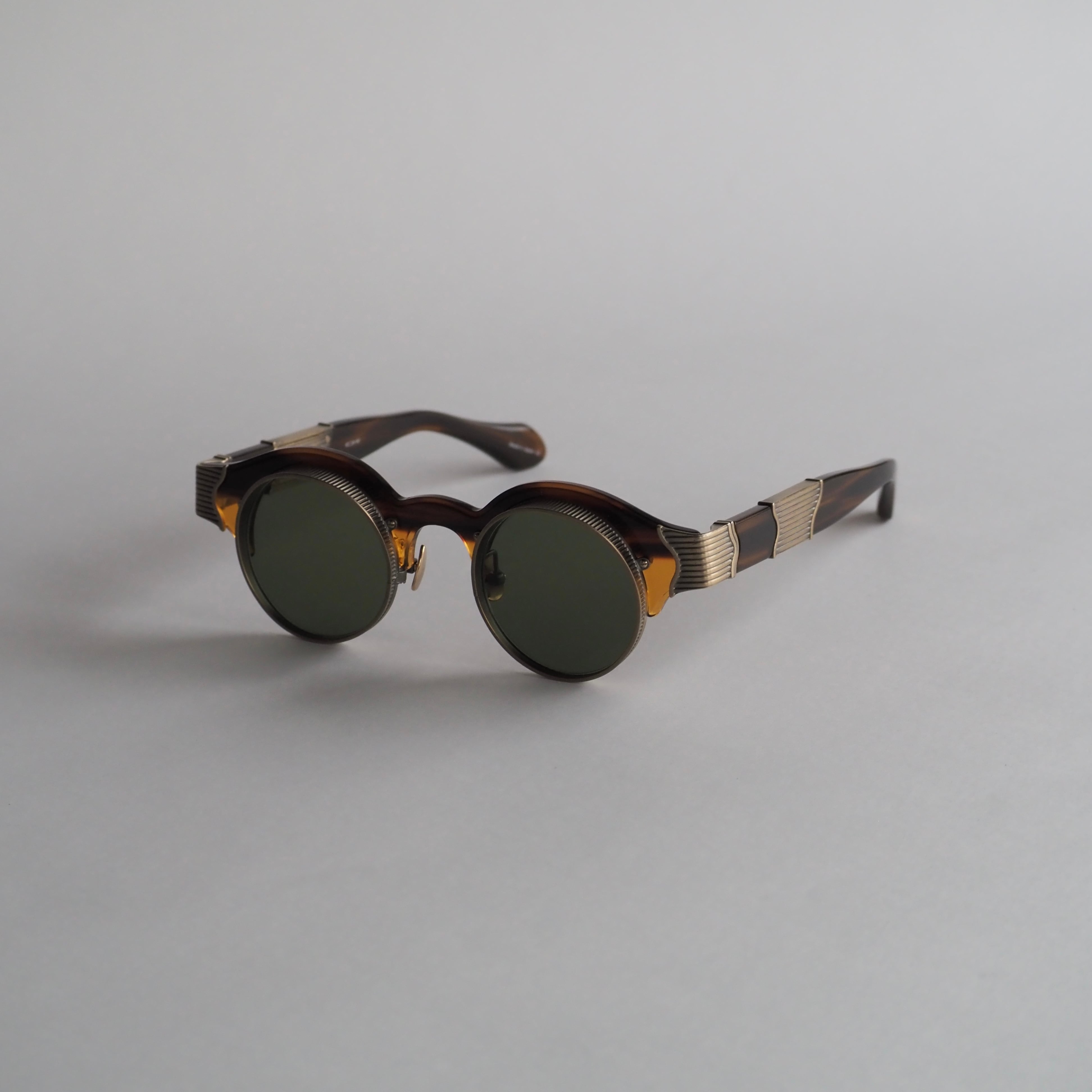 ラウンド型のレンズシェイプで、日本製アセテートと精巧なメタルディテールが組み合わさるコンビネーションフレーム。