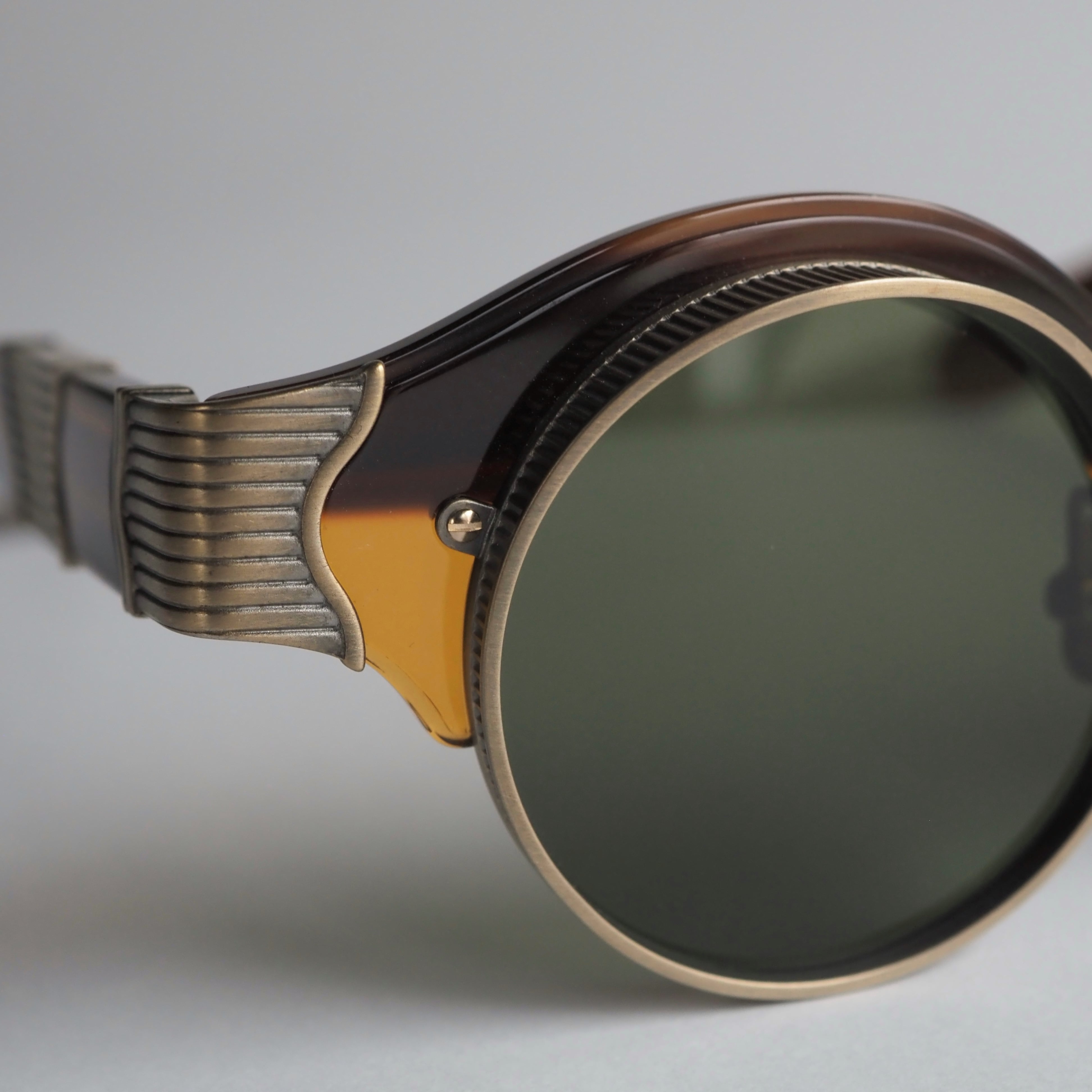 このフレームで一番の特徴である上部が大きく前に出ている大胆なメタルリムは、1920年代のクラシックカーのヘッドライトからインスピレーションを受けてデザインされています。