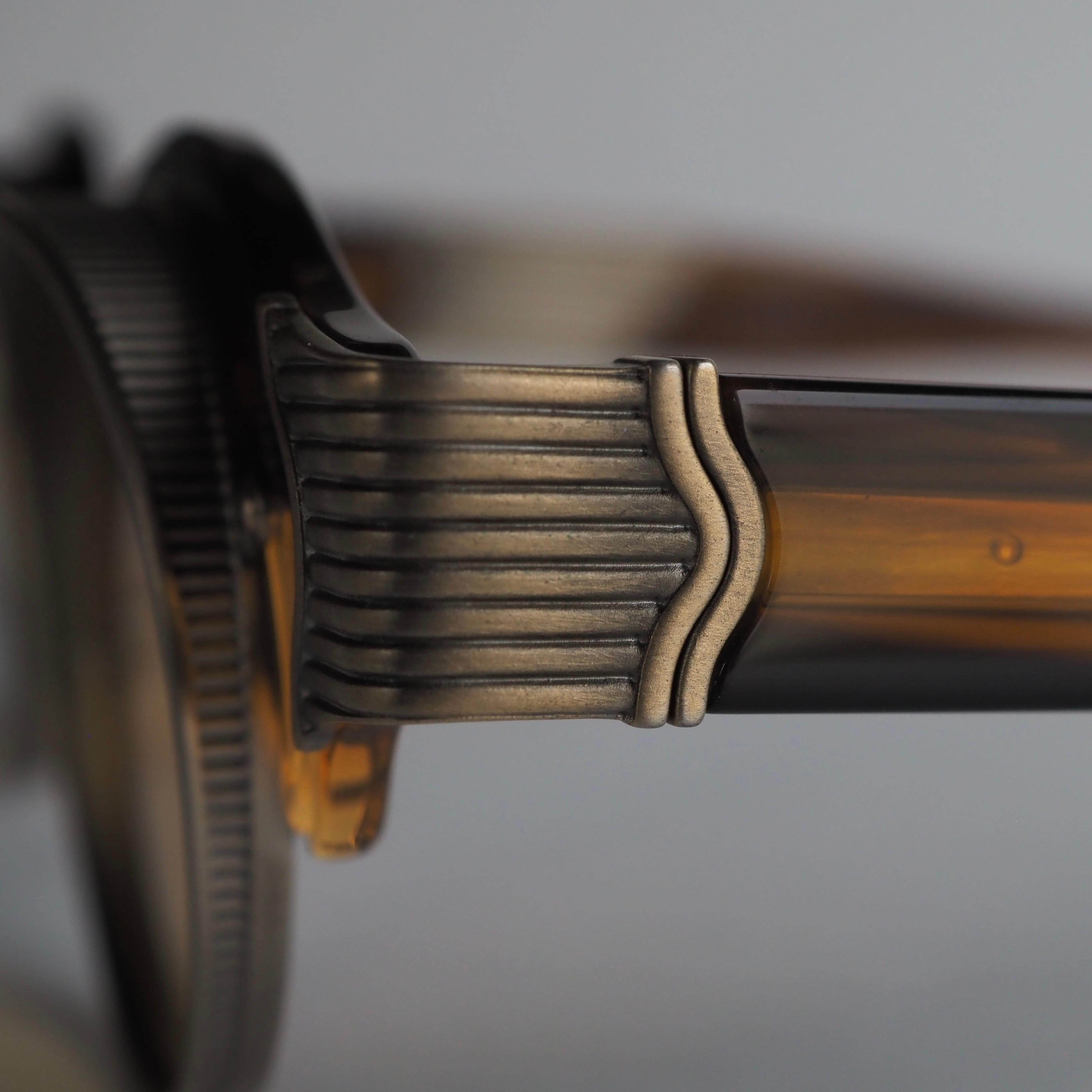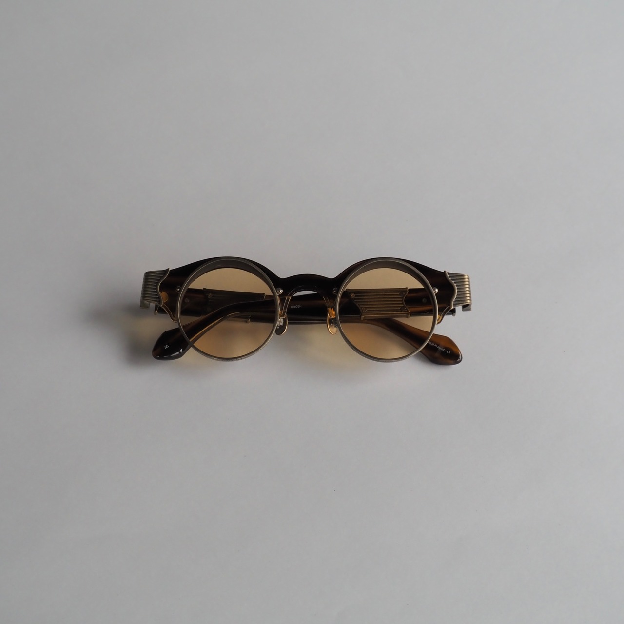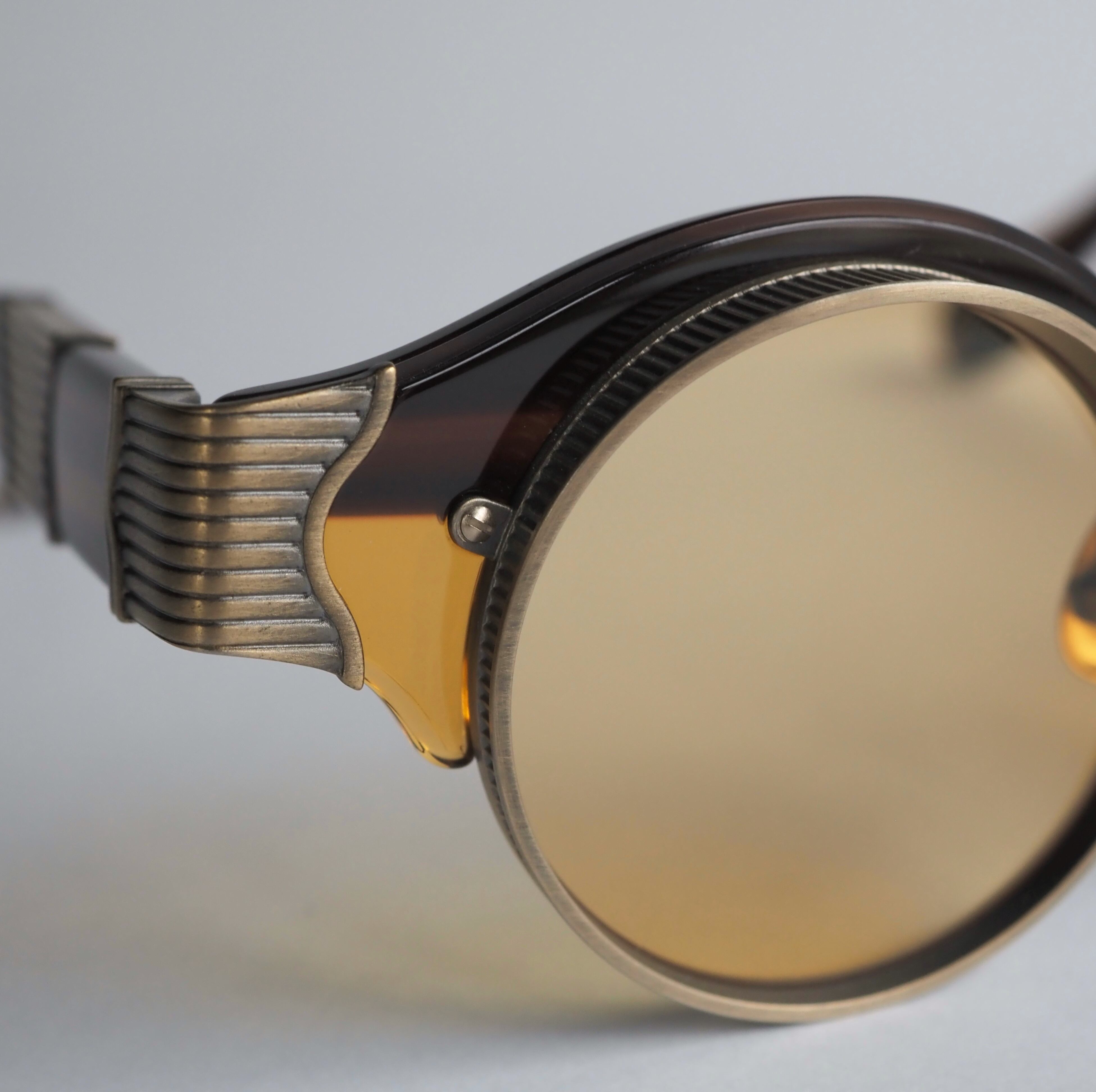 このフレームで一番の特徴である上部が大きく前に出ている大胆なメタルリムは、1920年代のクラシックカーのヘッドライトからインスピレーションを受けてデザインされています。