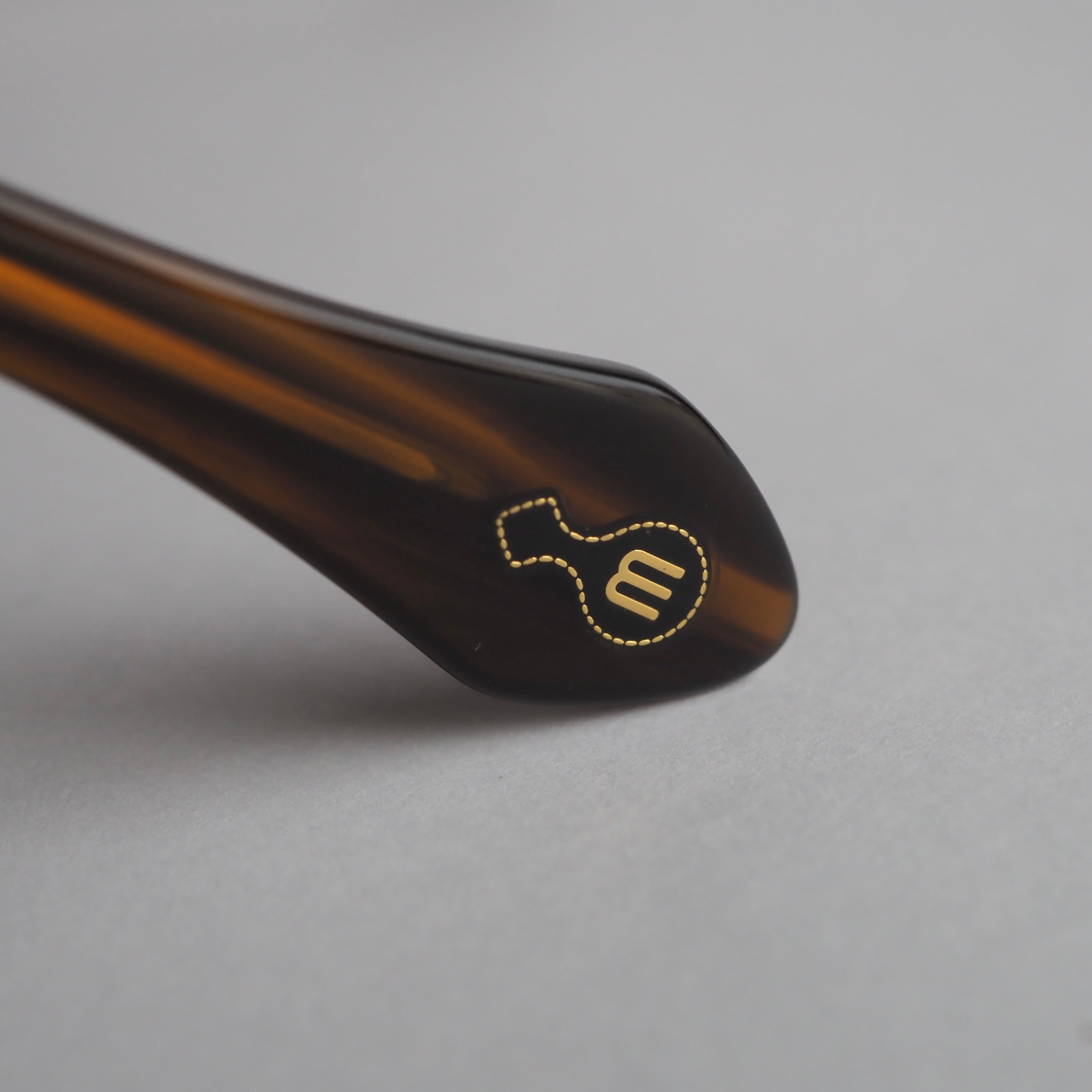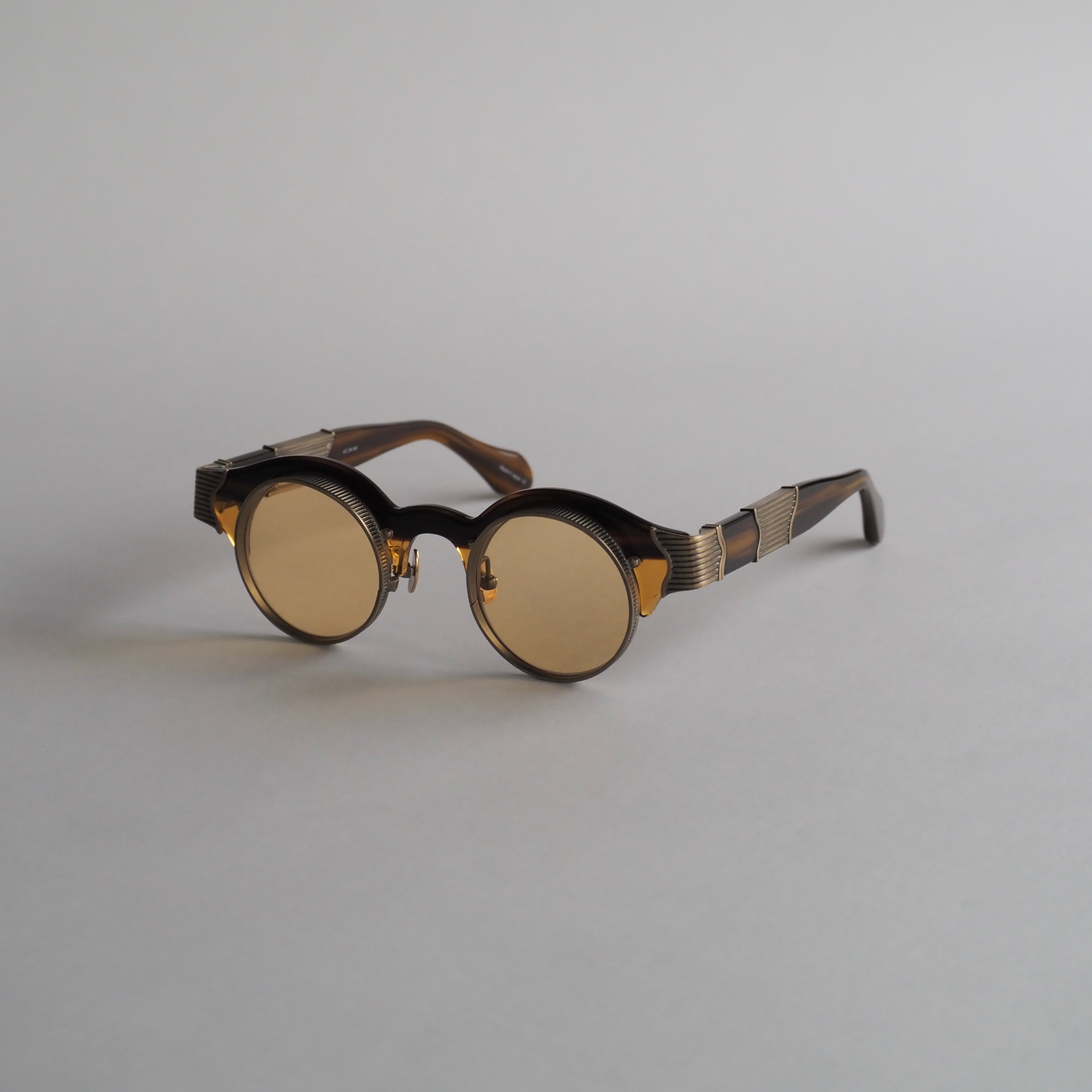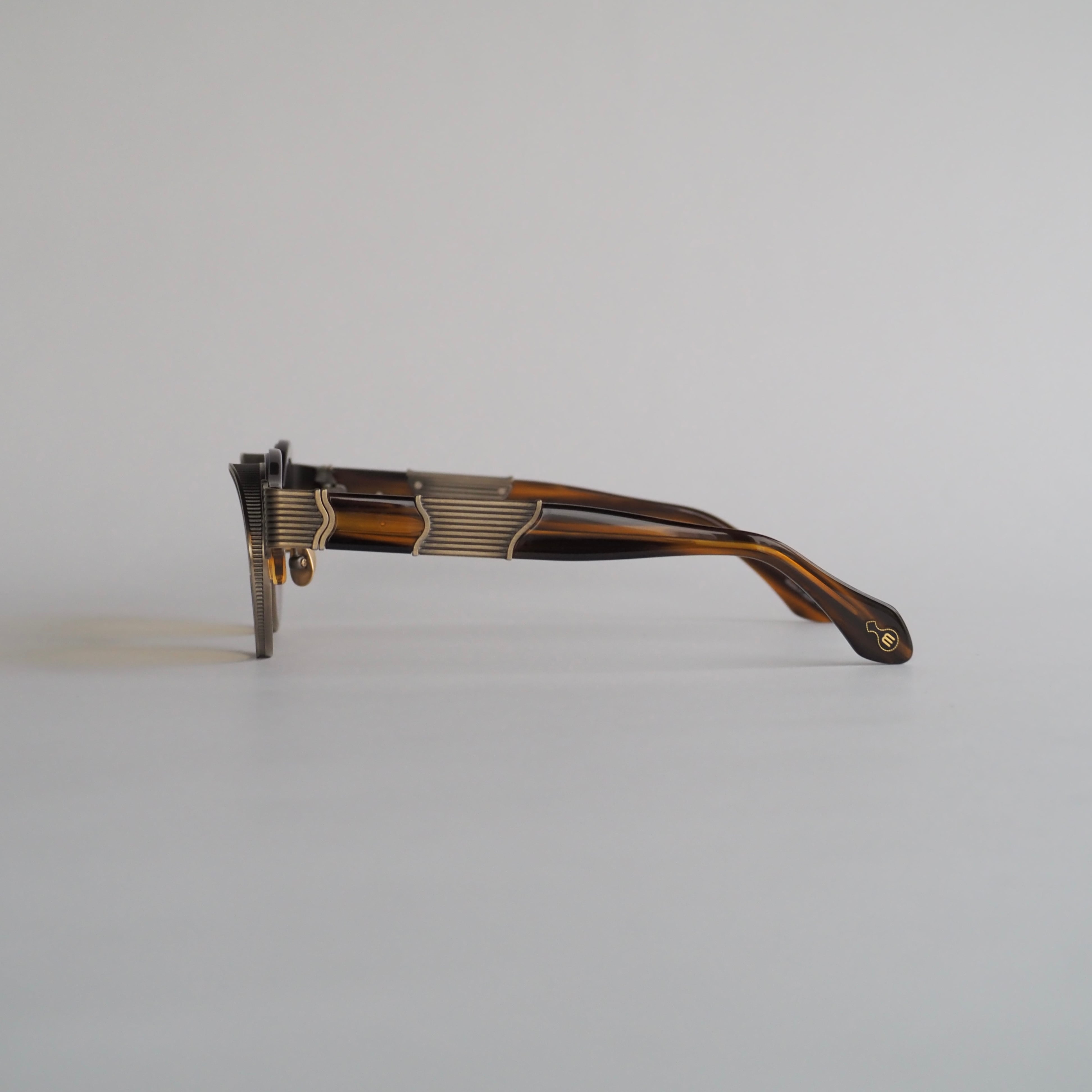 フロントは鼈甲柄のブラウンのアセテートと落ち着いたクリアオレンジのアセテートを組み合わせたツートンカラー。
