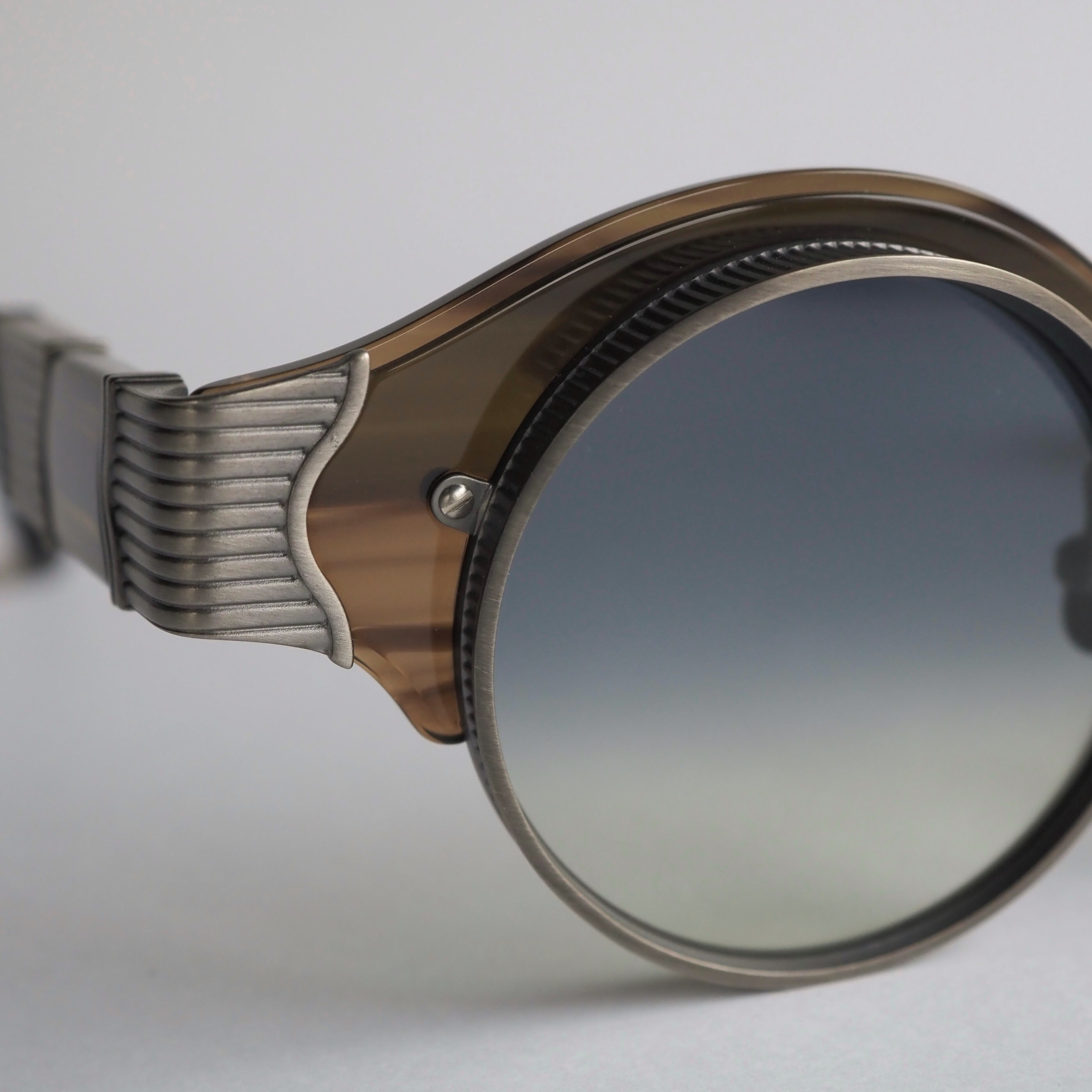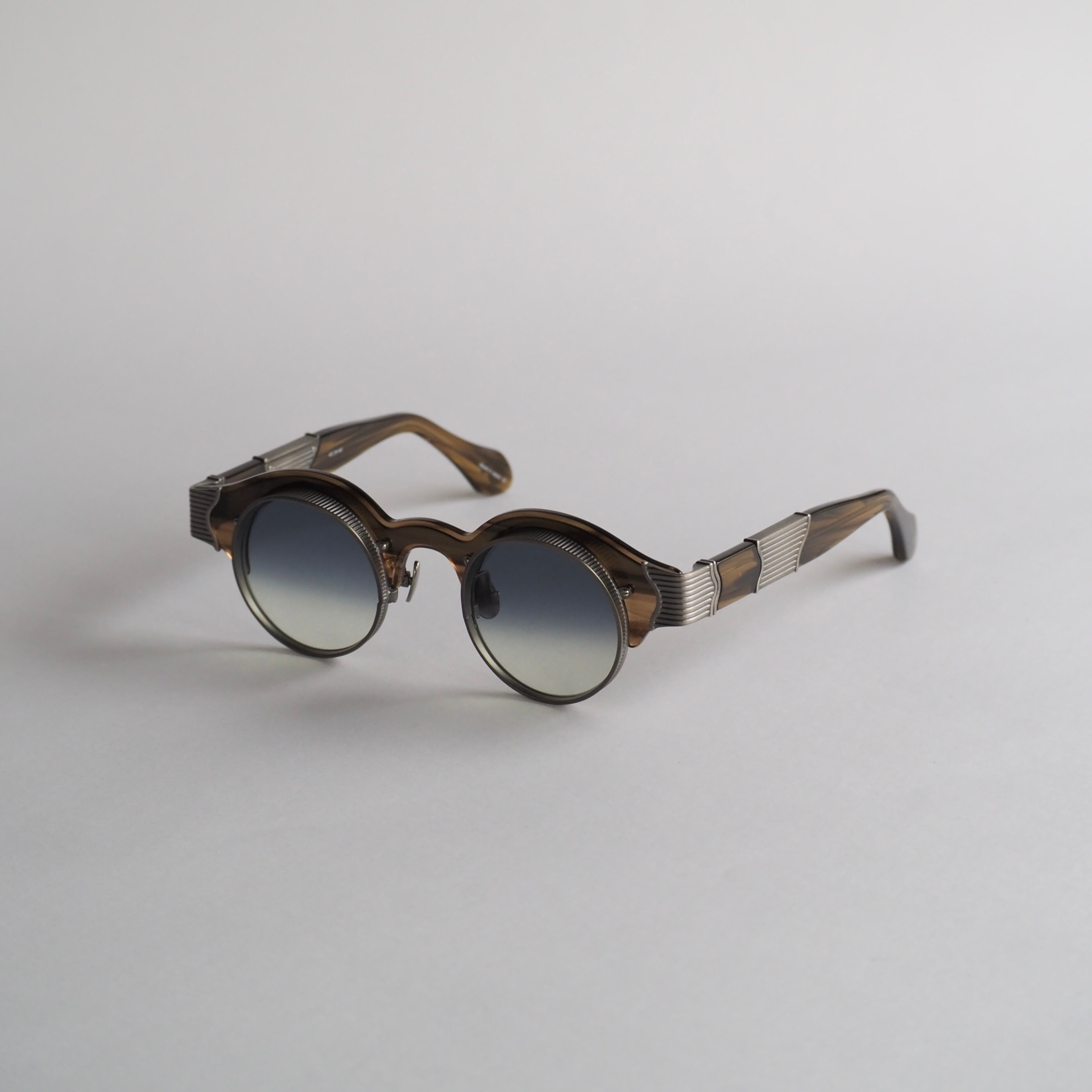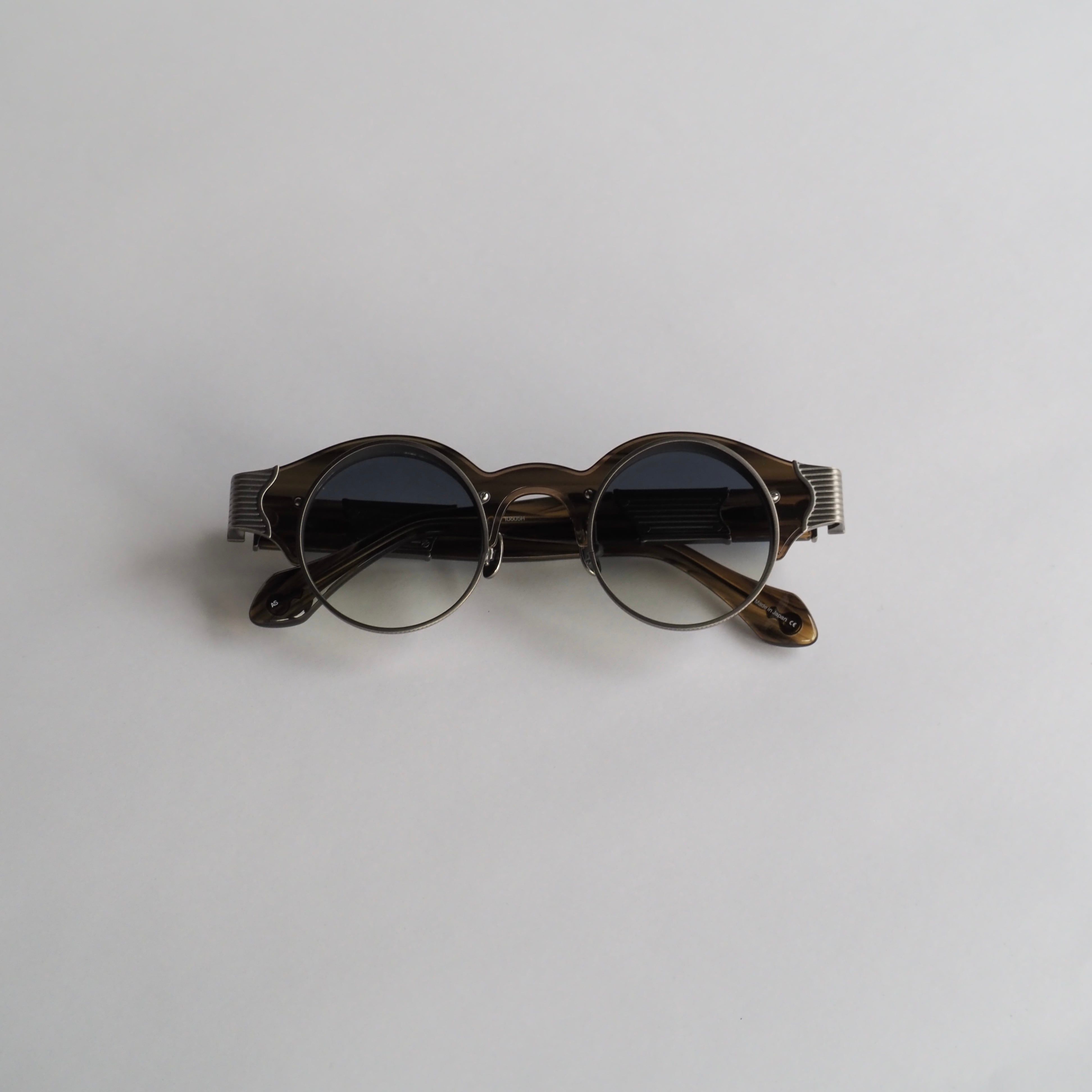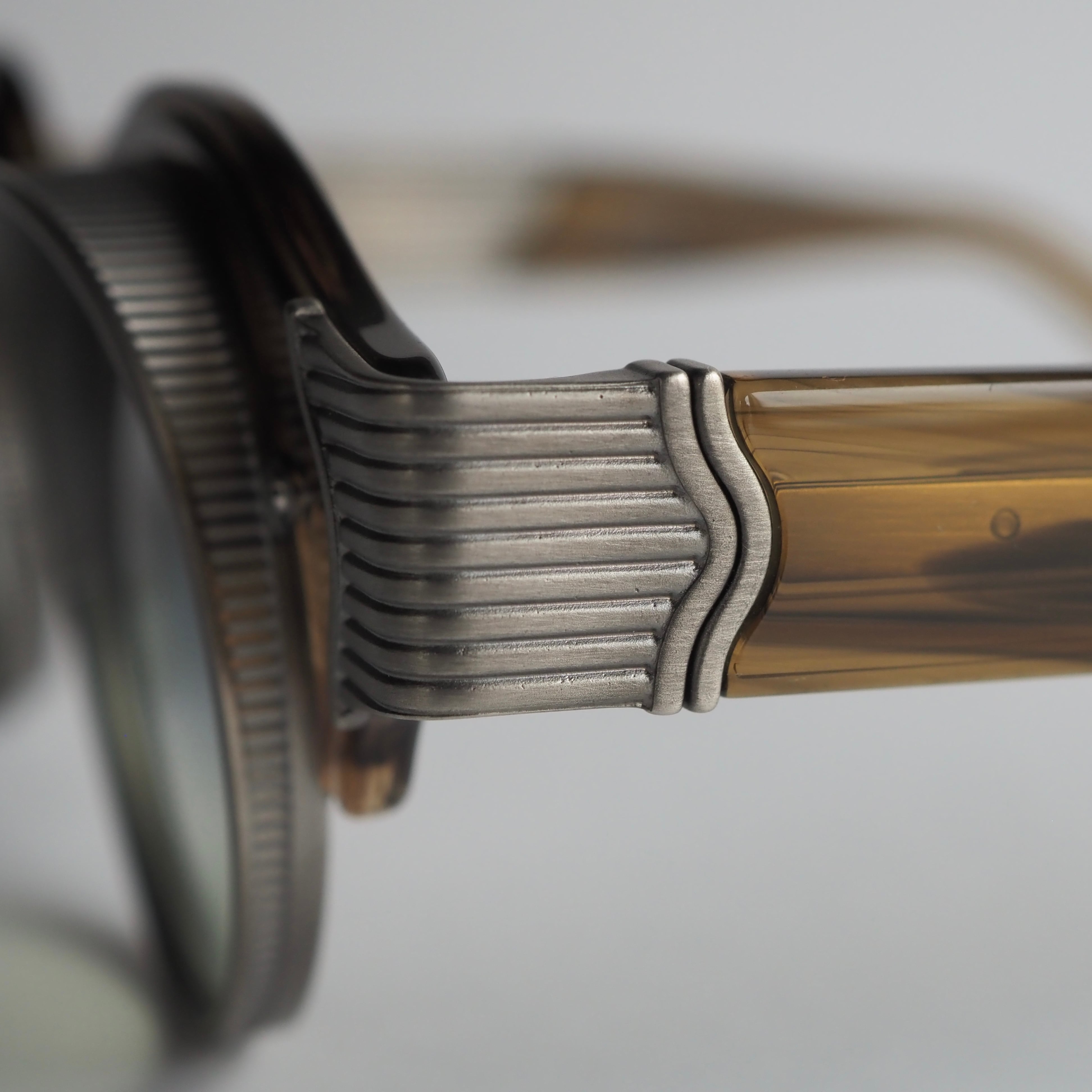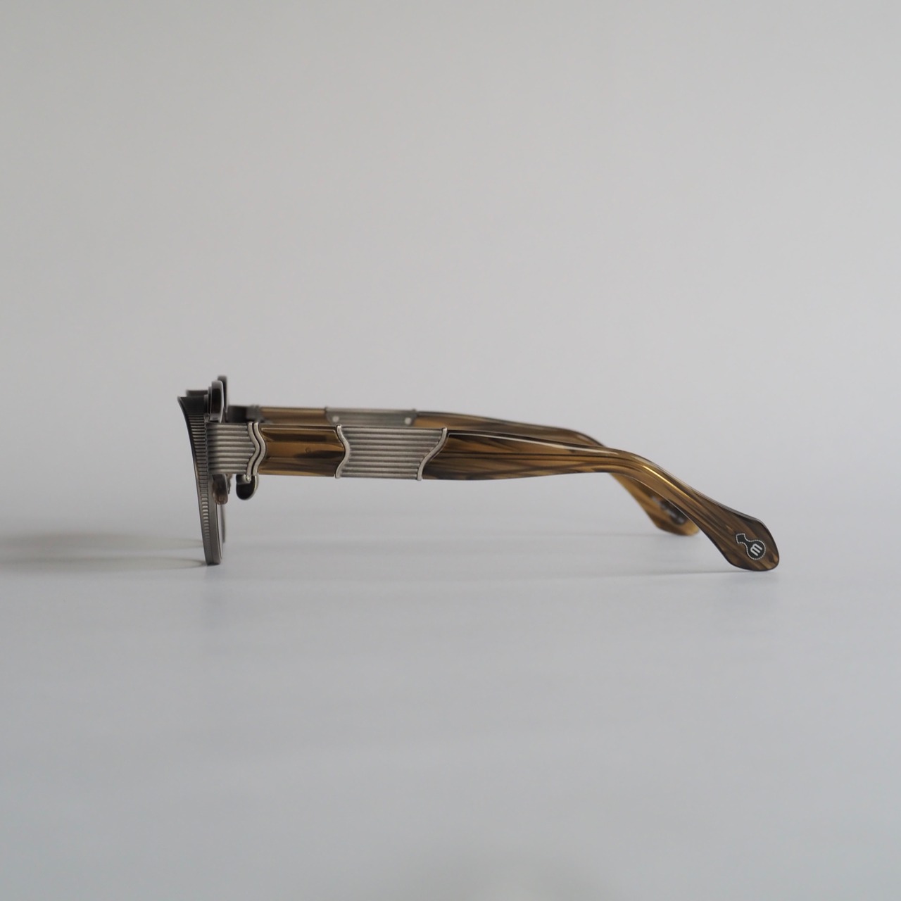 淡いブラウンのアセテートにアンティークシルバーのメタルパーツがクラシックで落ち着いた印象を演出しています。