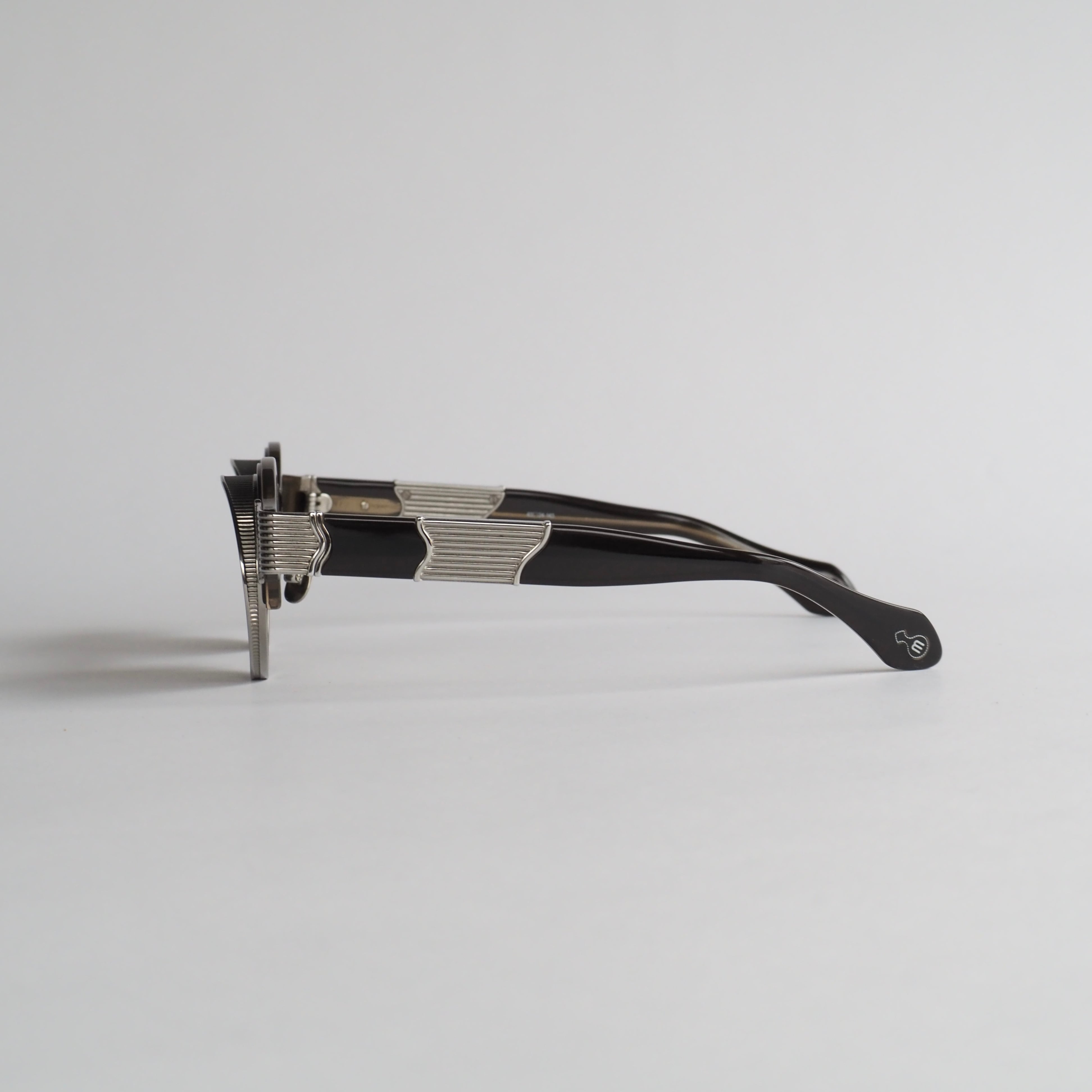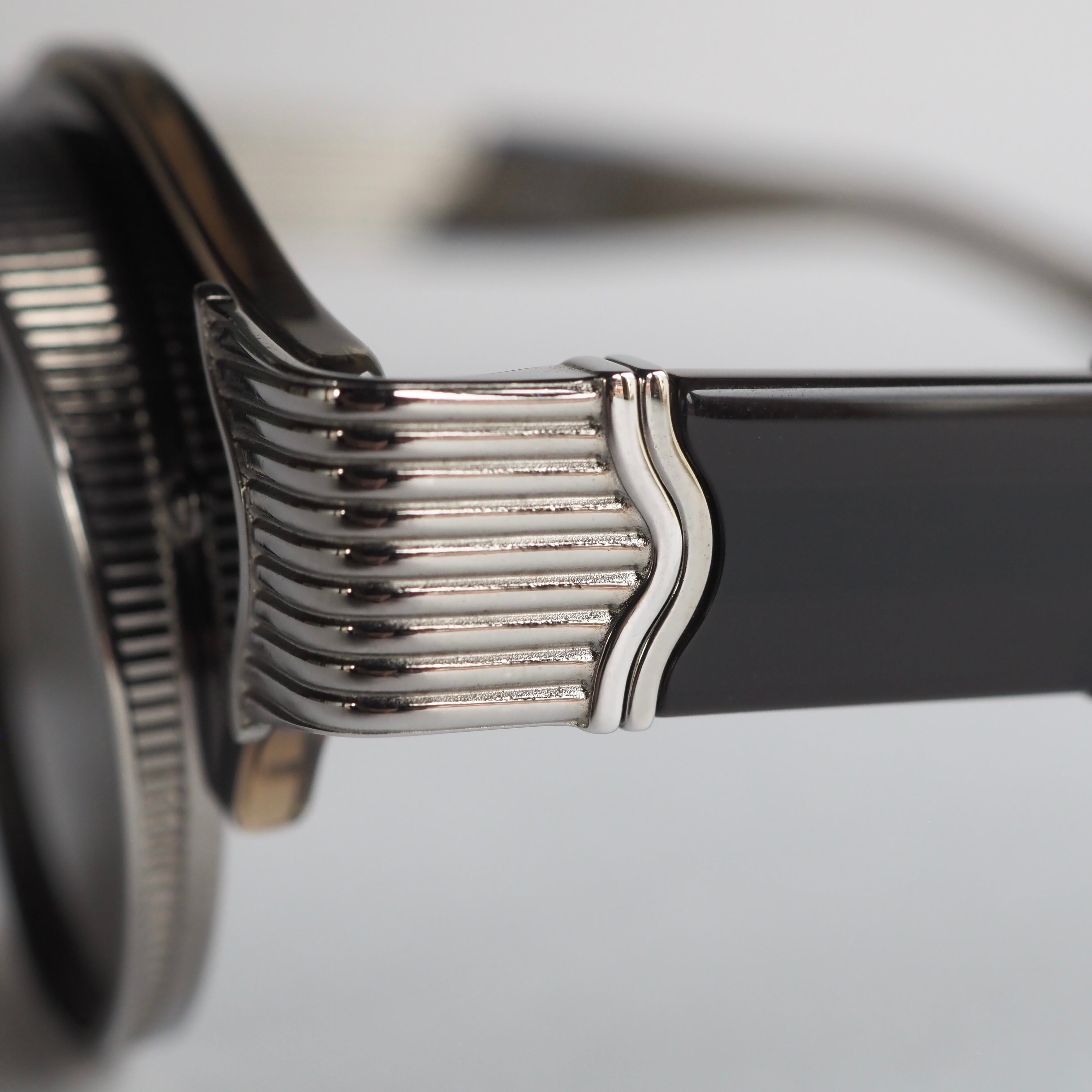 このフレームで一番の特徴である上部が大きく前に出ている大胆なメタルリムは、1920年代のクラシックカーのヘッドライトからインスピレーションを受けてデザインされています。