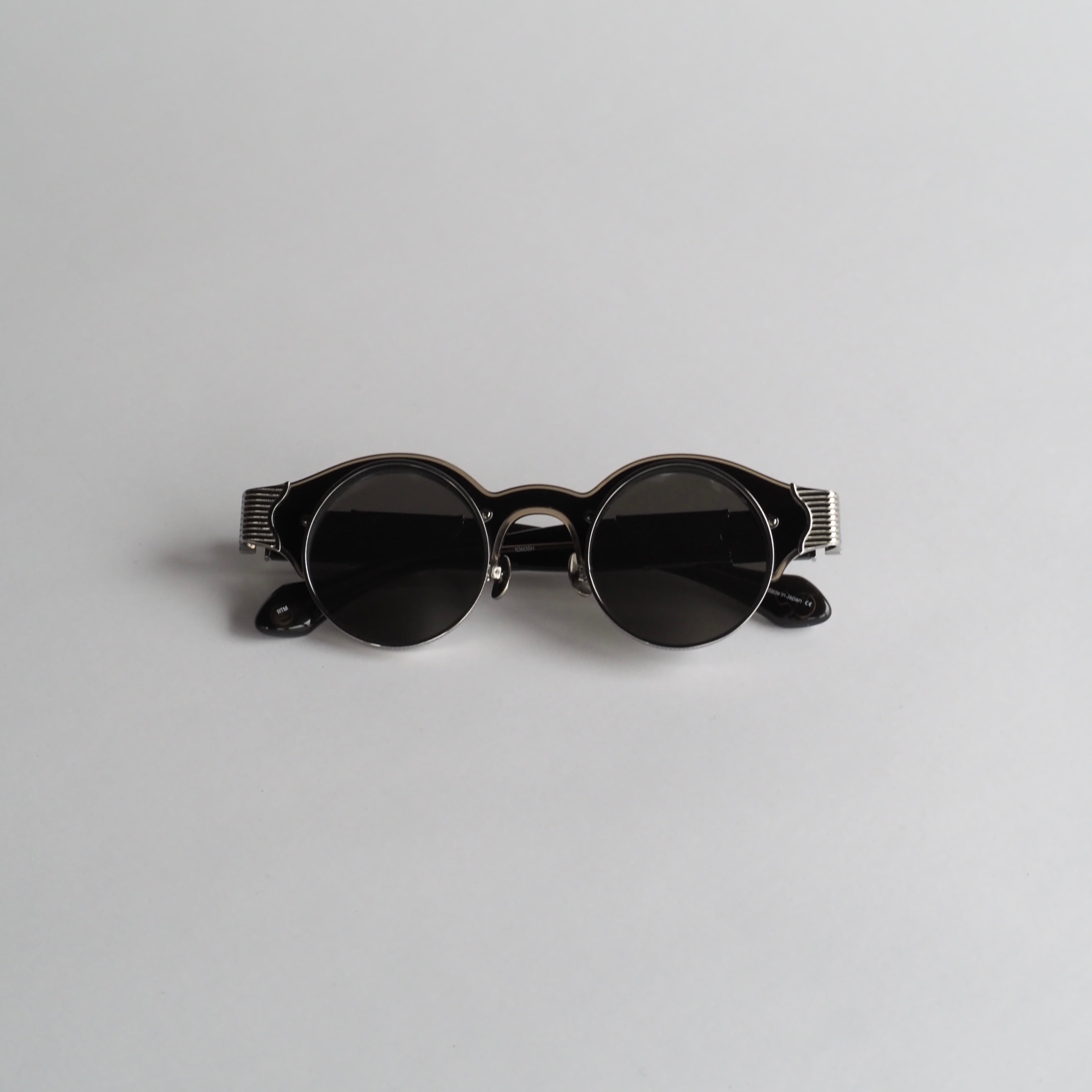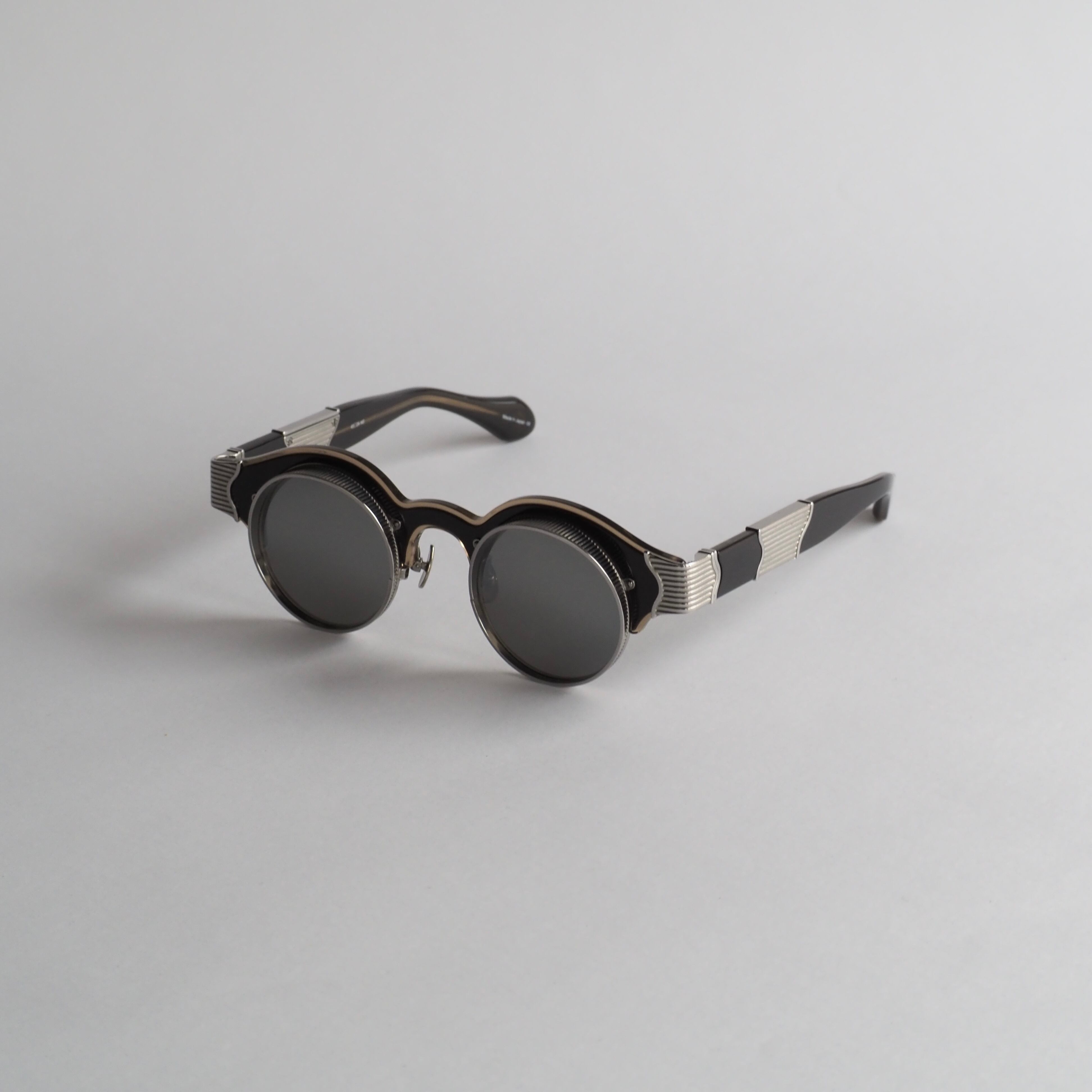 ラウンド型のレンズシェイプで、日本製アセテートと精巧なメタルディテールが組み合わさるコンビネーションフレーム。