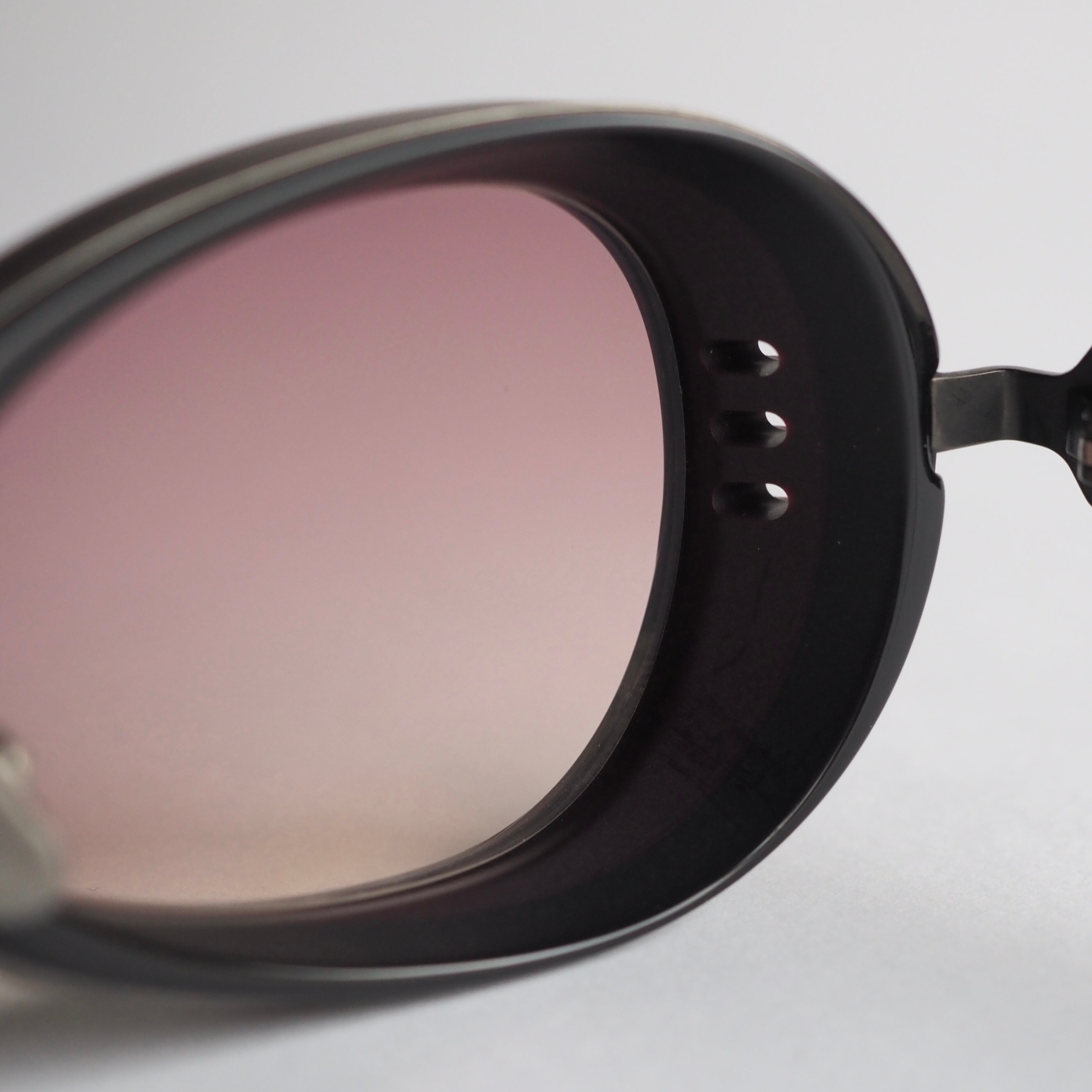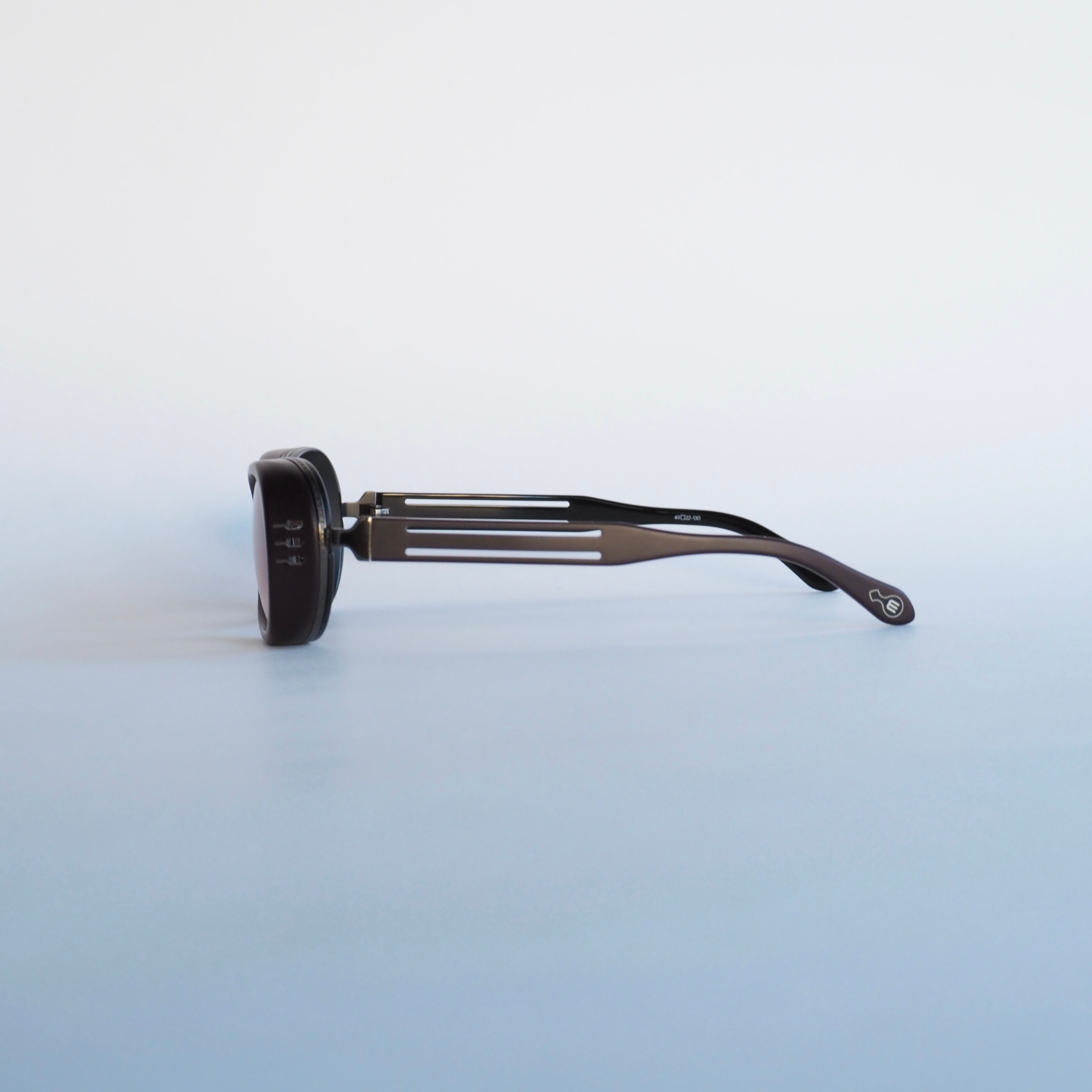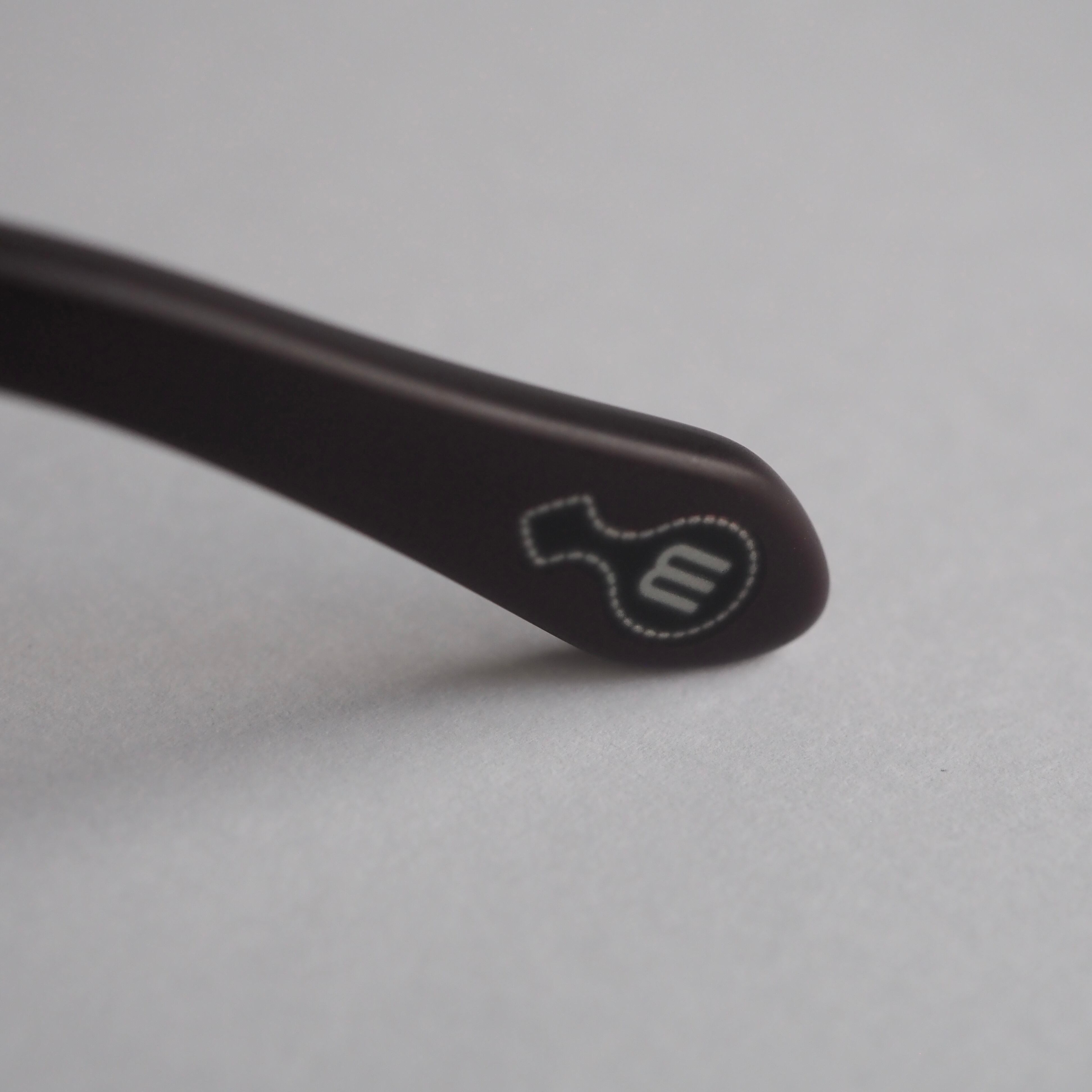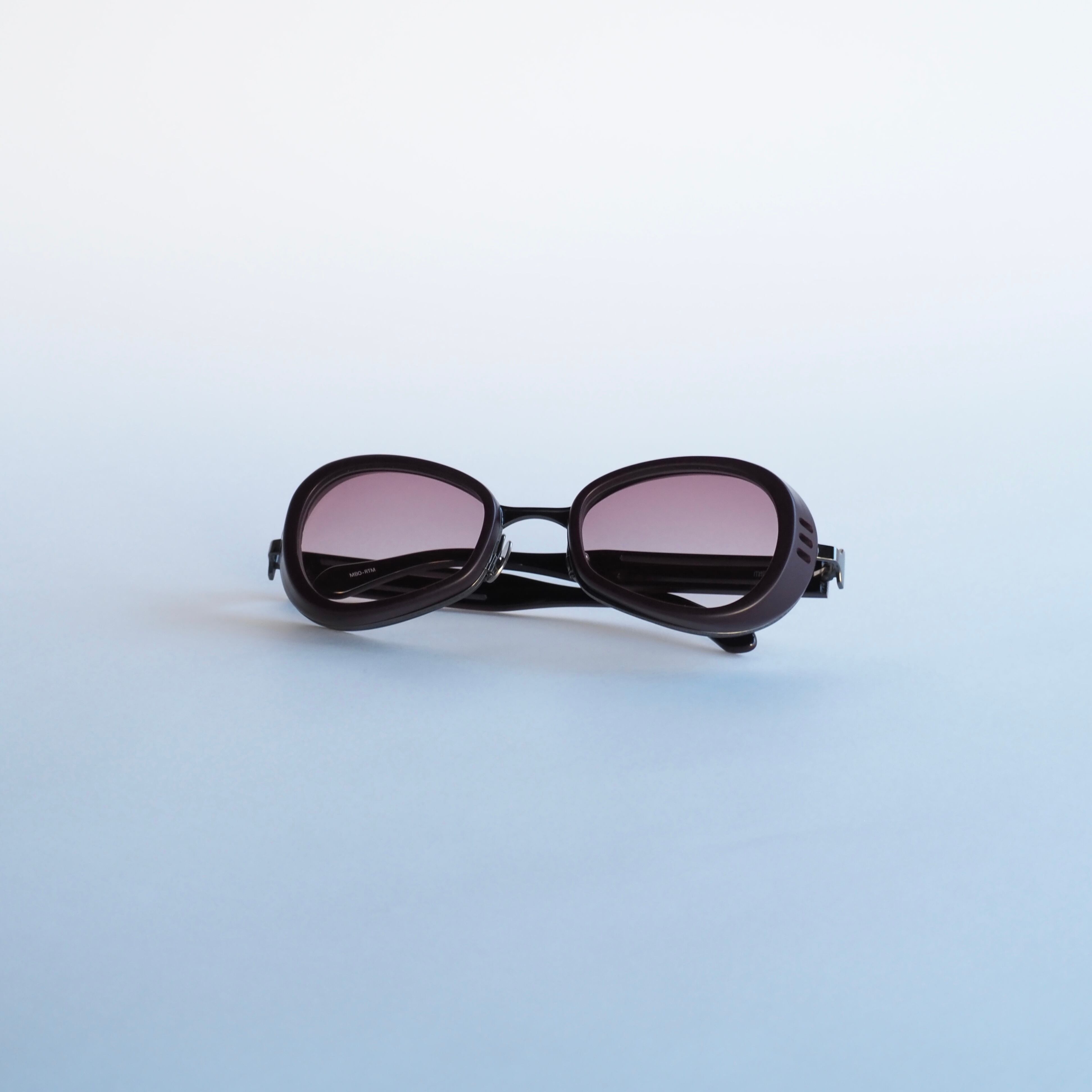 オーバルをベースに目尻に向かい広がるユニークなレンズシェイプと、厚み15mmにも及ぶ特徴的なフロントの風貌は圧倒的な存在感を放っています。