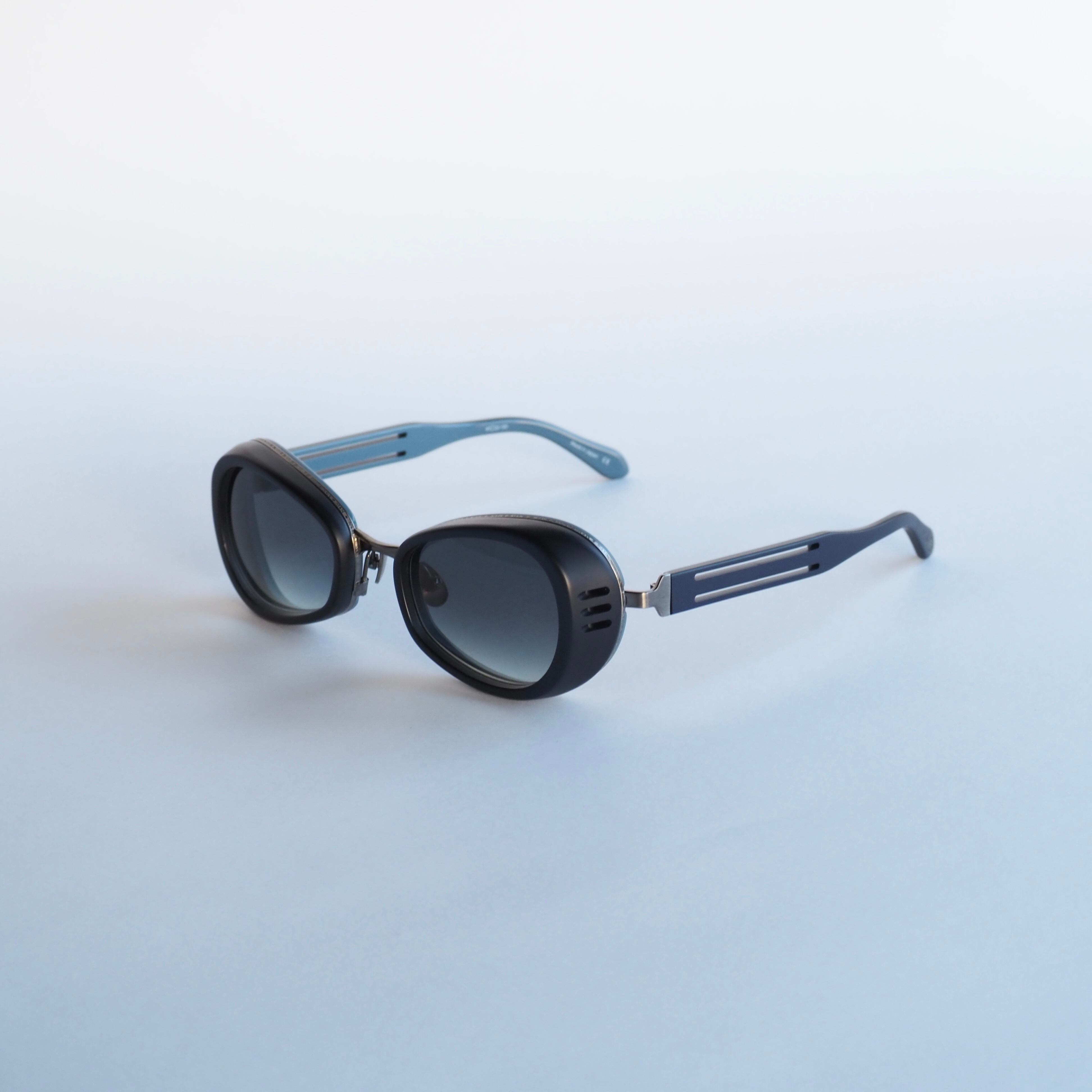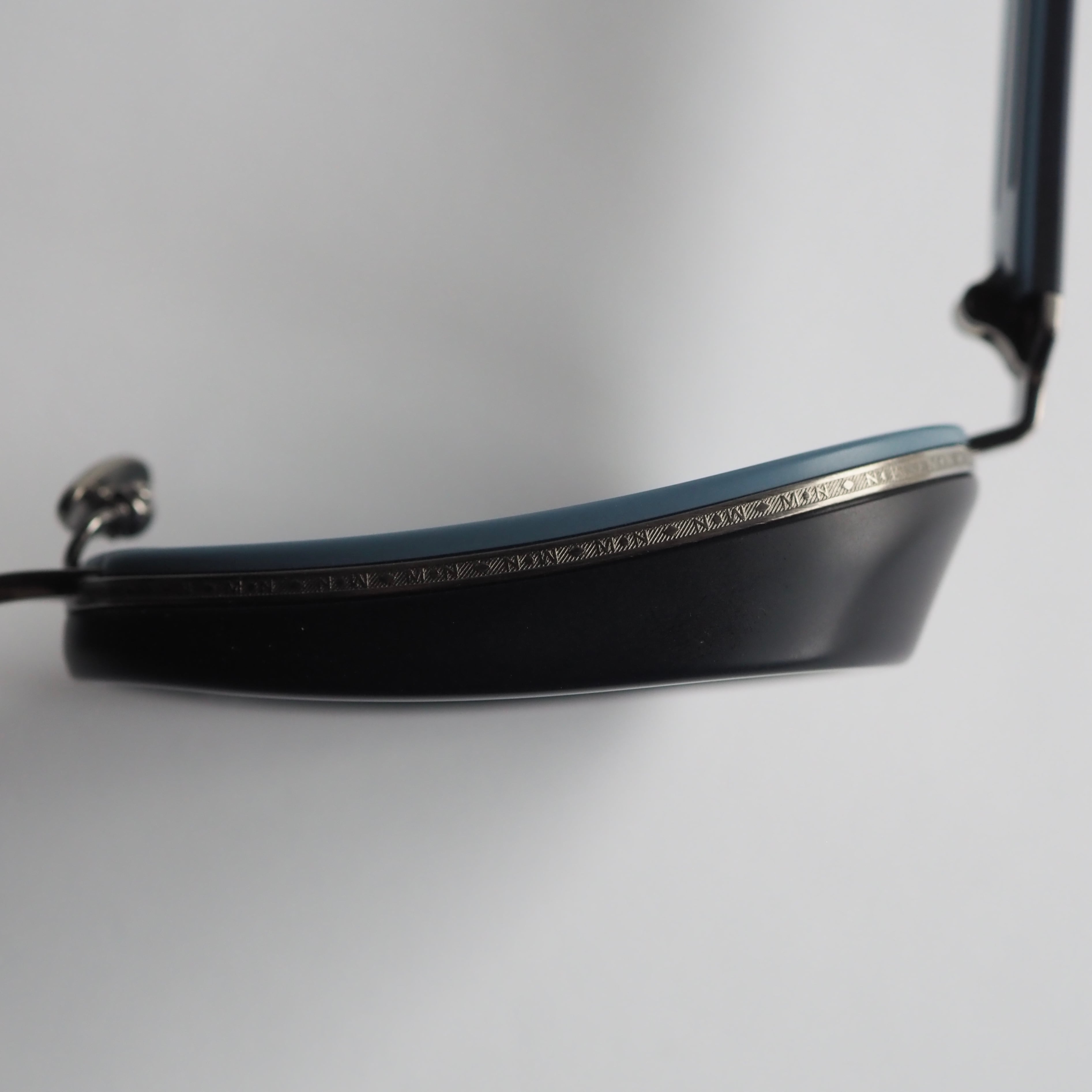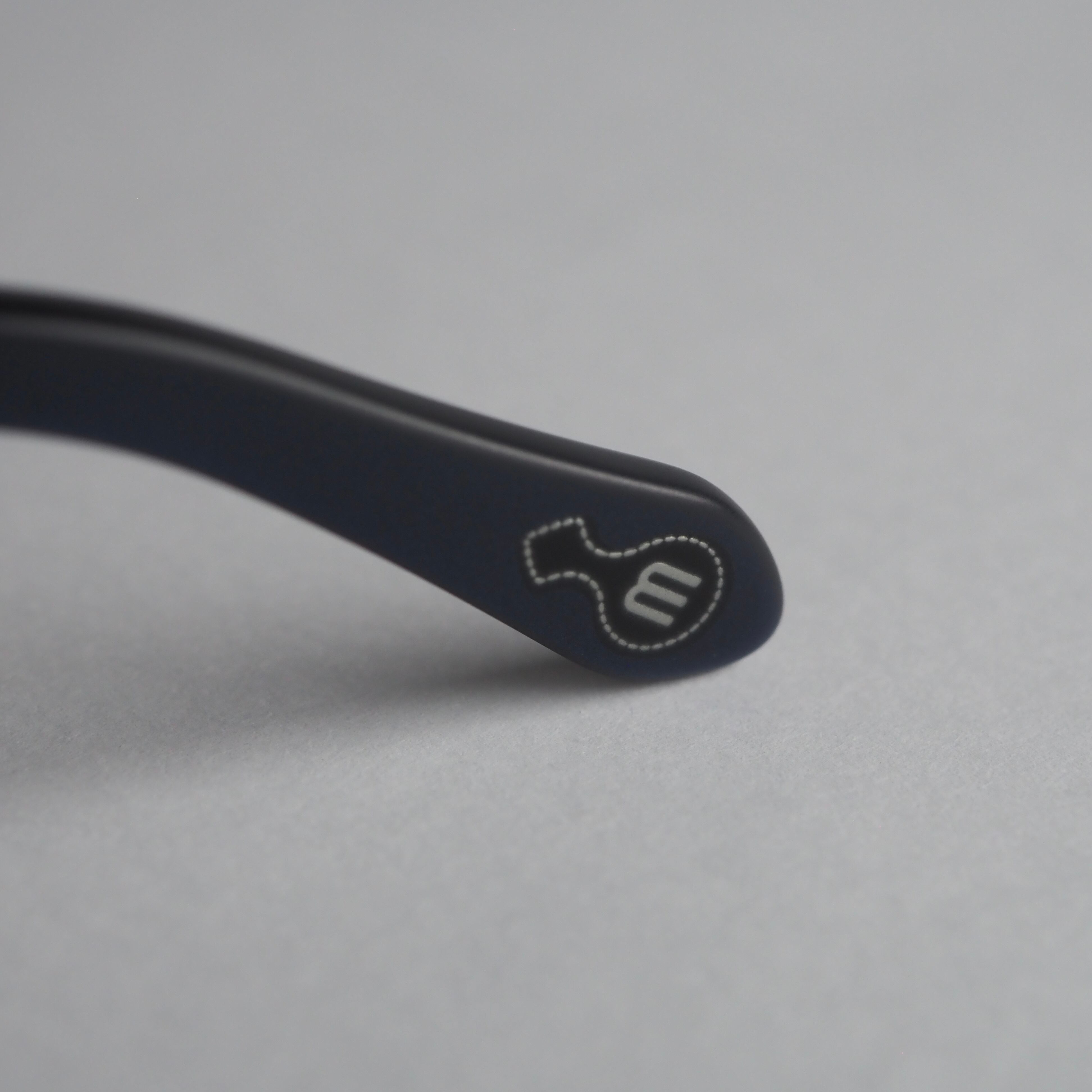 表面がマットに仕上げられたフレームの内側・外側、レンズはそれぞれネイビーカラーの同系色でまとめられ、調和の取れたシックな雰囲気を演出しています。