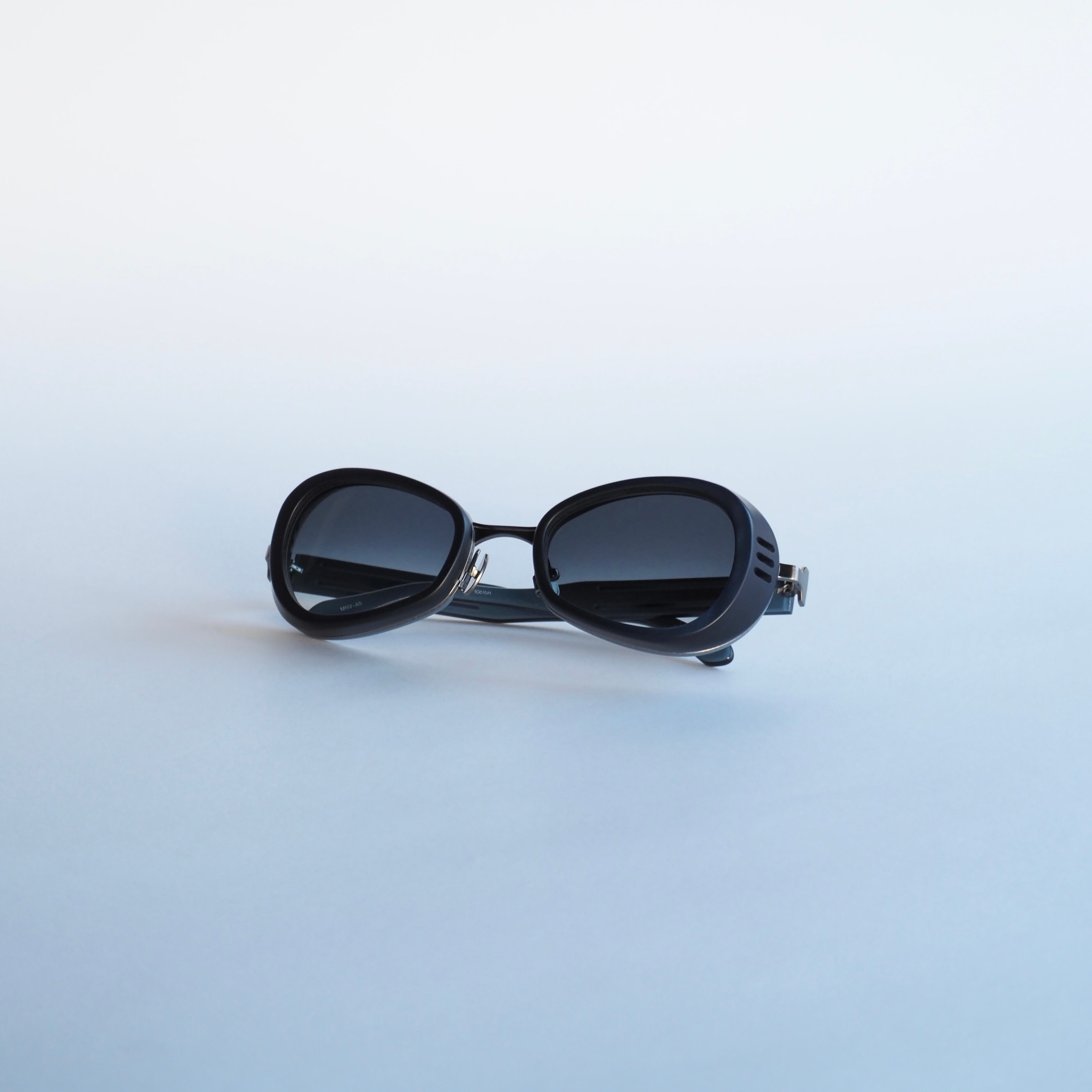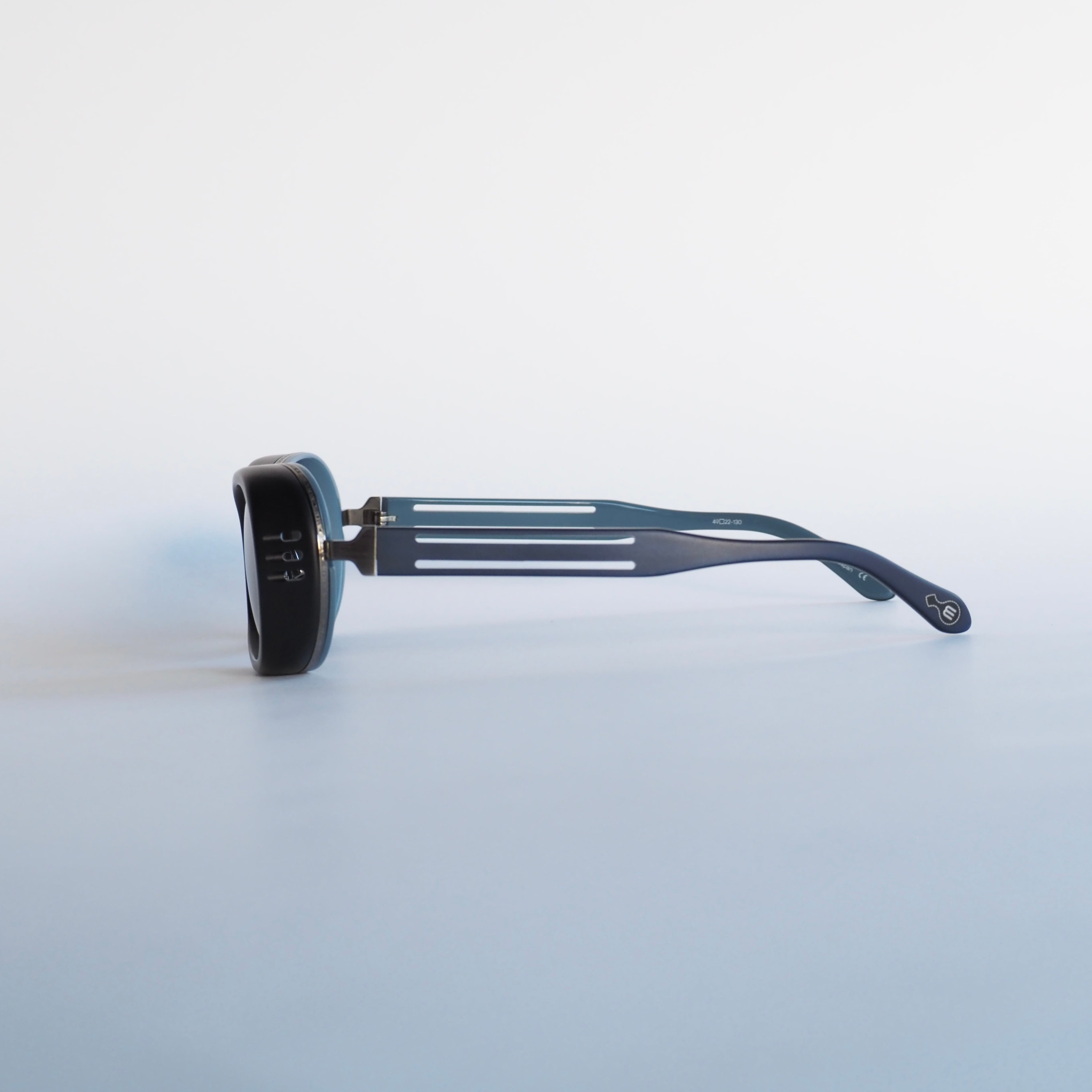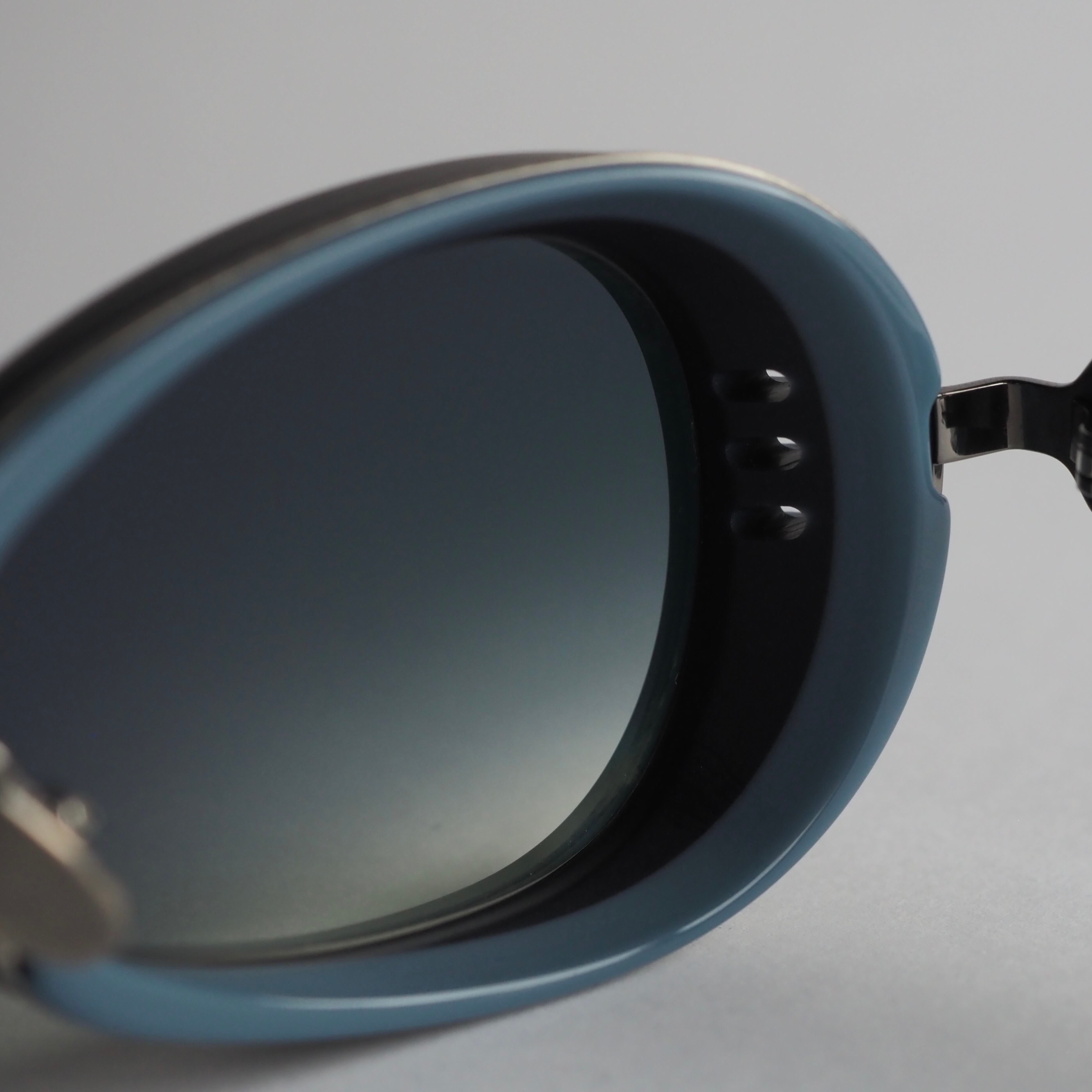 表面がマットに仕上げられたフレームの内側・外側、レンズはそれぞれネイビーカラーの同系色でまとめられ、調和の取れたシックな雰囲気を演出しています。