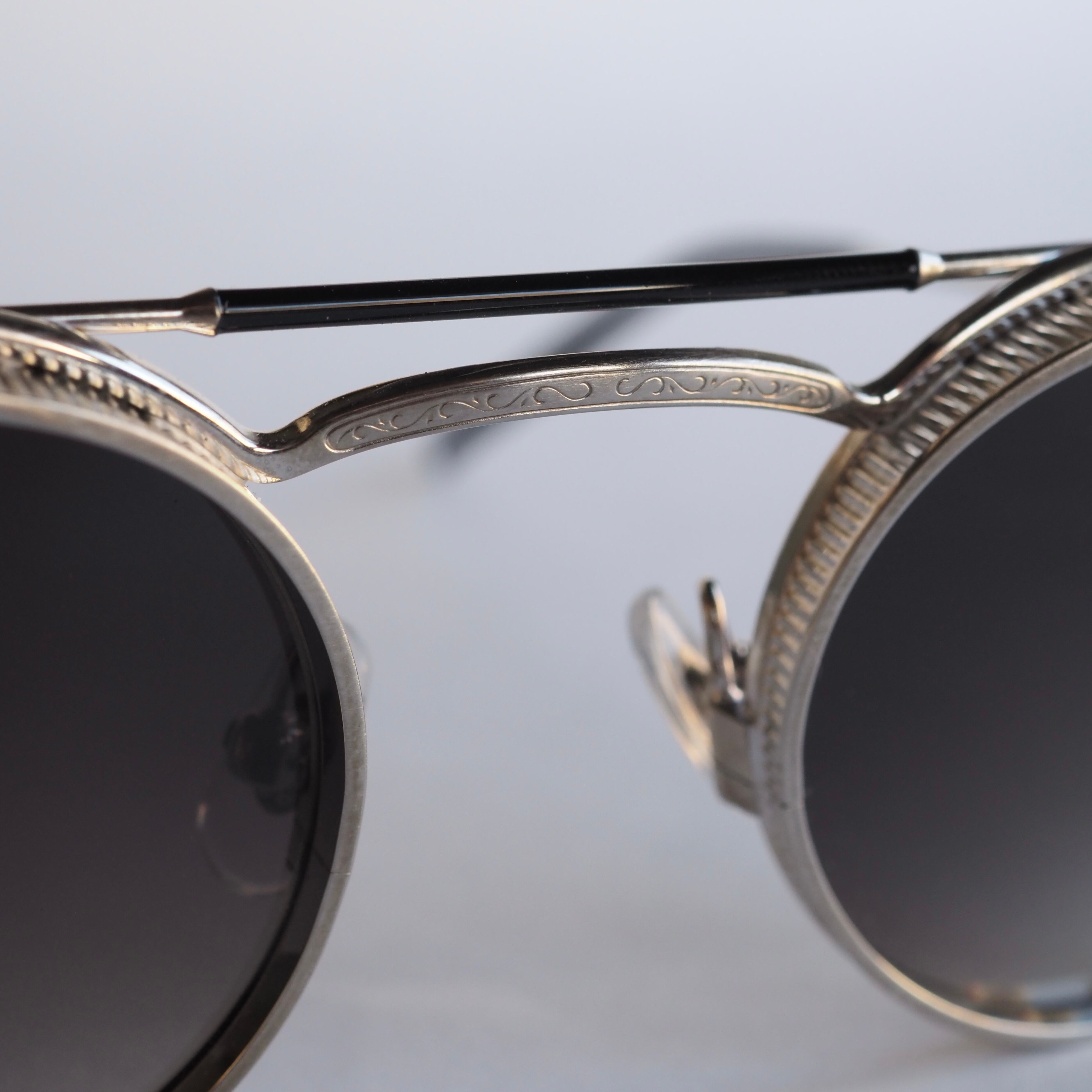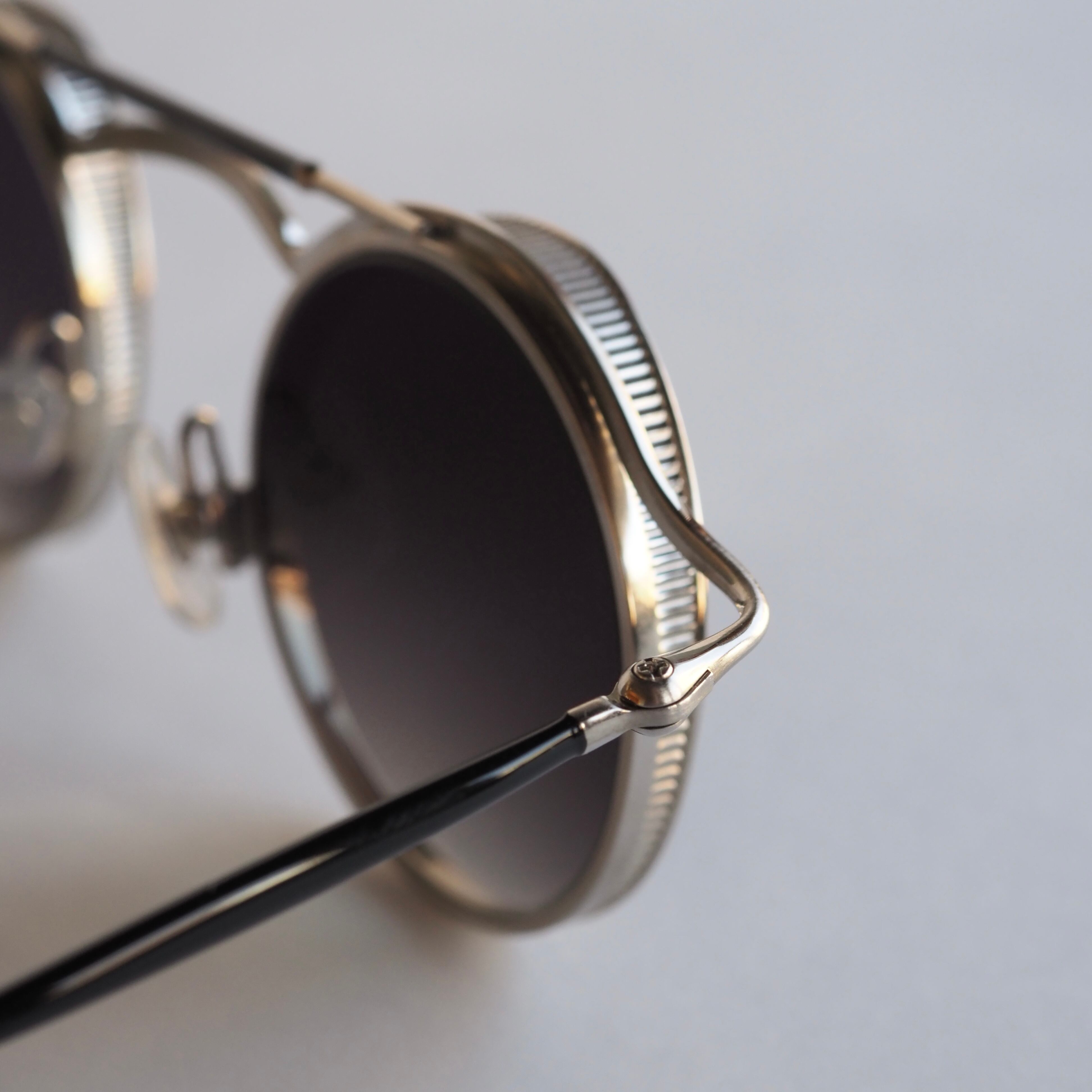 このフレームで一番の特徴である上部が大きく前に出ている大胆なメタルリムは、1920年代のクラシックカーのヘッドライトからインスピレーションを受けてデザインされています。