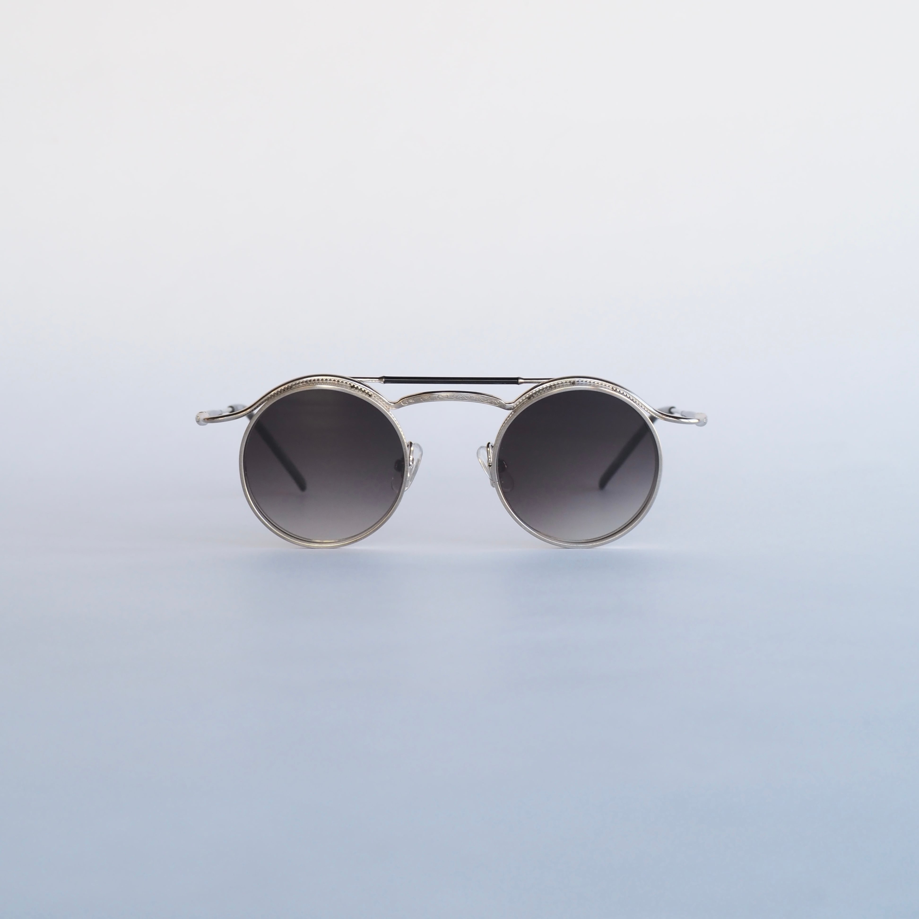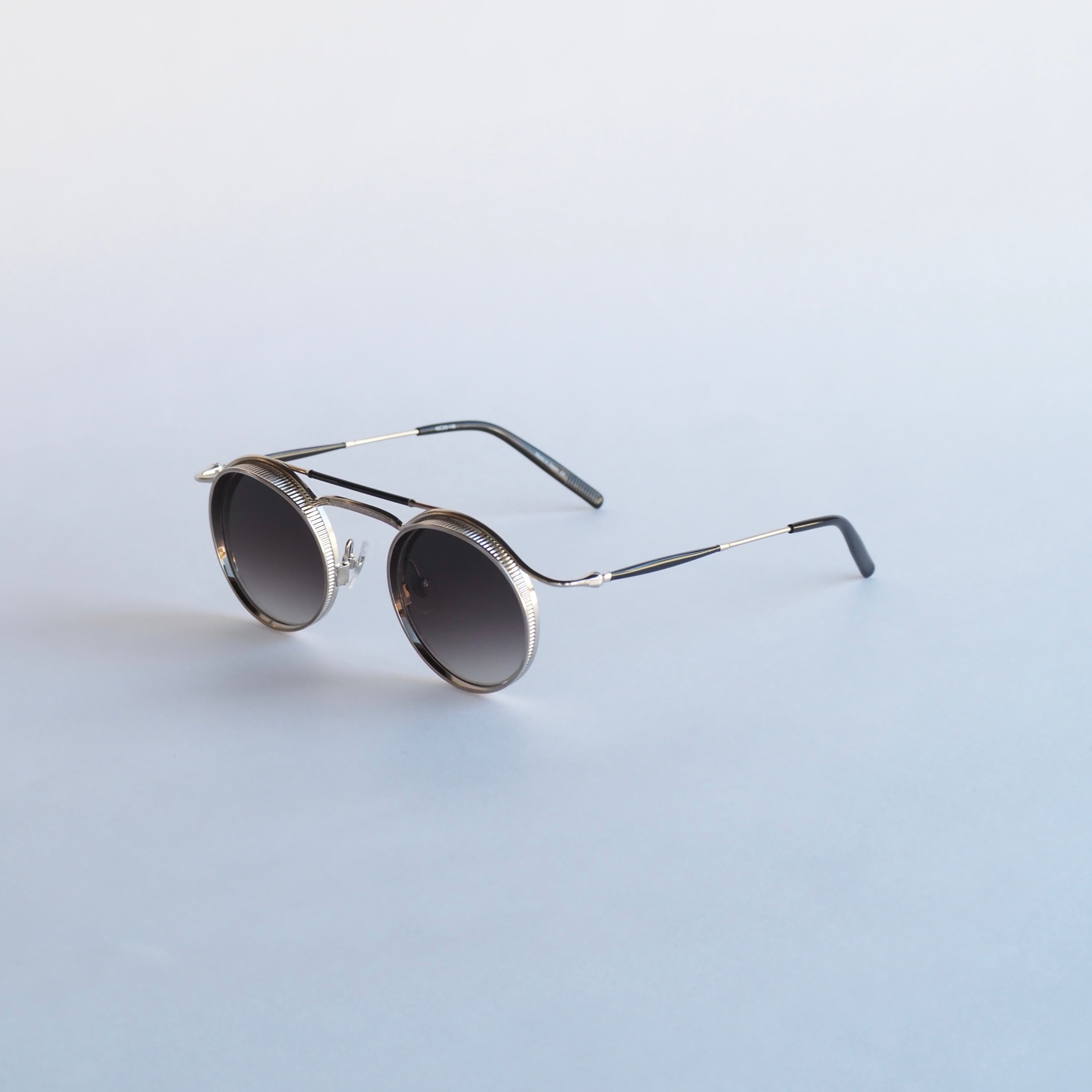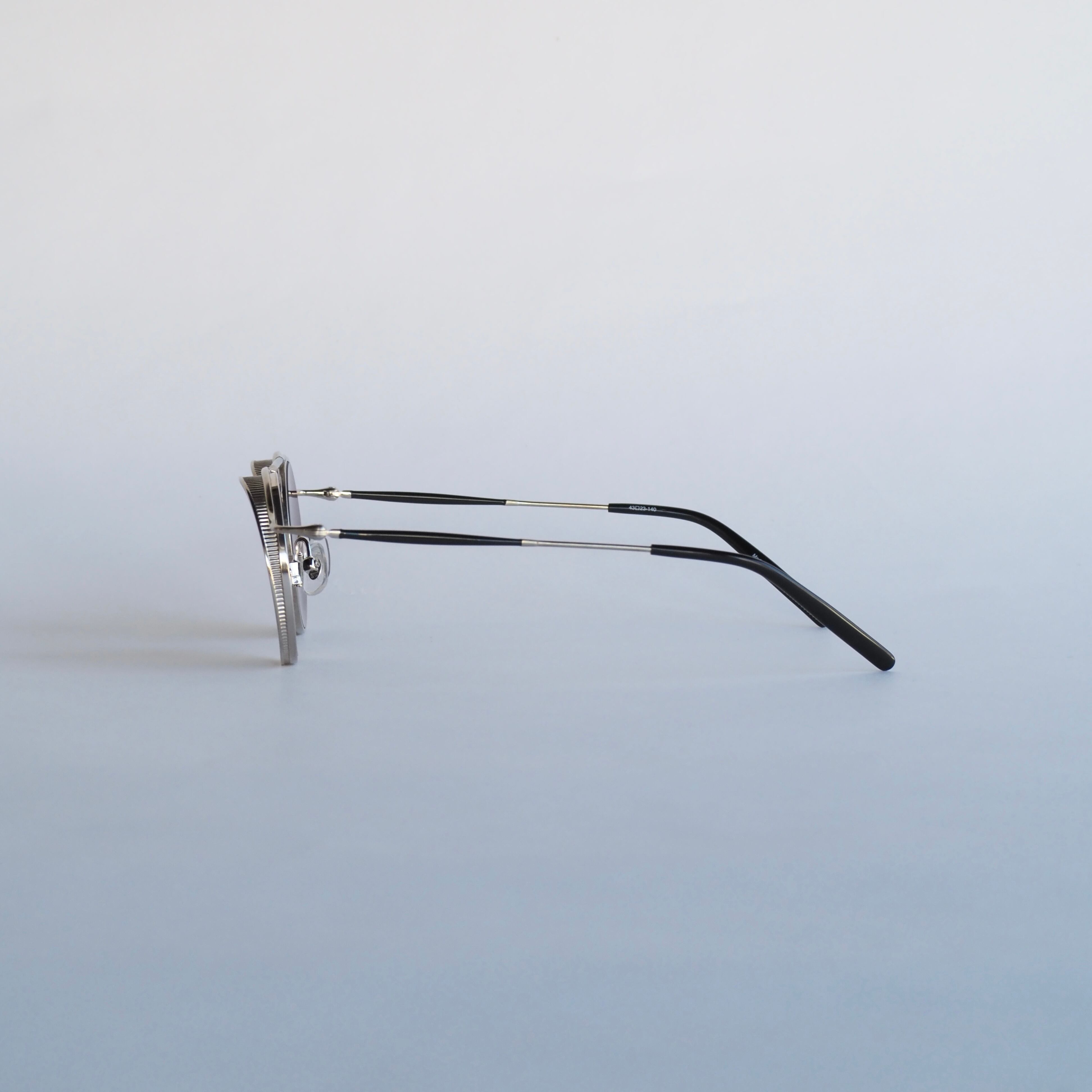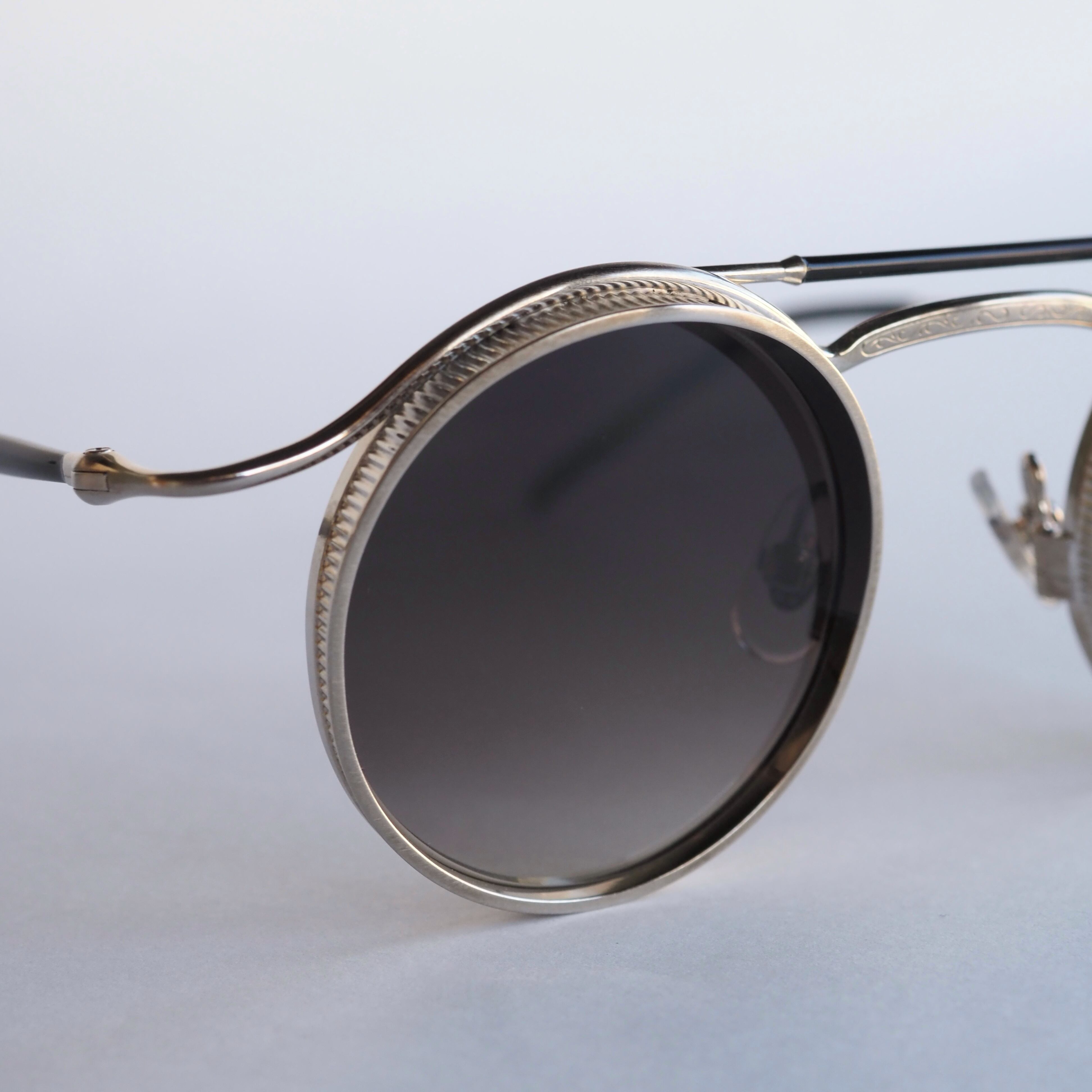 ラウンド型のレンズシェイプで、精巧なメタルディテールが光るメタルフレーム。